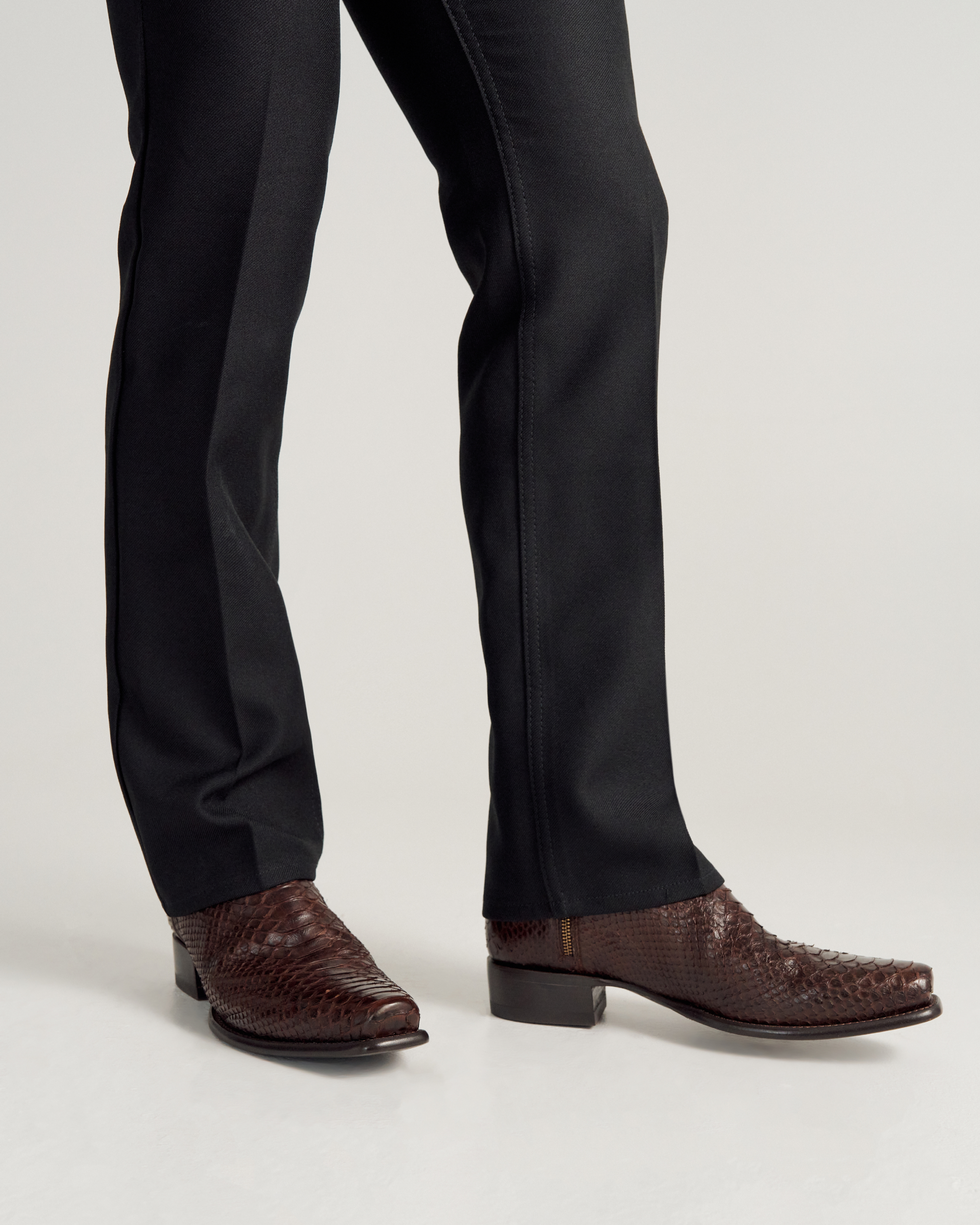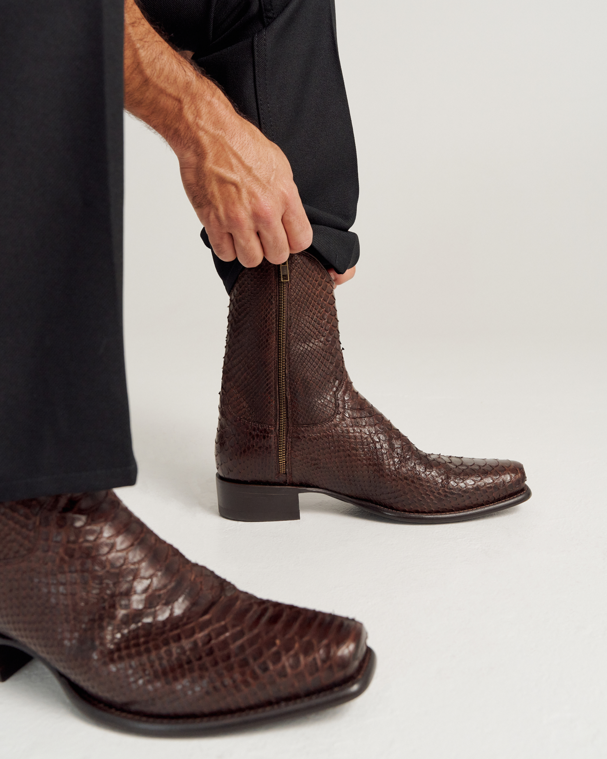 Meet The Jack — a top-to-toe back cut python boot that demands attention. With an 8" shaft and 1.25" heel, every scale catches the light differently, revealing depth and subtle tones that make each pair unmistakably one of a kind. Fearless, bold, and built for those who make an entrance, The Jack is for seasoned python lovers or anyone ready to take the leap.