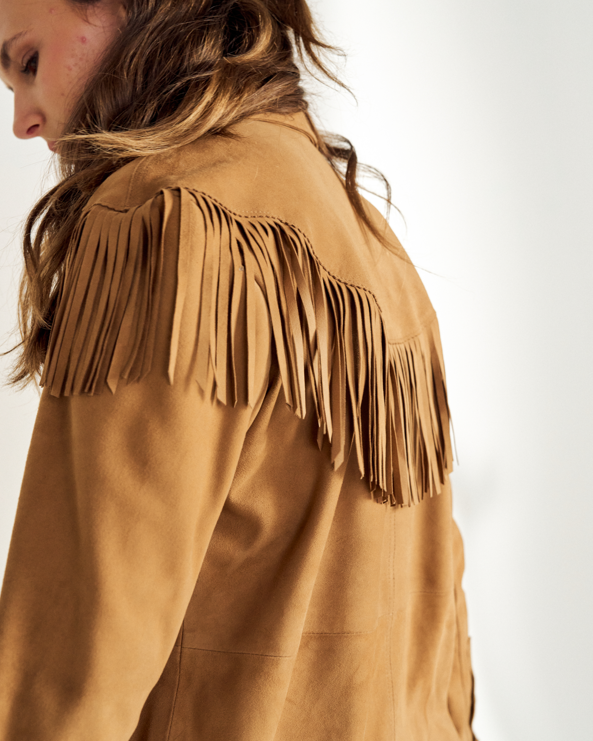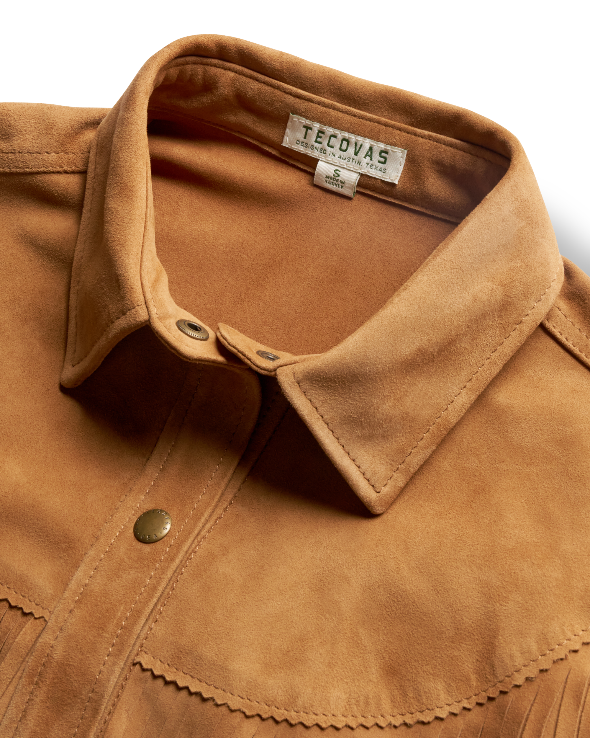 Our Women’s Suede Shacket is luxurious outerwear that feels as good as it looks. Made from soft goat suede with vintage-inspired fringe accents framing both the front and back yokes — pair it with the Women’s Suede Mini Skirt for a refined top-to-bottom ‘fit that’s fit for Western royalty.