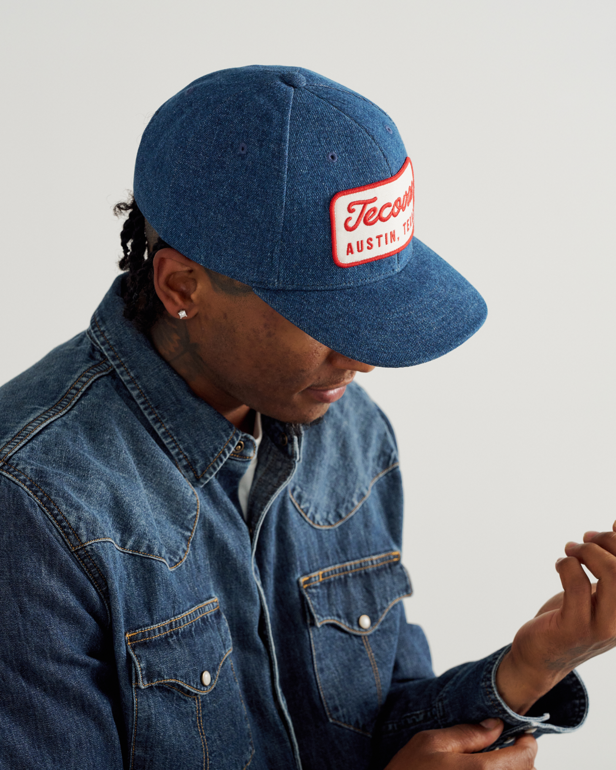 This mid-crown, six-panel hat is crafted from denim and stamped with Tecovas Mechanic Patch across the front. The curved brim brings the shade, while an adjustable snapback keeps it riding just right.
