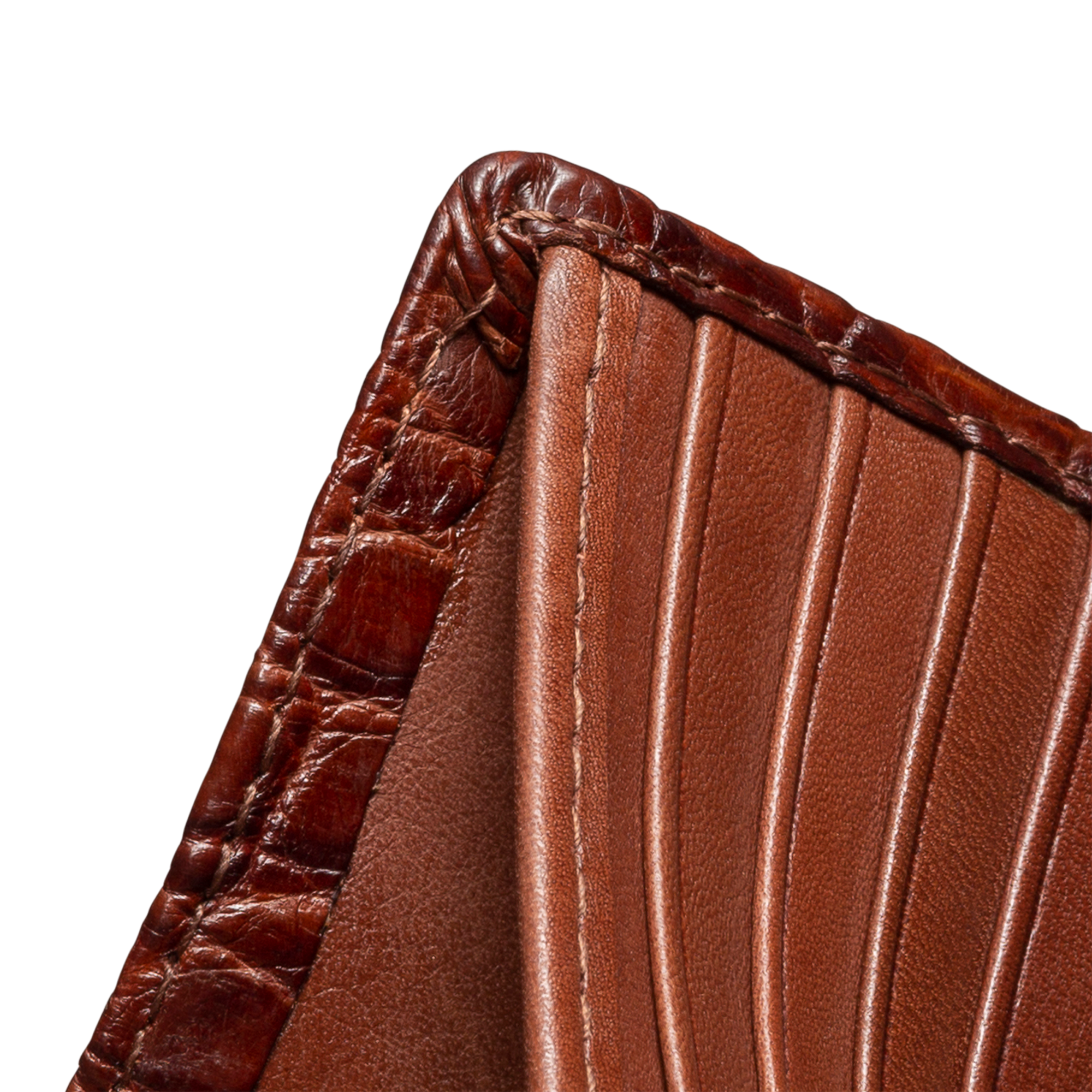 Handcrafted from the finest American alligator leather, our Billfold is the epitome of luxury and functionality. Its bi-fold design provides ample space for your cards, cash, and ID while maintaining a sleek, slim profile for effortless front- or back-pocket carry. Hand-stitched details and a debossed Tecovas logo add a touch of refined style, while the folded-edge construction ensures lasting durability. Available in two signature colors to perfectly complement your favorite boots and belt, this is more than just a wallet—it’s an investment in craftsmanship that stands the test of time.