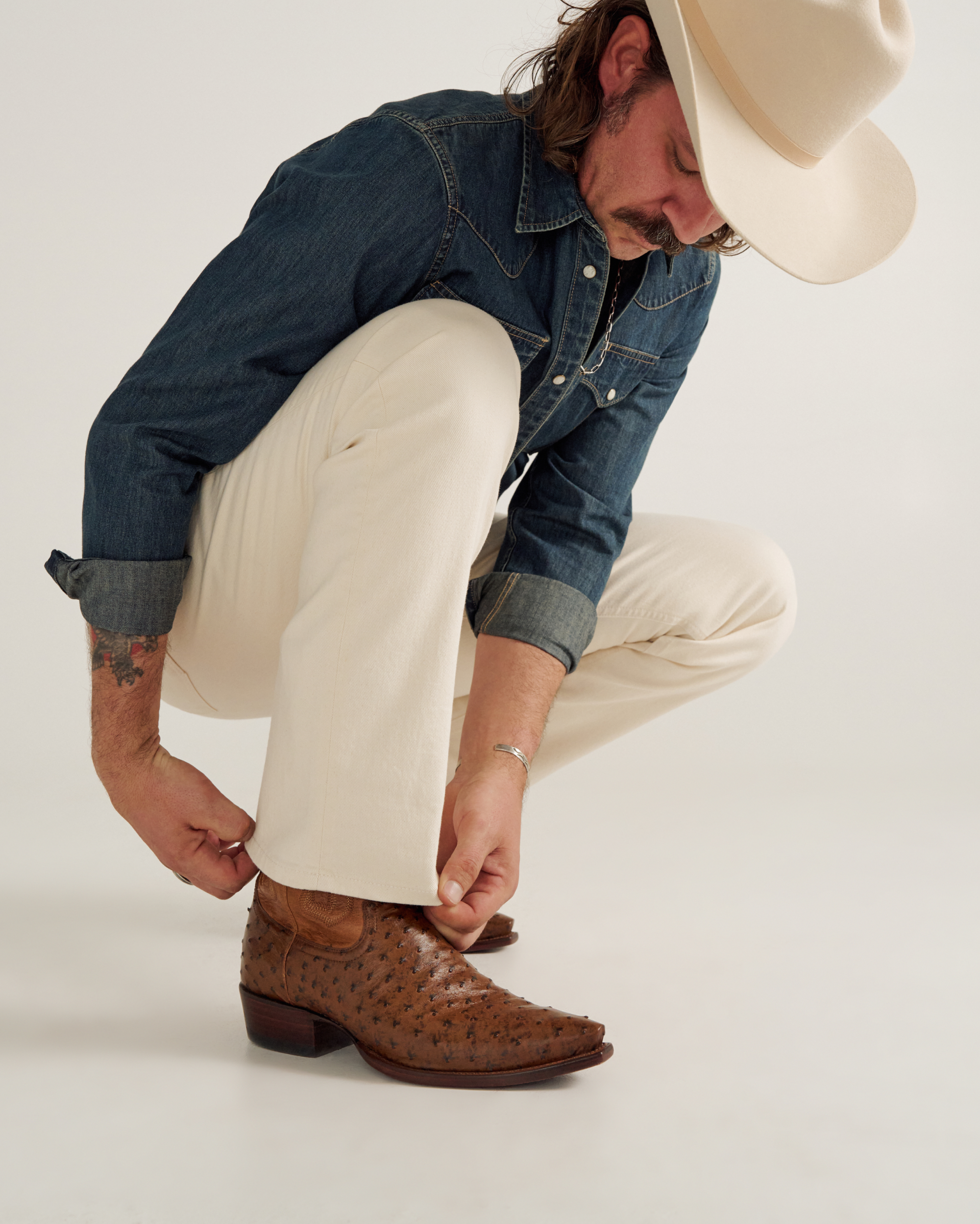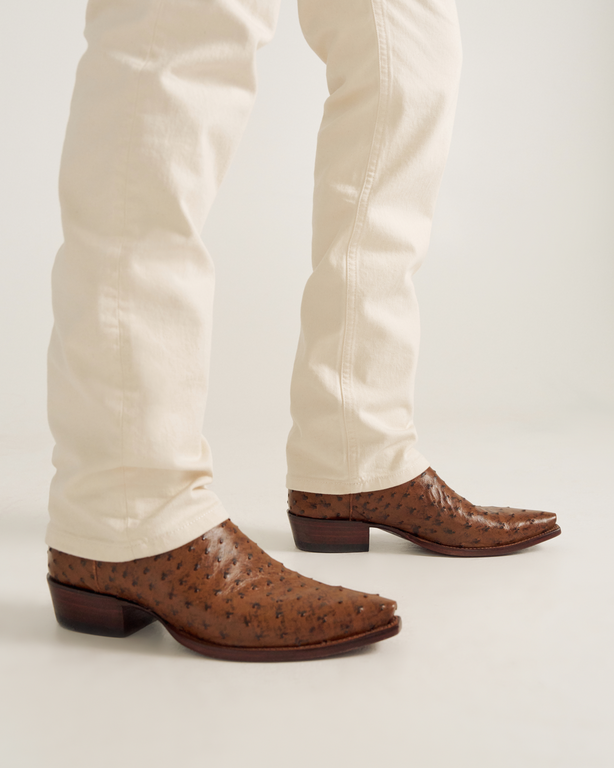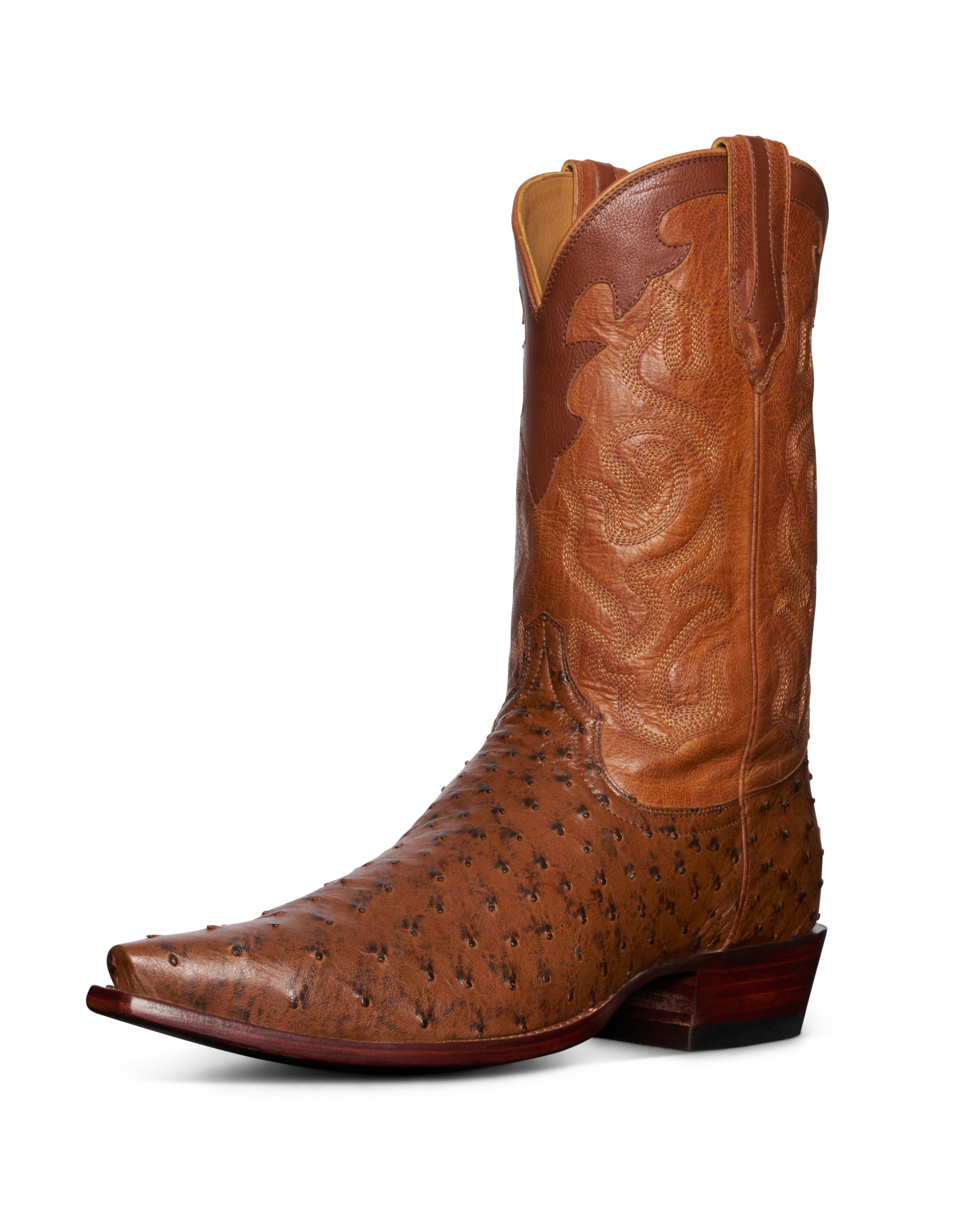 The Garrett is a snip-toe cowboy boot offered in quick-to-patina goat leather and quintessential full-quill ostrich. With design details from top to bottom, The Garrett is a handsome fella. A high standard for craftsmanship and creativity is set with our first collar and pull tab overlays and further emphasized by the intricate shaft stitching. In Cafe goat leather from top to bottom, The Garrett brings a rugged, classic sensibility to any outfit. Featuring a cowhide shaft, the full-quill ostrich version in a new color we call “Peanut”, will dress up denim and slacks night or day.