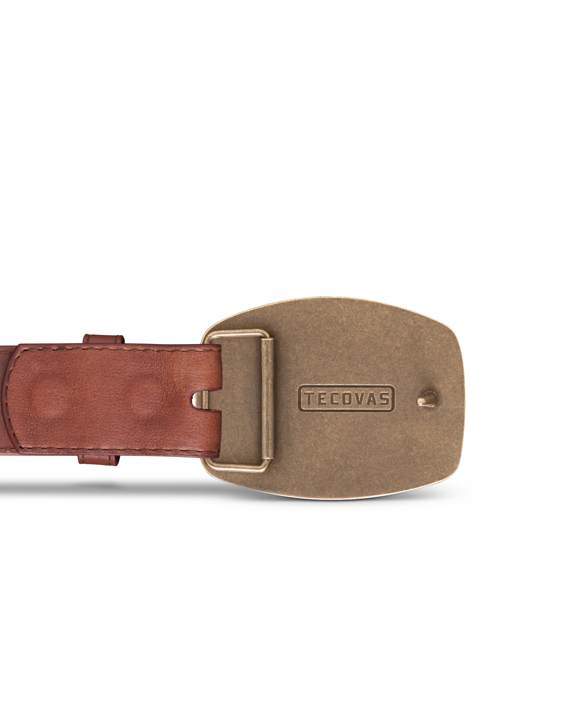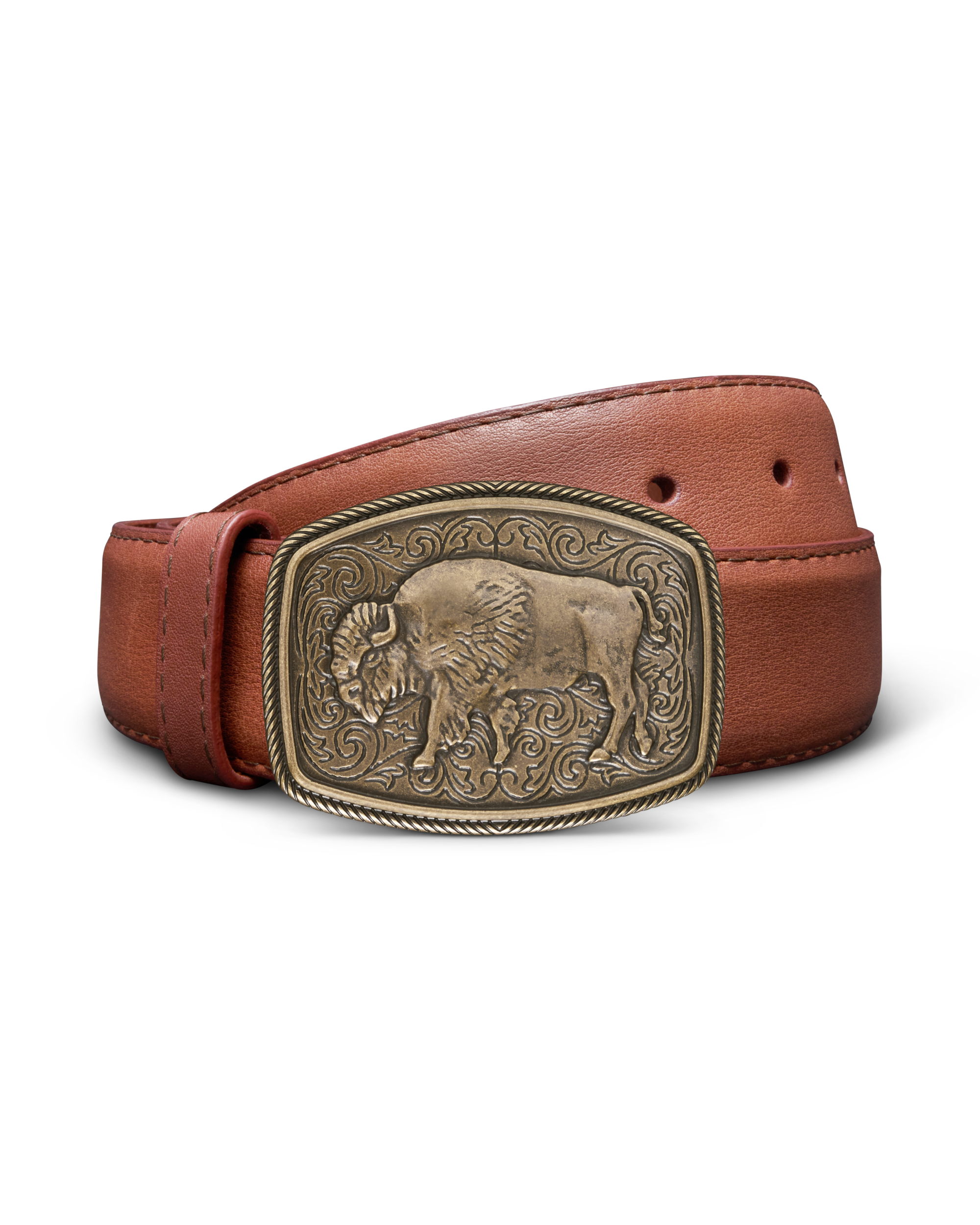 Our antique brass-plated Bison Buckle features a rope border, etched background, and raised detailing. A timeless addition to both men’s and women’s Western ‘fits, it will fit with any men‘s belt with our name on it — and many others in your rotation thanks to its swing bar and hook fastener.