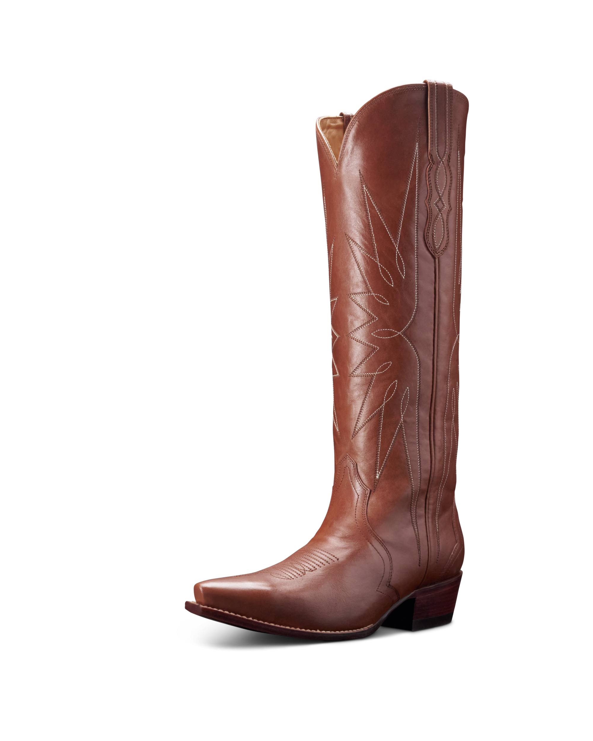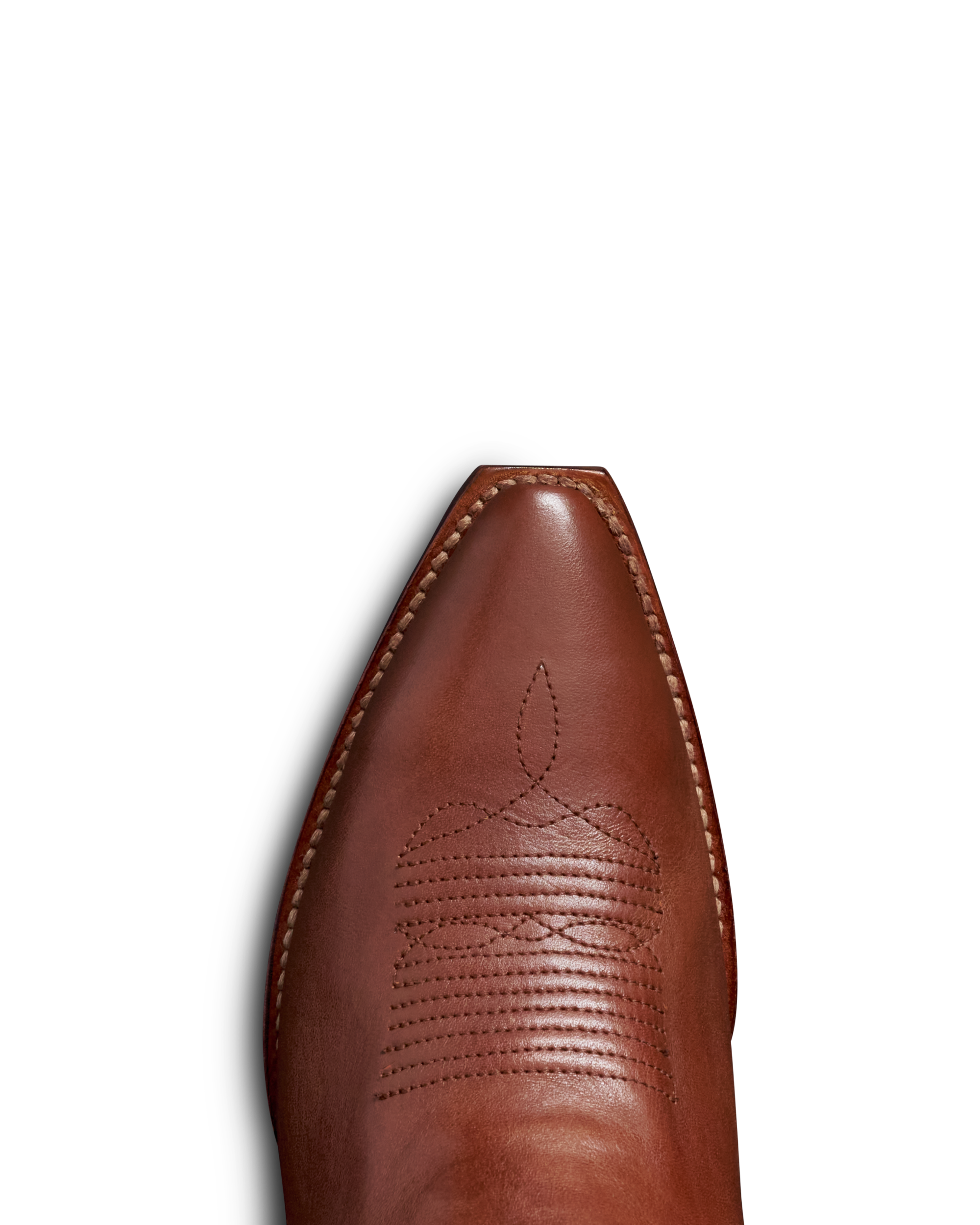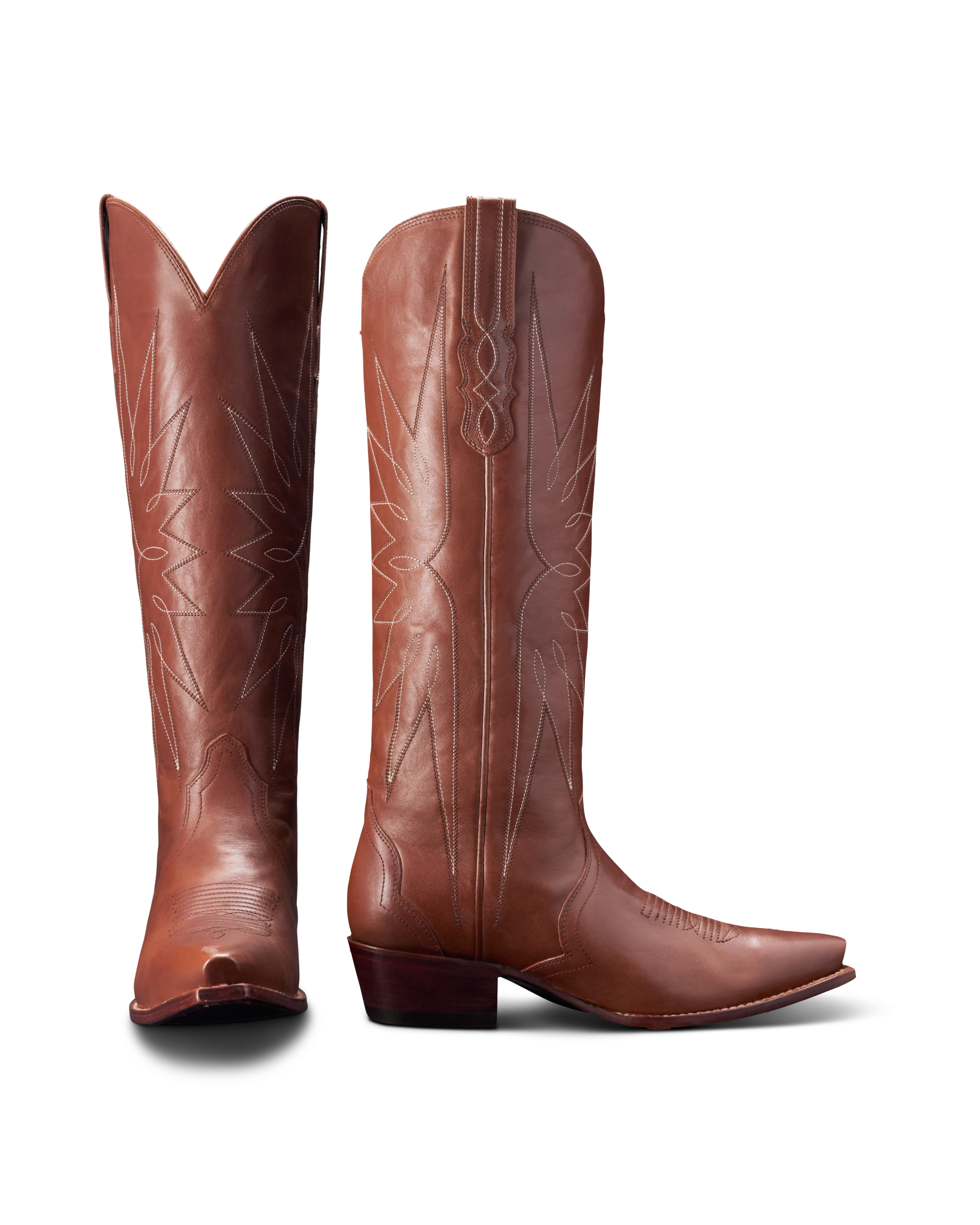 A tall showstopper, The Loretta features an intricately stitched 17” shaft with hung leather lining and a streamlined modern profile that’s made to be shown off. A 1 ¾” stacked leather heel and snip toe ensure comfort doesn’t take a backseat to looks, and our signature toe bug takes it all the way West.