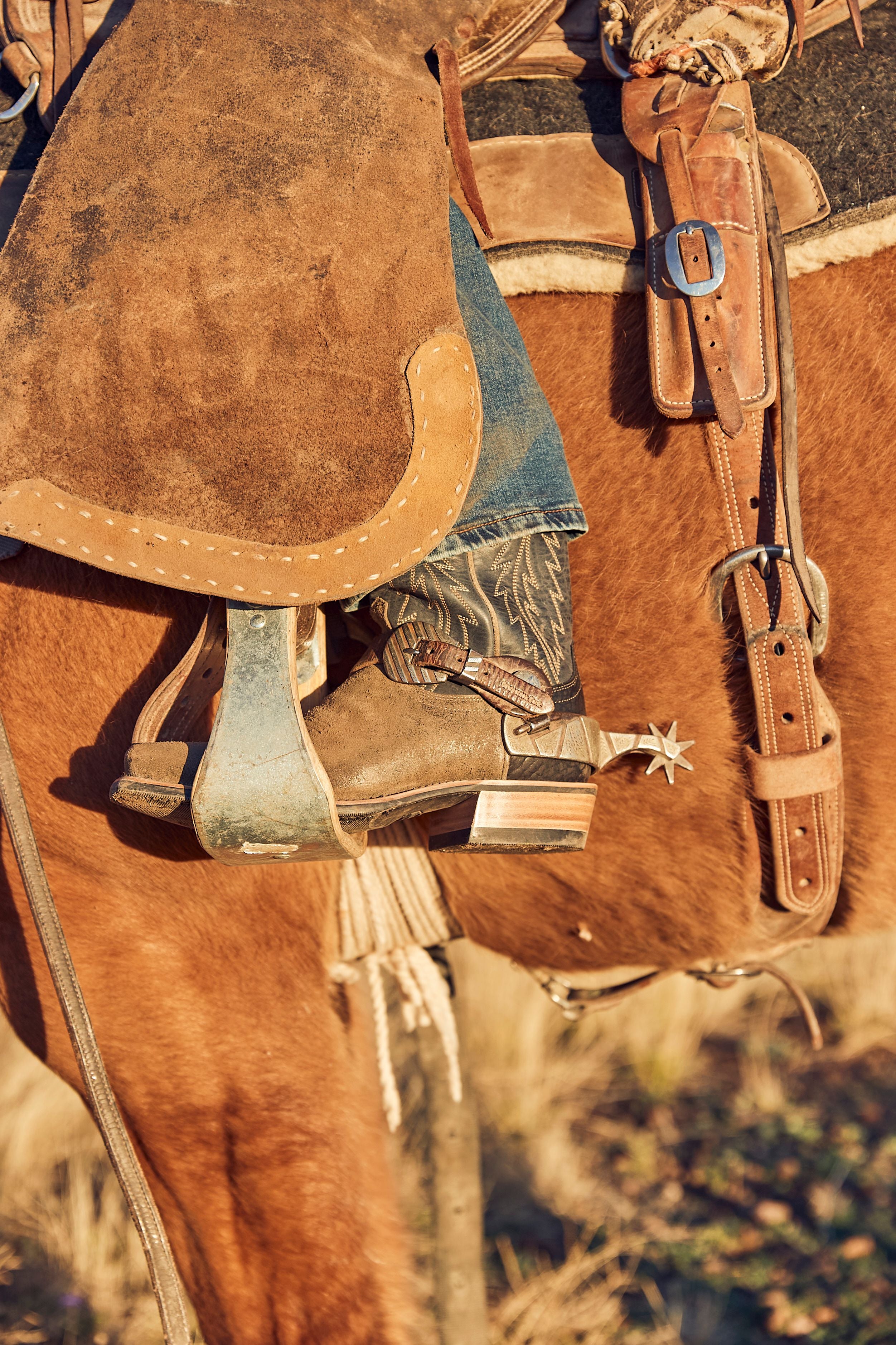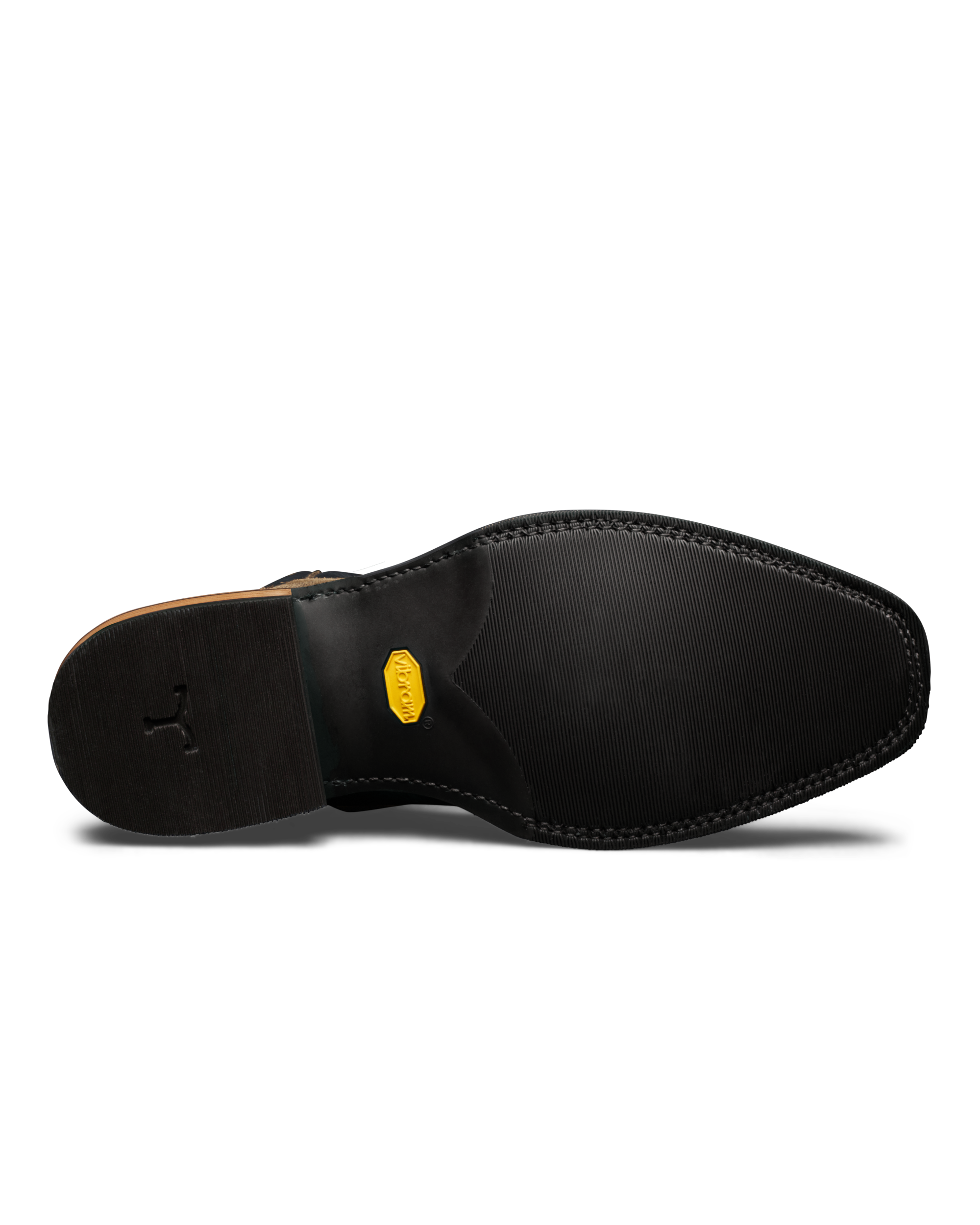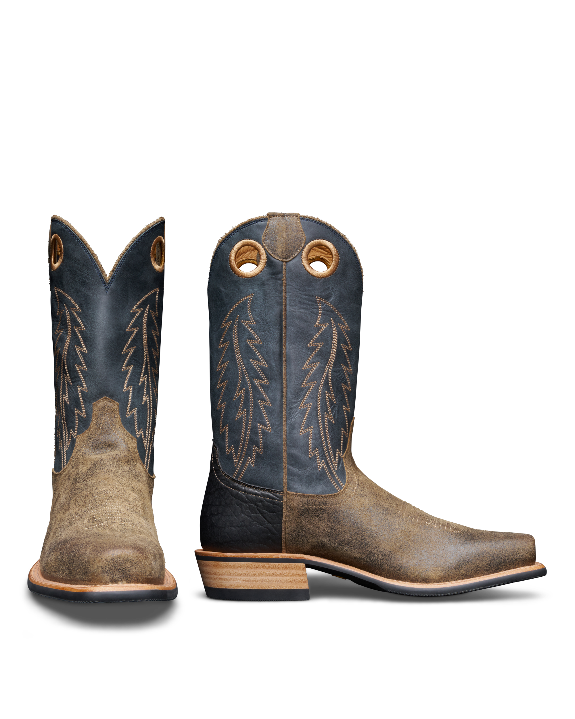 Available here in bullhide, roughout, and tumbled shrunken bison — all are equally tough with a slim Vibram outsole and rugged bullhide counter made to handle spurs. Its 1 ½” stacked leather heel is slightly pitched in the front for stirrup grip, and the back houses a 6/16” spur ledge. Inside, its dual-insole keeps things comfortable with a removable cushioned footbed.