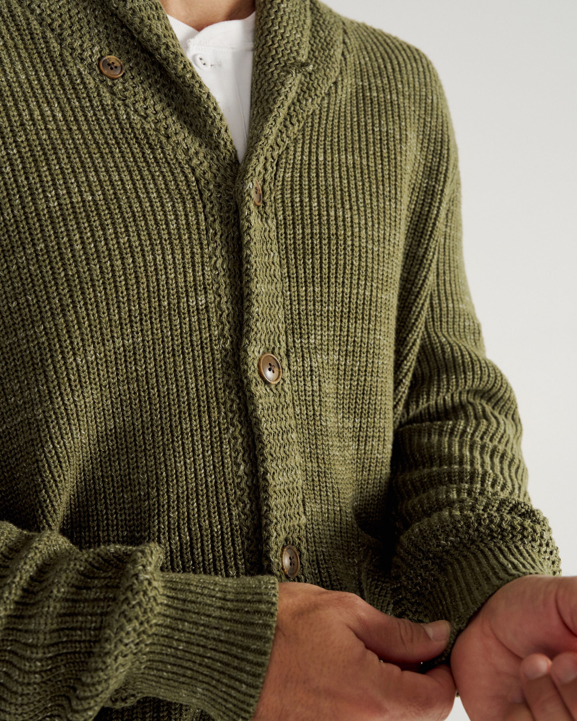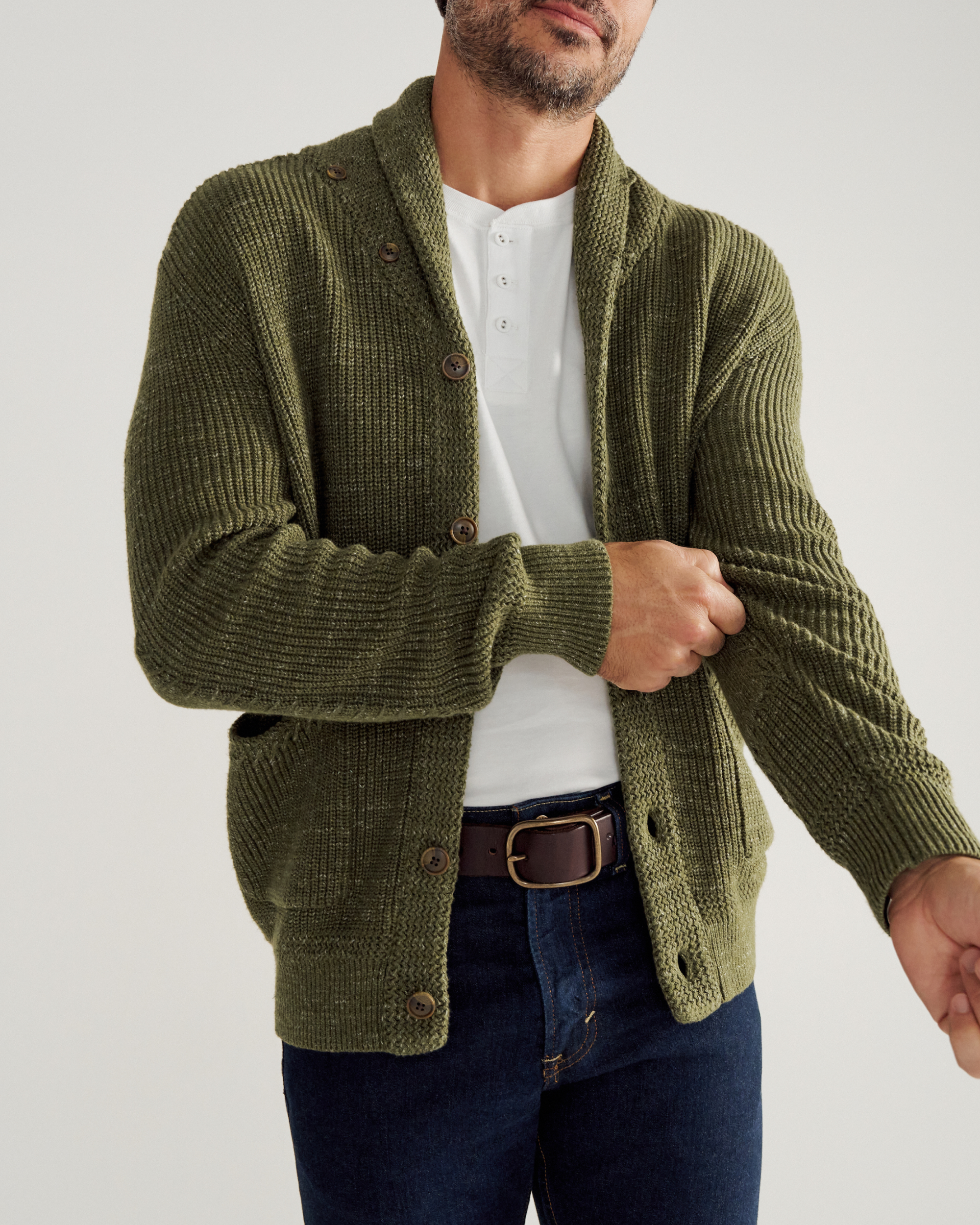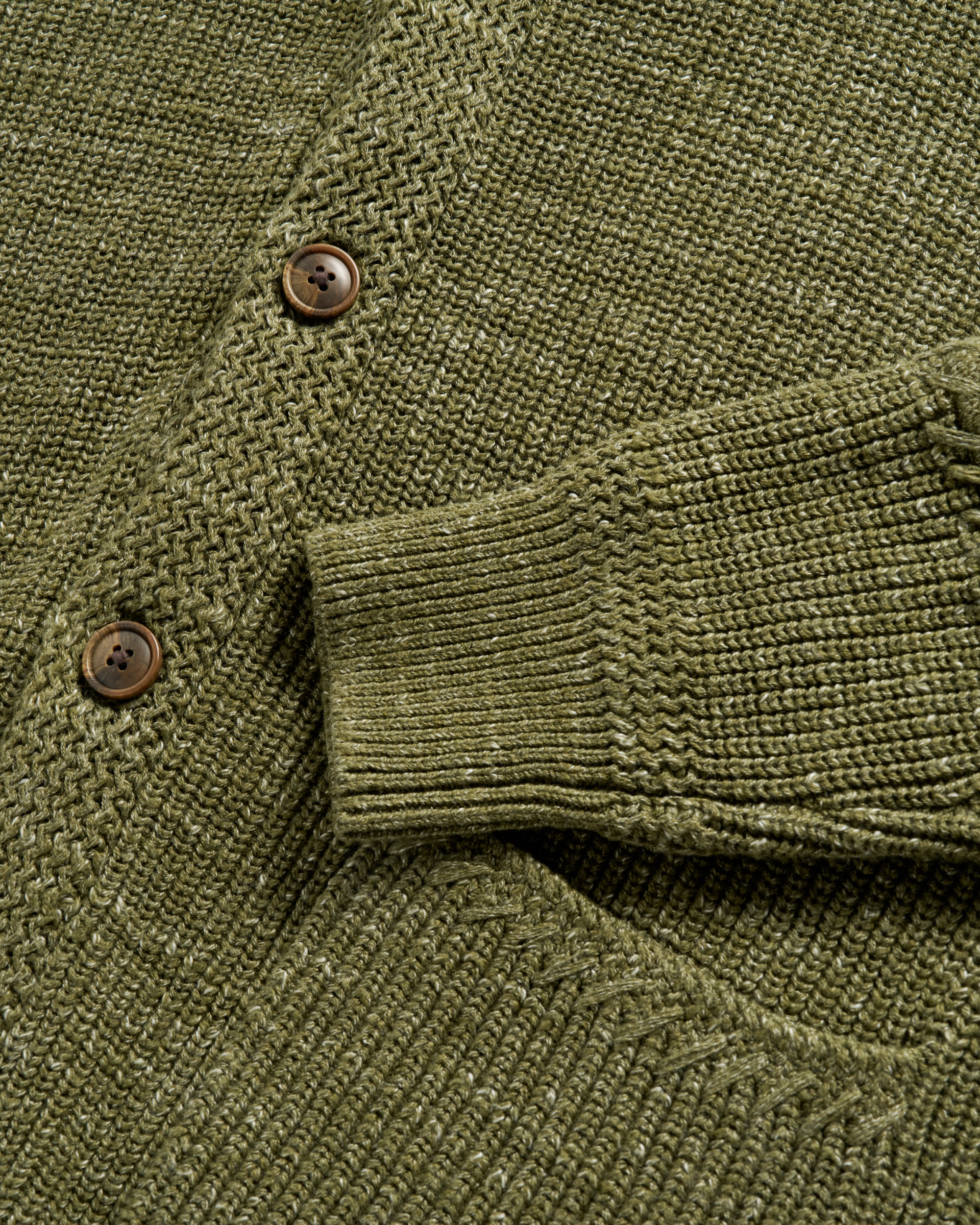 Crafted from 100% slub cotton with multi-colored yarns, this sweater delivers natural depth and dimension. Raised stitching along the collar, placket, shoulders, back yoke, cuffs, and hem adds a handcrafted feel, while hand-finished whipstitching at the shoulders and pockets gives it a rustic touch. A textured knit pattern rounds it out with warmth and character. Rich brown horn buttons complete a piece made to layer, gift, and wear all season.