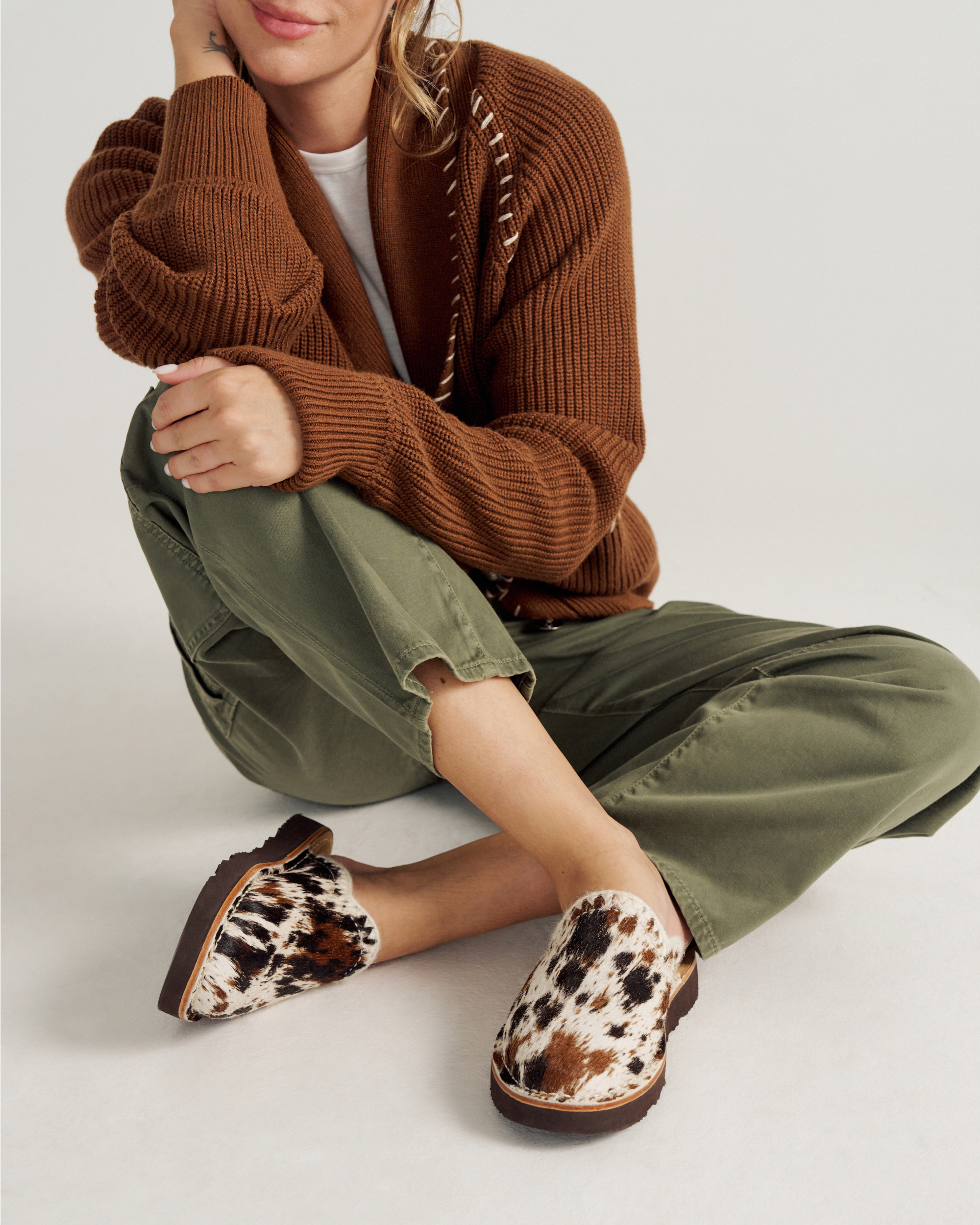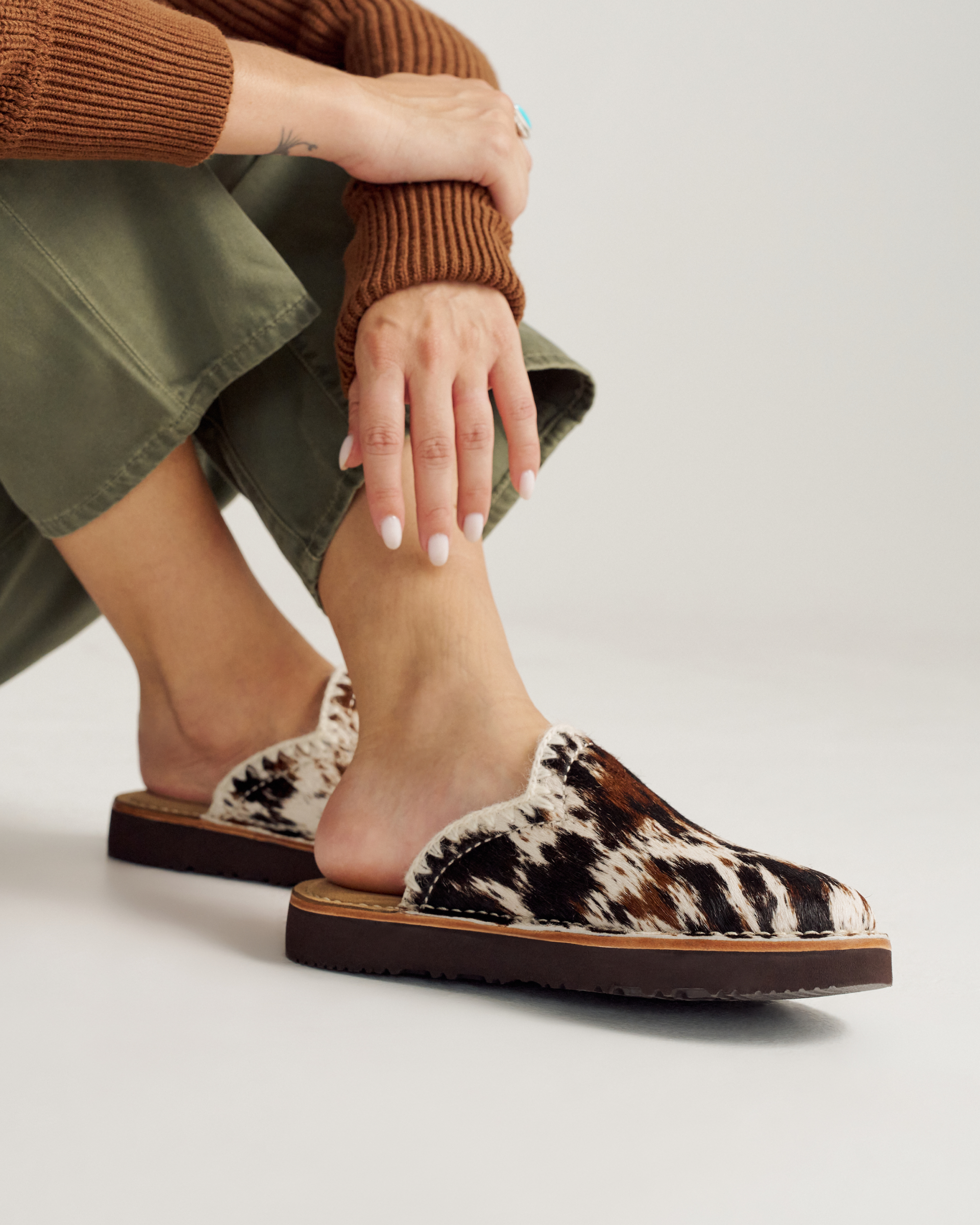 The Olivia blends cozy, everyday wear with thoughtful craftsmanship. A fully hand-crocheted topline meets our new plant-based EVA outsole — more durable, abrasion-resistant, and made with 35% sugarcane. Available in elevated suedes and a unique hair-on-hide, each pair is one-of-a-kind. Perfect for gifting or lounging in style, the Olivia is a slipper that feels as special as it looks