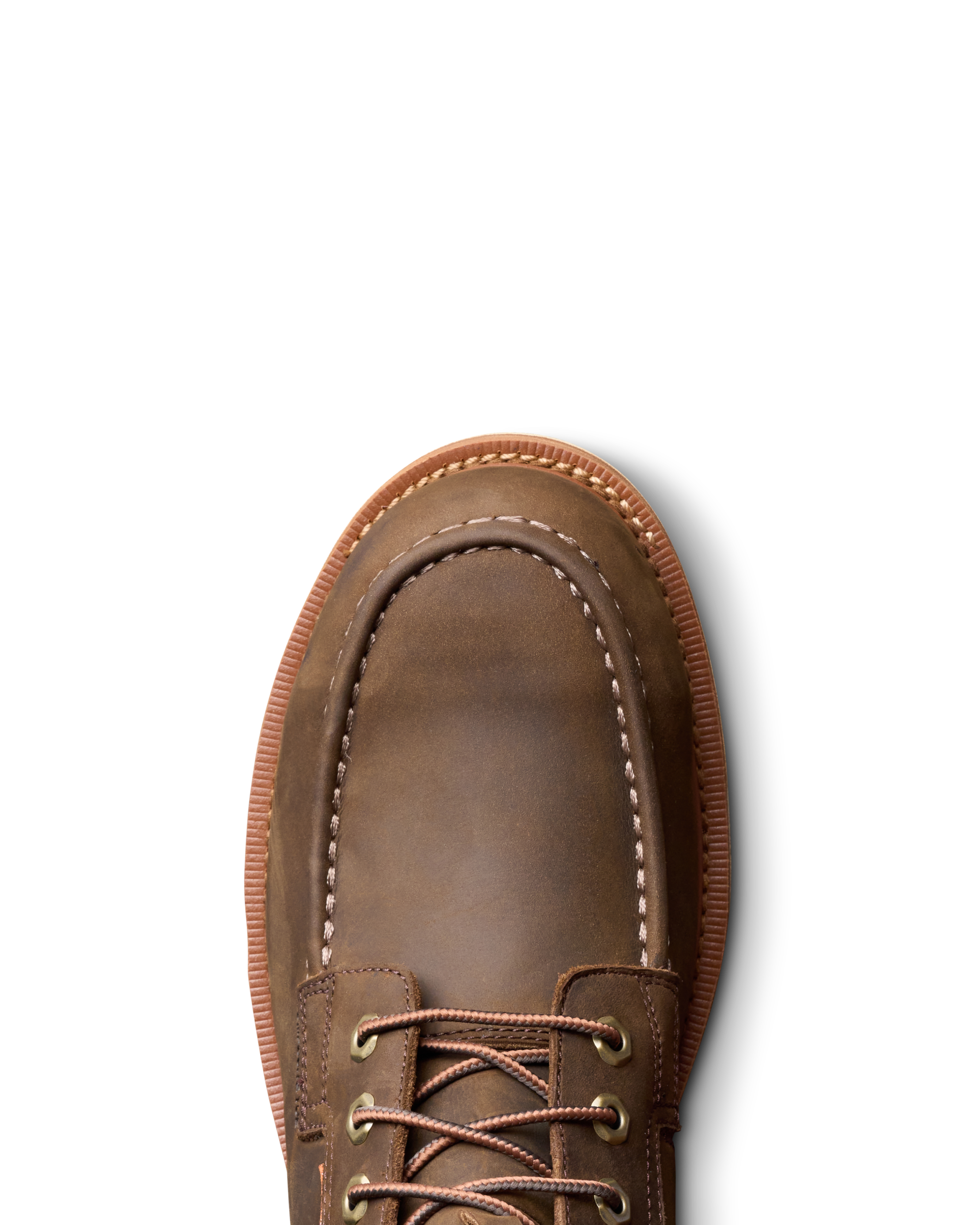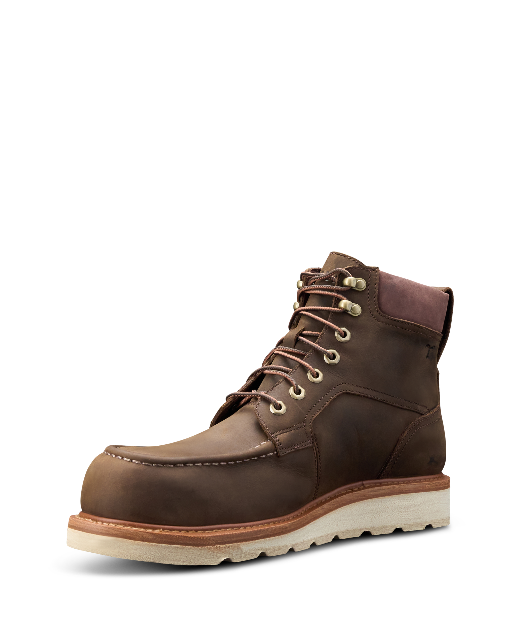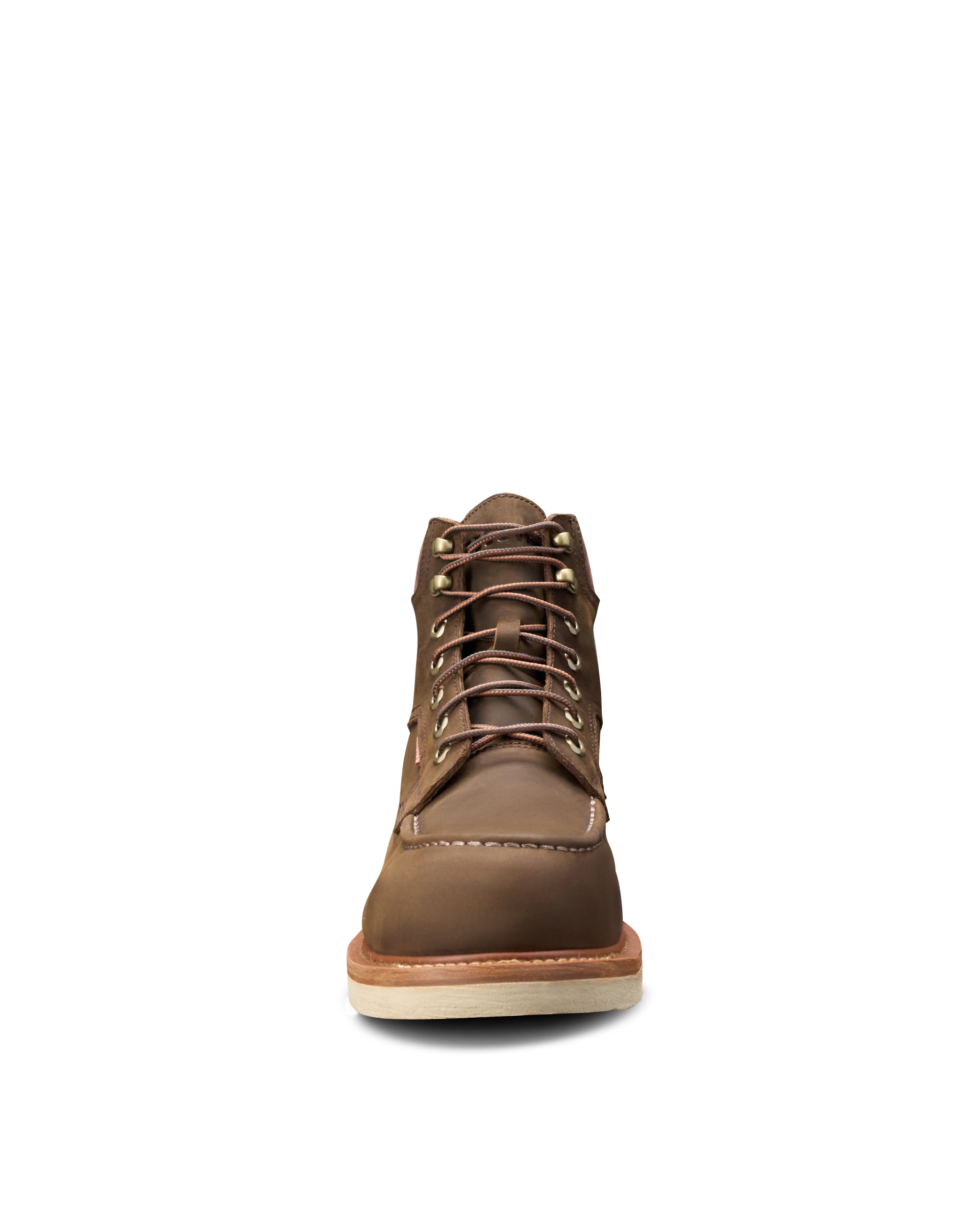 This lace up moc toe work boot is made for professionals featuring a classic lower profile but with all the brawn and comfort you need for the job. A dual-density cushioned outsole, our own energy-returning Total Energy Command (TEC) insole system, and a removable, cushioned footbed leave nothing on the table by way of comfort. Its deep-lugged MuckOFF Tread repels crud and debris and is oil and slip-resistant, and a breathable barrier and treated leathers will keep your feet dry. This work boot meets the ASTM standards for safety toe, slip-resistance, and electrical hazard protection.