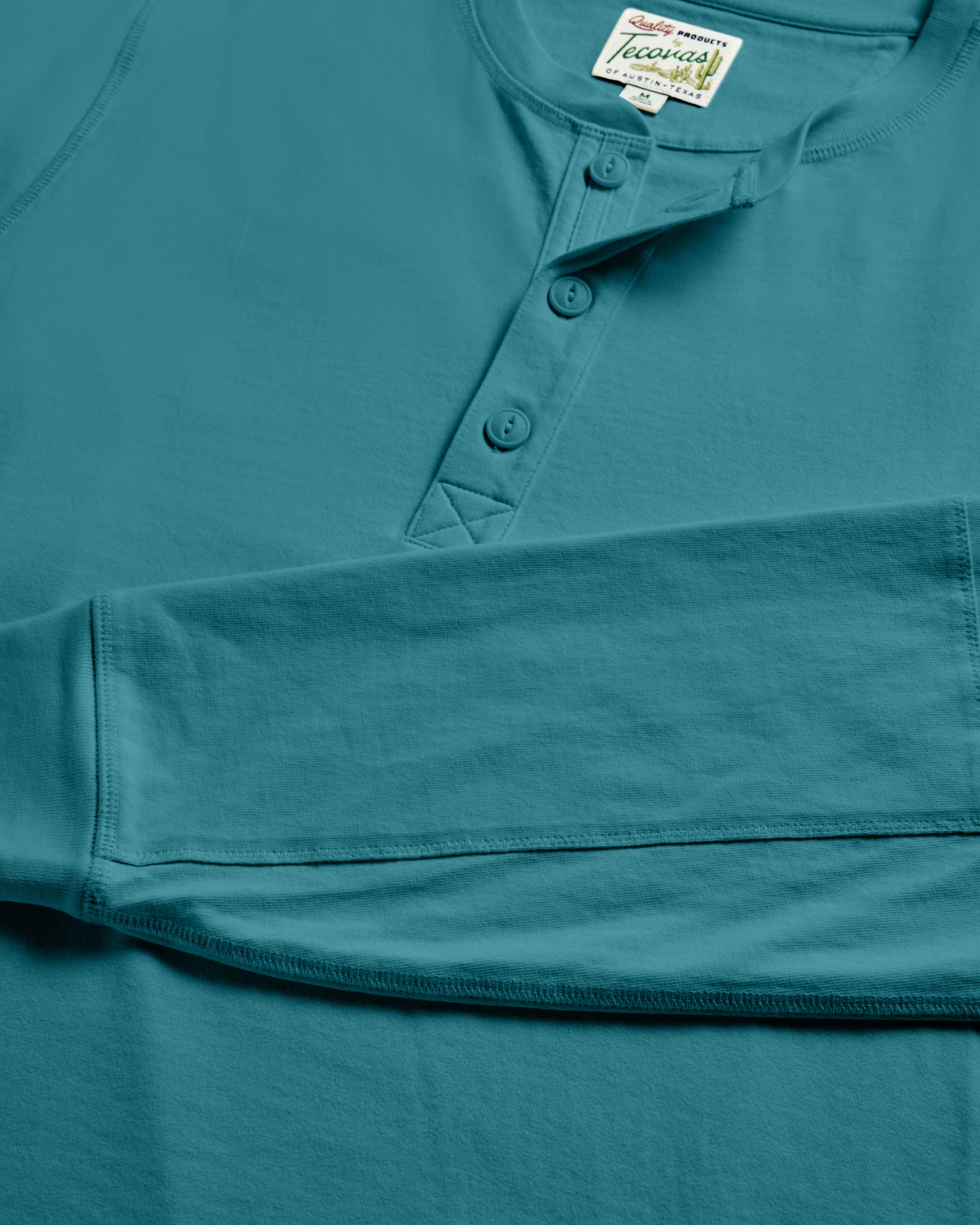 Built from soft, breathable 100% cotton with a substantial midweight feel, this long-sleeve Henley stands strong on its own or layers cleanly under a jacket. Western-inspired details give it character and staying power. Think a reinforced back yoke with tonal embroidery, elbow patches with zig-zag stitching, and rugged double-needle seams. Finished with a classic placket and durable cat-eye buttons, this one’s made for the long haul.