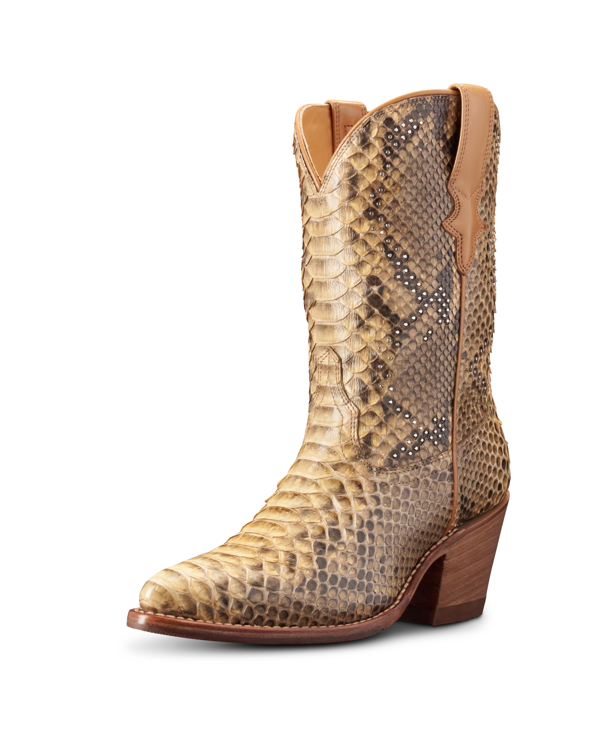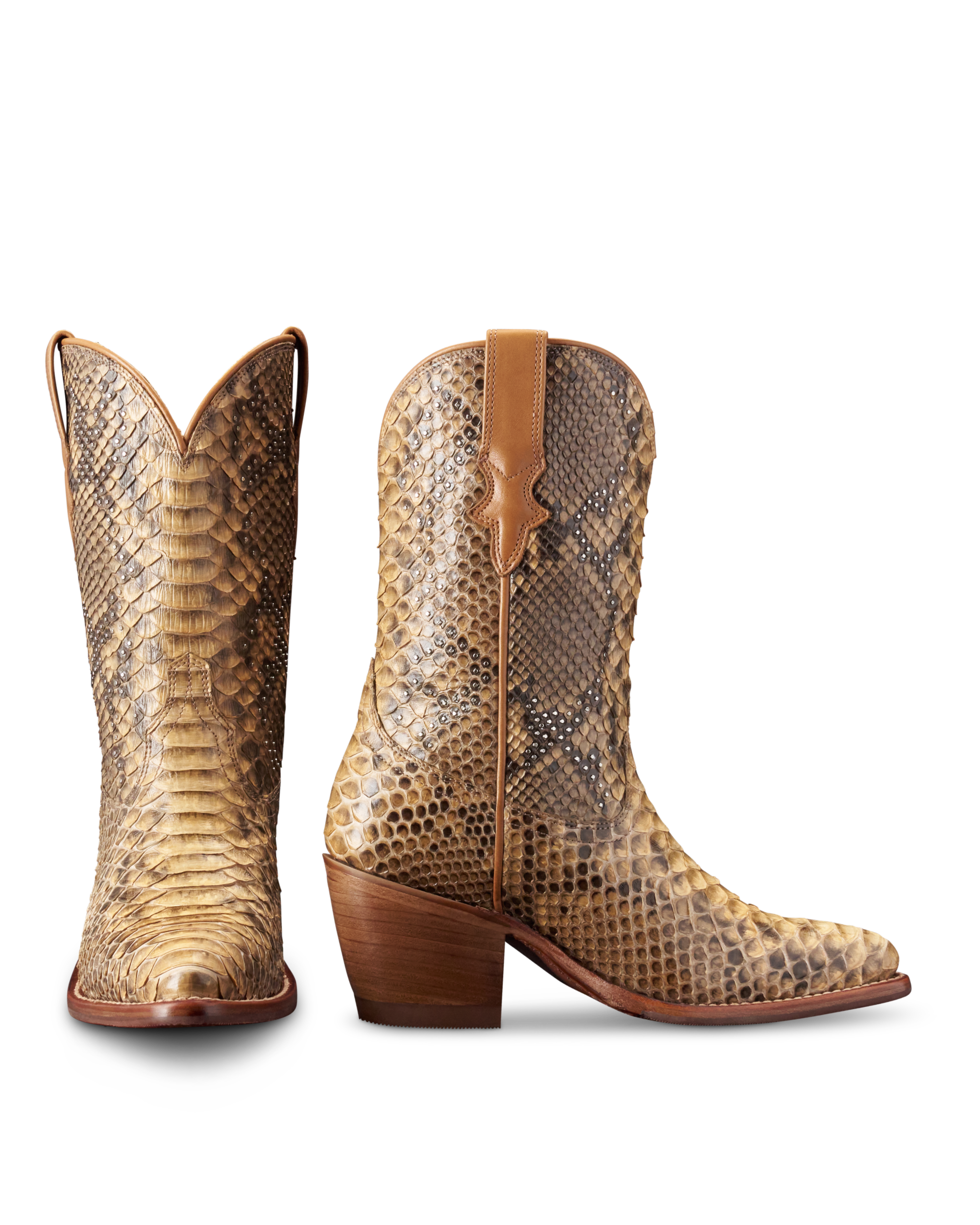 Crafted from striking back-cut python, this bold boot brings texture and depth to every step. The sleek, 3-inch heel adds just the right height, perfect for nights out or turning heads wherever you go. Hand-placed studs follow the natural pattern of the python, highlighting the craftsmanship and one-of-a-kind details that set Cassie apart. Statement-making yet effortlessly wearable—Cassie is made for stepping out in style.