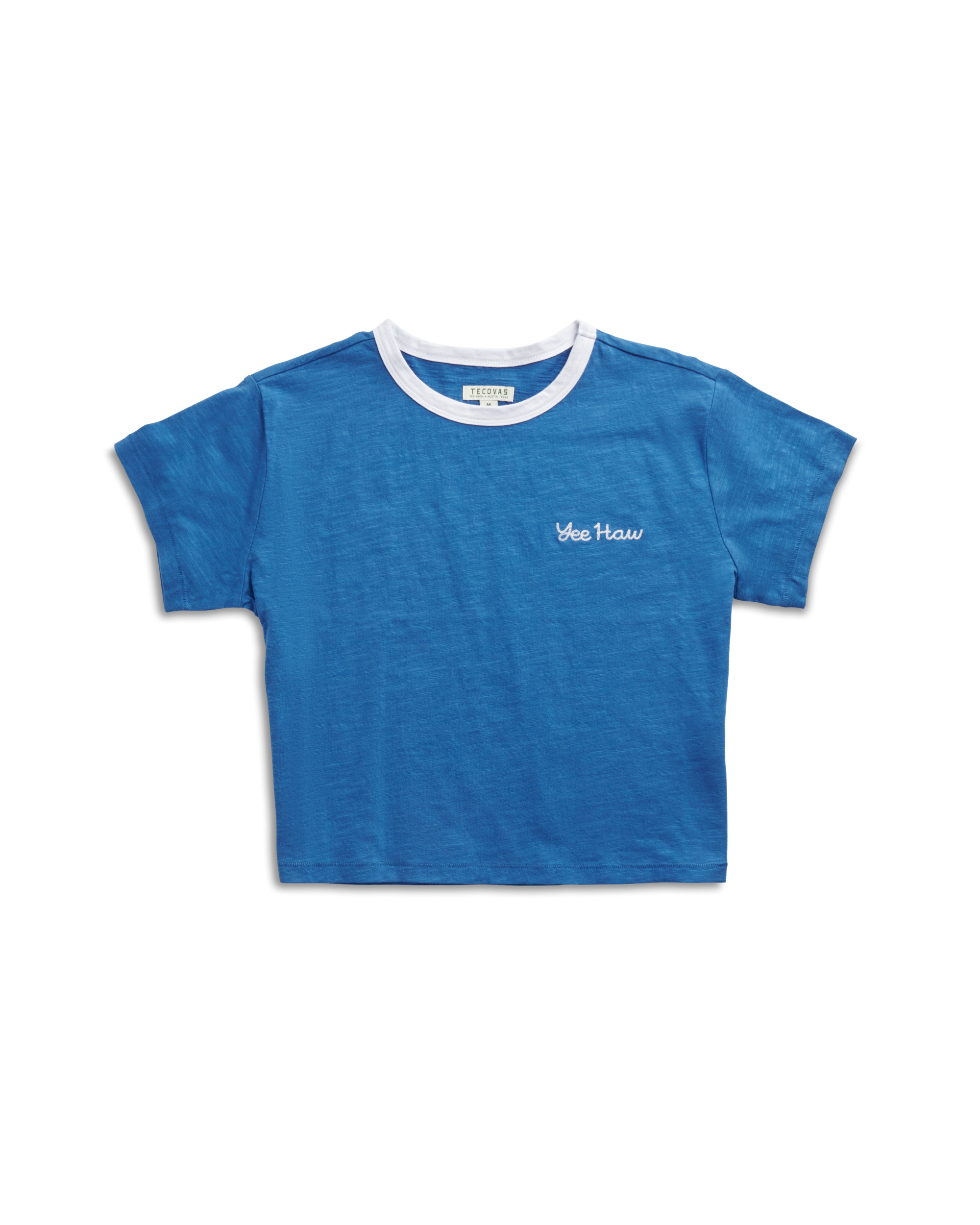 Kick up some dust in our original ringer-style tee, featuring Yee Haw front and center. Made from soft 100% jersey cotton, this everyday classic has a comfortable standard fit, contrast ribbing at the neck, and a chain stitch-inspired detail for a little extra Western flair.