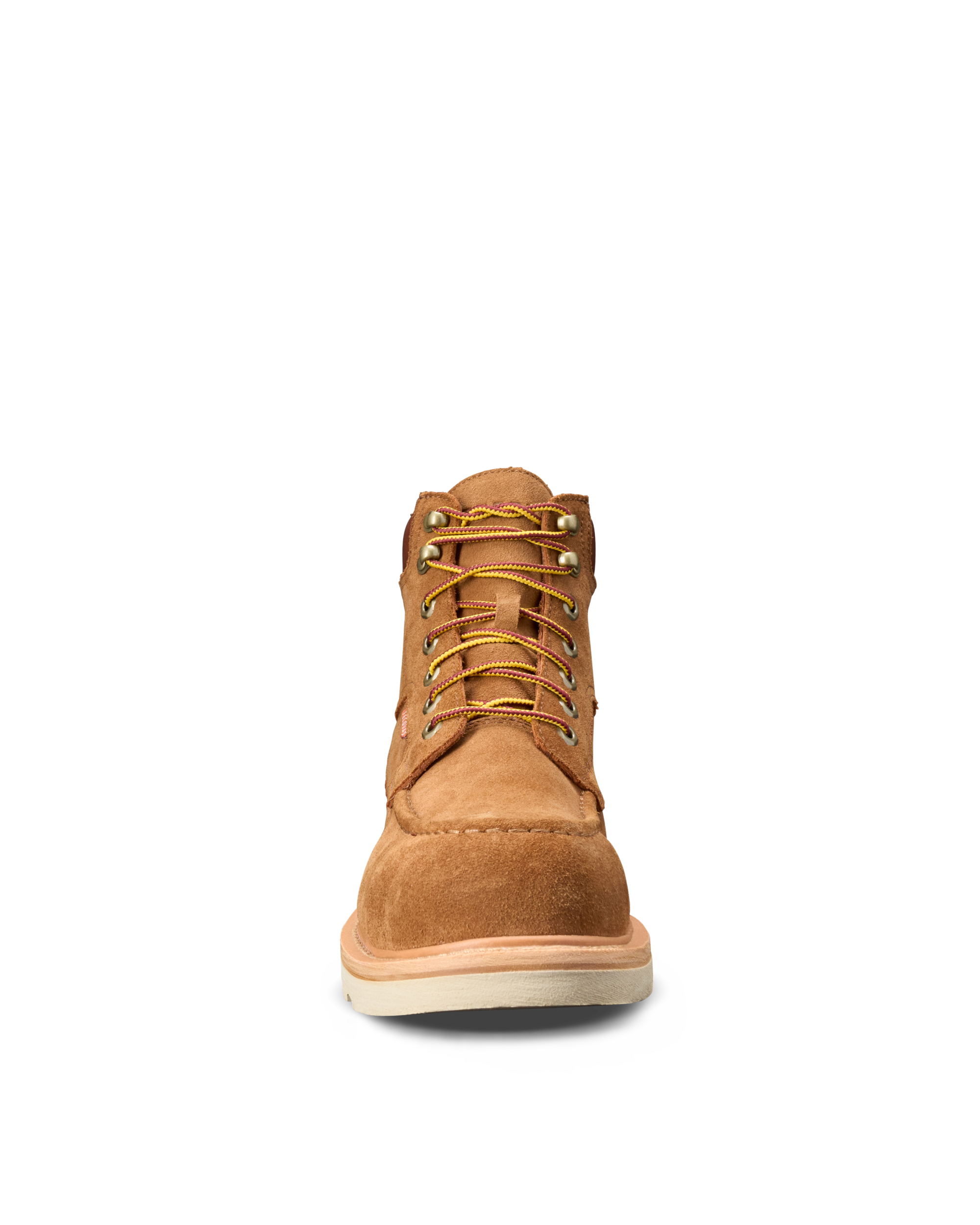 This lace up moc toe work boot is made for professionals featuring a classic lower profile but with all the brawn and comfort you need for the job. A dual-density cushioned outsole, our own energy-returning Total Energy Command (TEC) insole system, and a removable, cushioned footbed leave nothing on the table by way of comfort. Its deep-lugged MuckOFF Tread repels crud and debris and is oil and slip-resistant, and a breathable barrier and treated leathers will keep your feet dry. This work boot meets the ASTM standards for safety toe, slip-resistance, and electrical hazard protection.