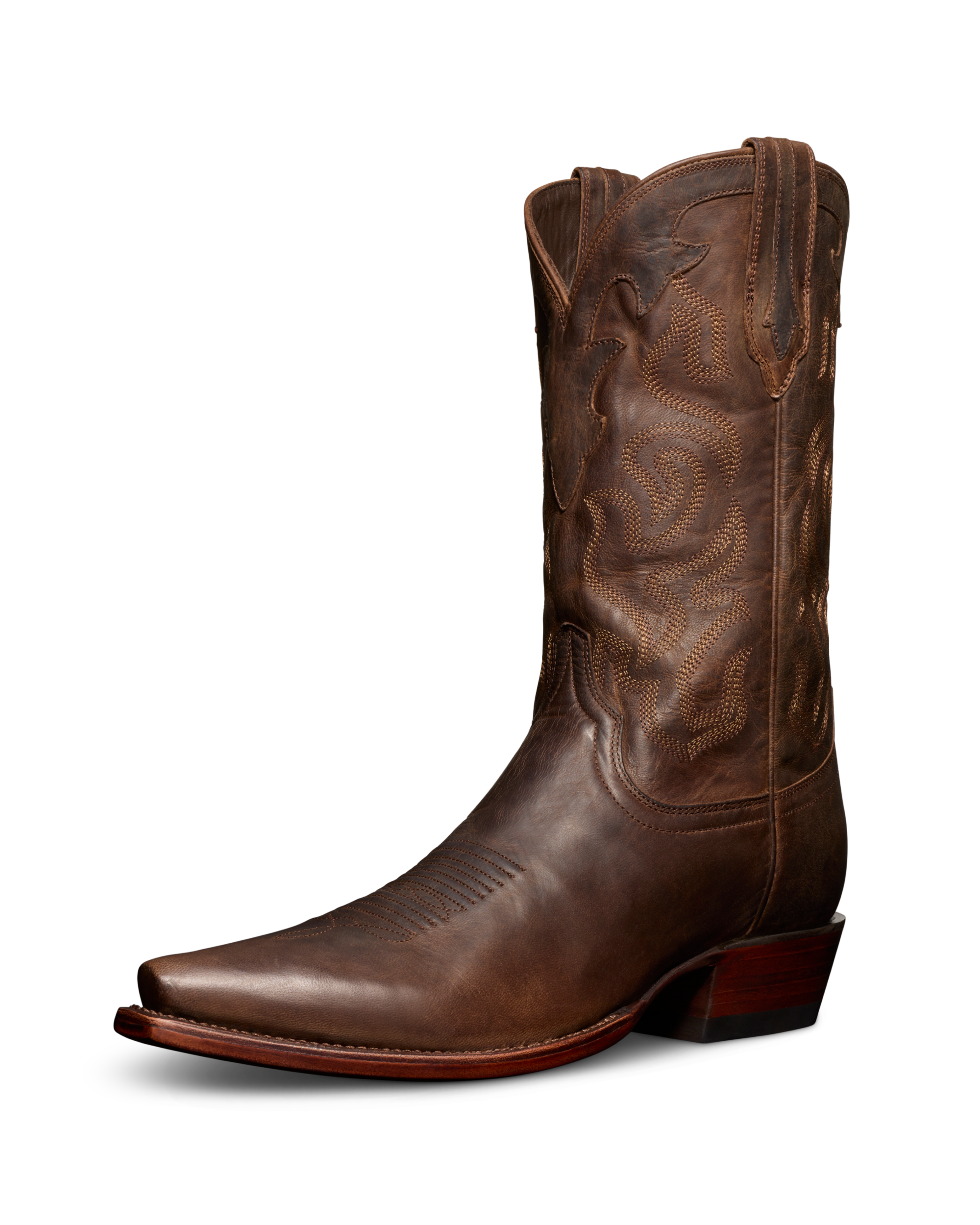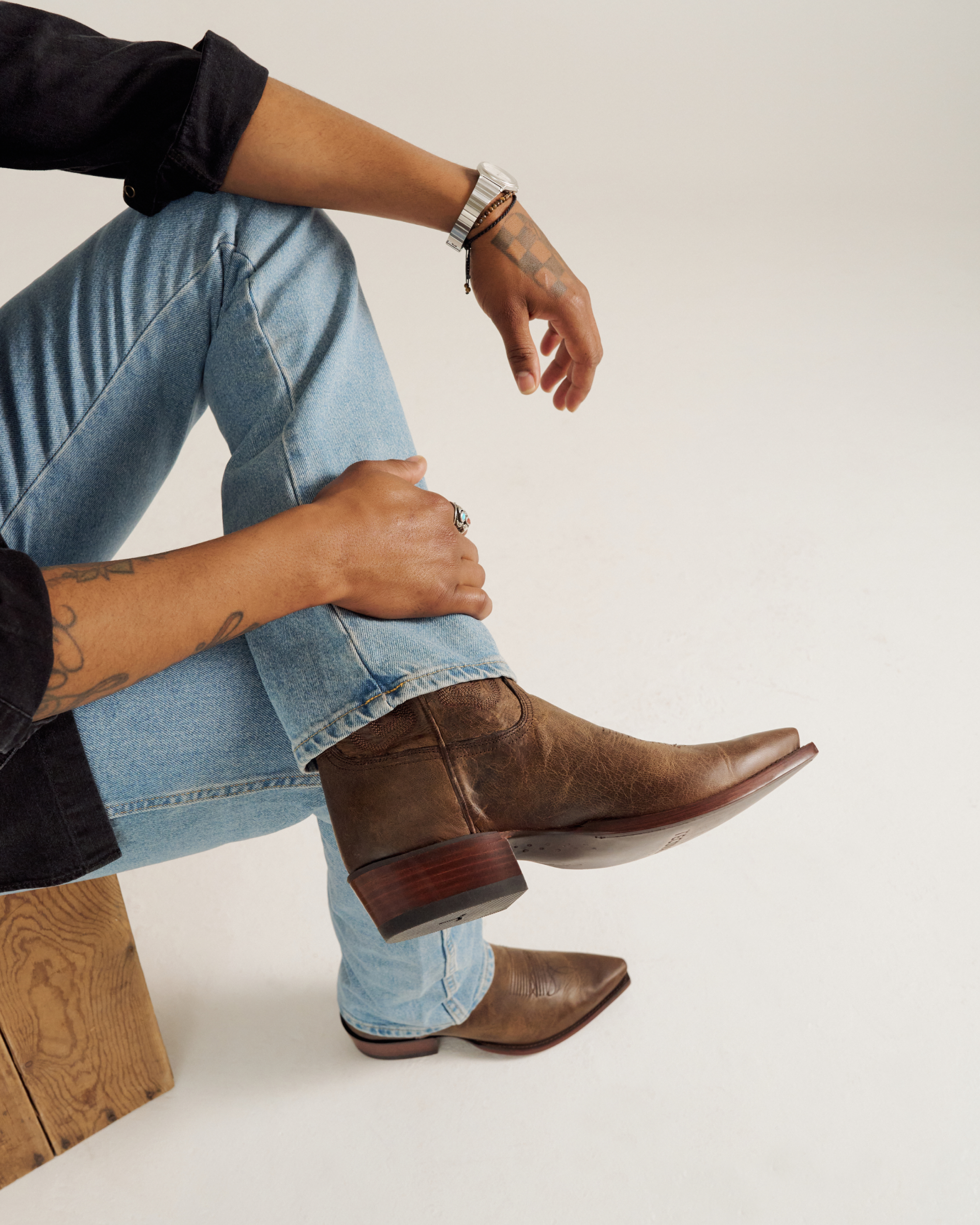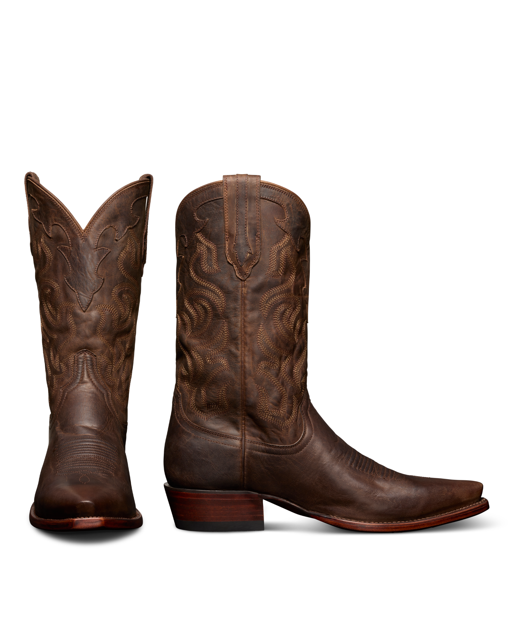 The Garrett is a snip-toe cowboy boot offered in quick-to-patina goat leather and quintessential full-quill ostrich. With design details from top to bottom, The Garrett is a handsome fella. A high standard for craftsmanship and creativity is set with our first collar and pull tab overlays and further emphasized by the intricate shaft stitching. In Cafe goat leather from top to bottom, The Garrett brings a rugged, classic sensibility to any outfit. Featuring a cowhide shaft, the full-quill ostrich version in a new color we call “Peanut”, will dress up denim and slacks night or day.
