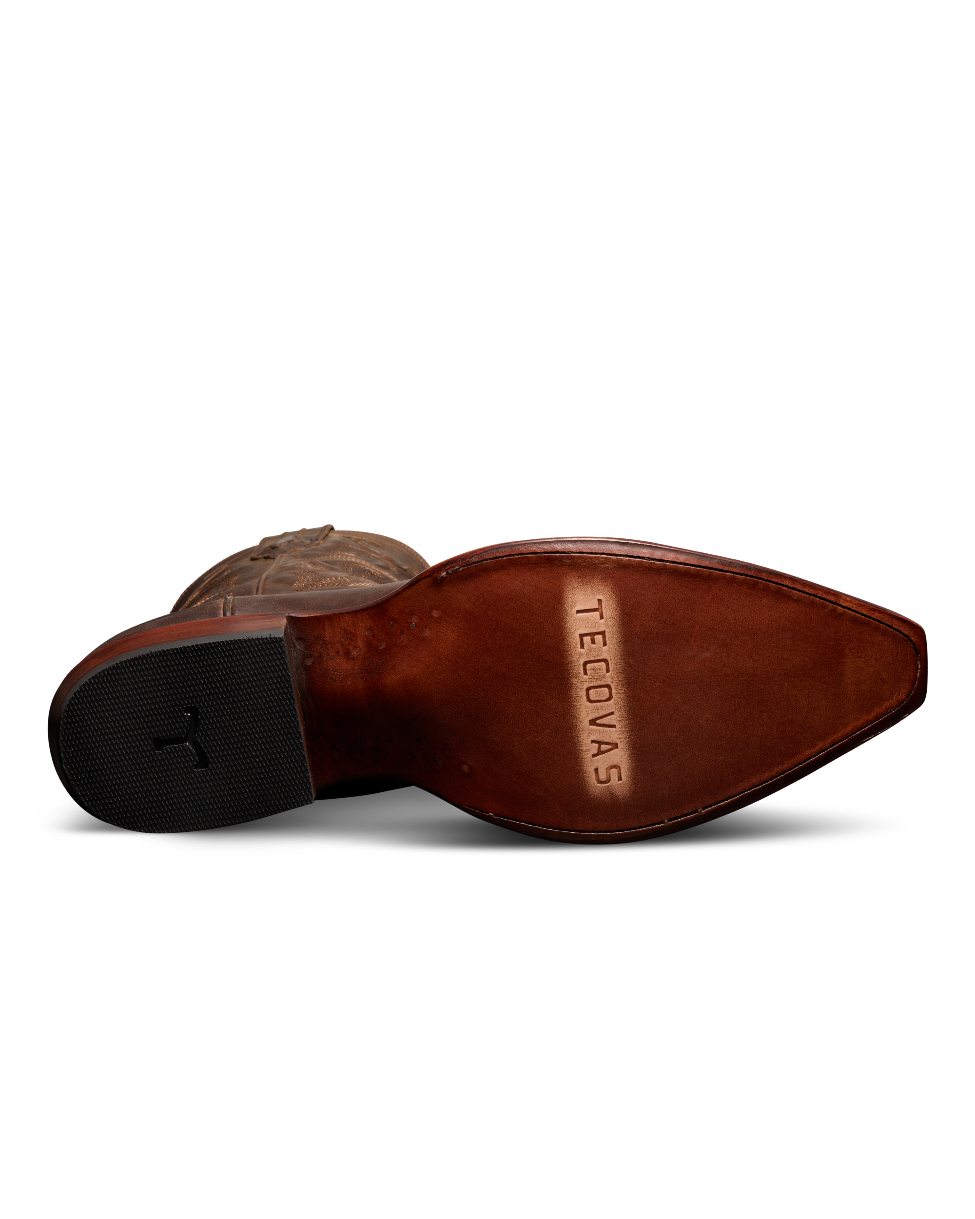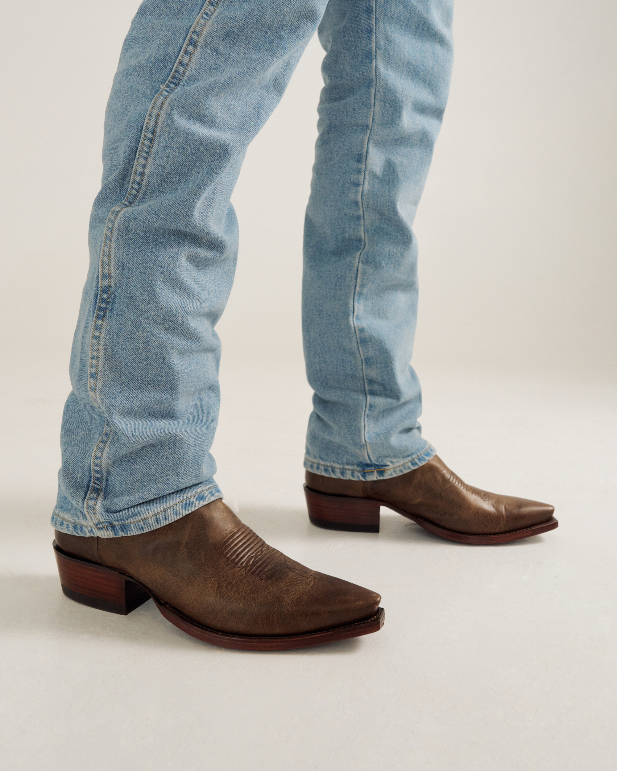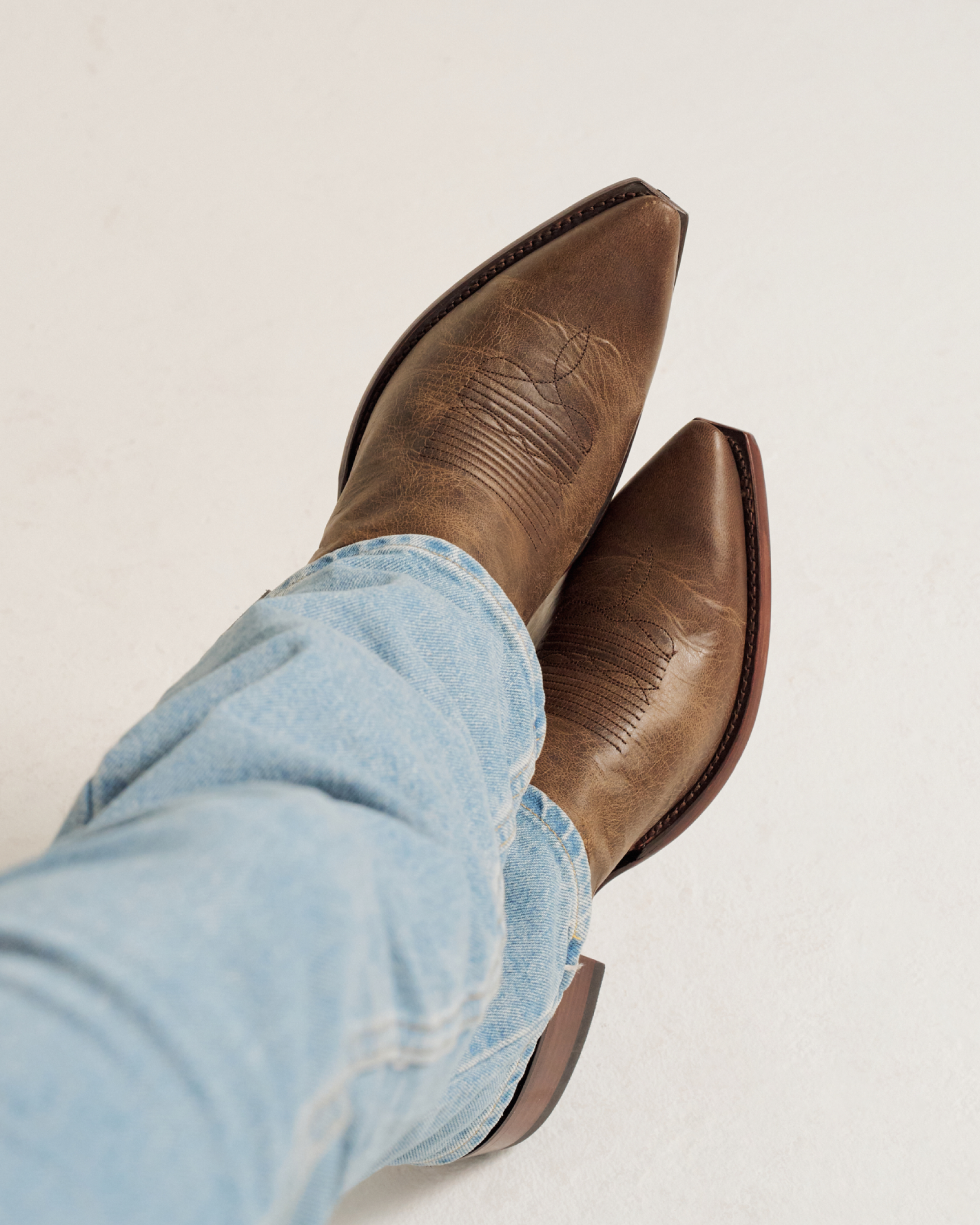The Garrett is a snip-toe cowboy boot offered in quick-to-patina goat leather and quintessential full-quill ostrich. With design details from top to bottom, The Garrett is a handsome fella. A high standard for craftsmanship and creativity is set with our first collar and pull tab overlays and further emphasized by the intricate shaft stitching. In Cafe goat leather from top to bottom, The Garrett brings a rugged, classic sensibility to any outfit. Featuring a cowhide shaft, the full-quill ostrich version in a new color we call “Peanut”, will dress up denim and slacks night or day.
