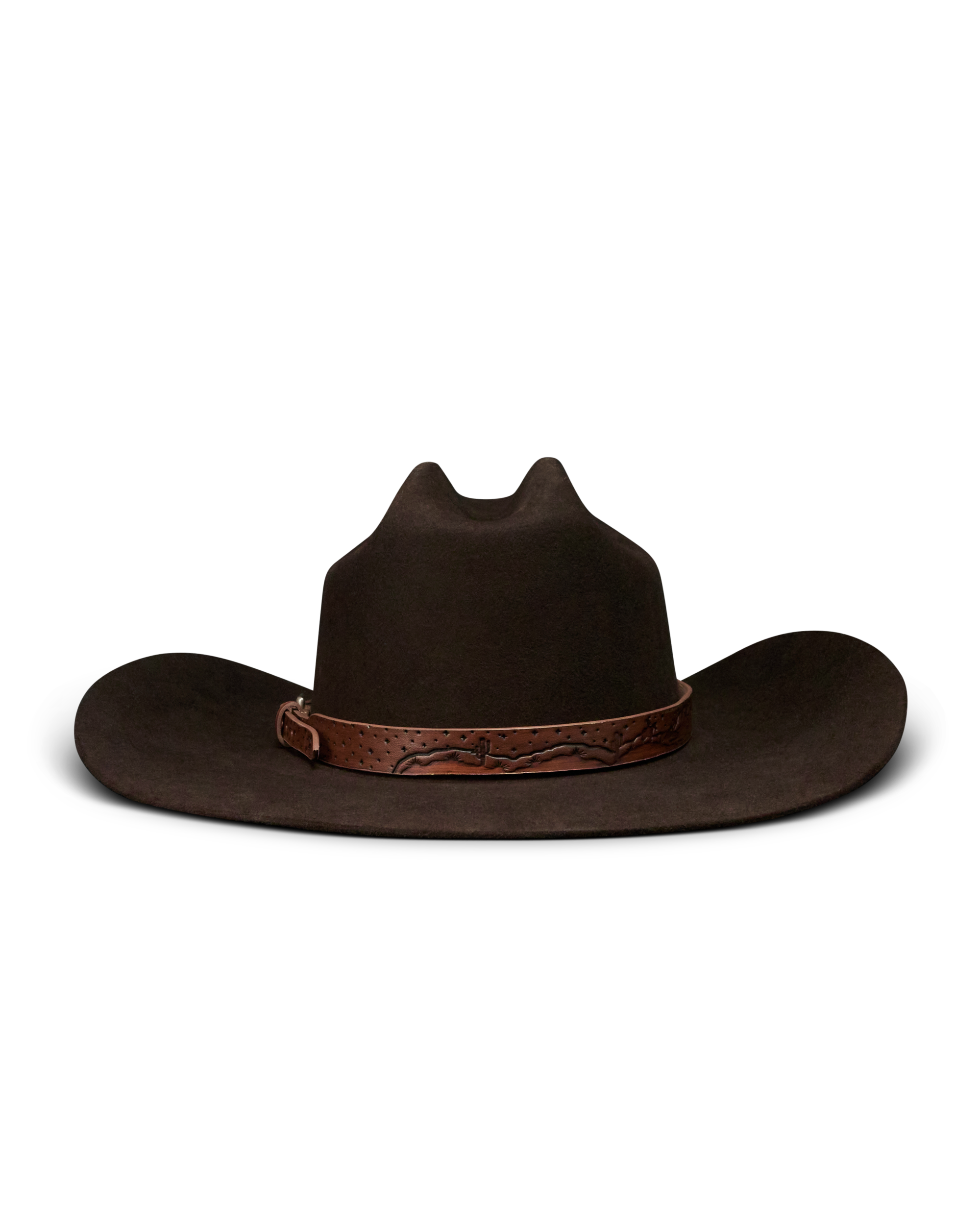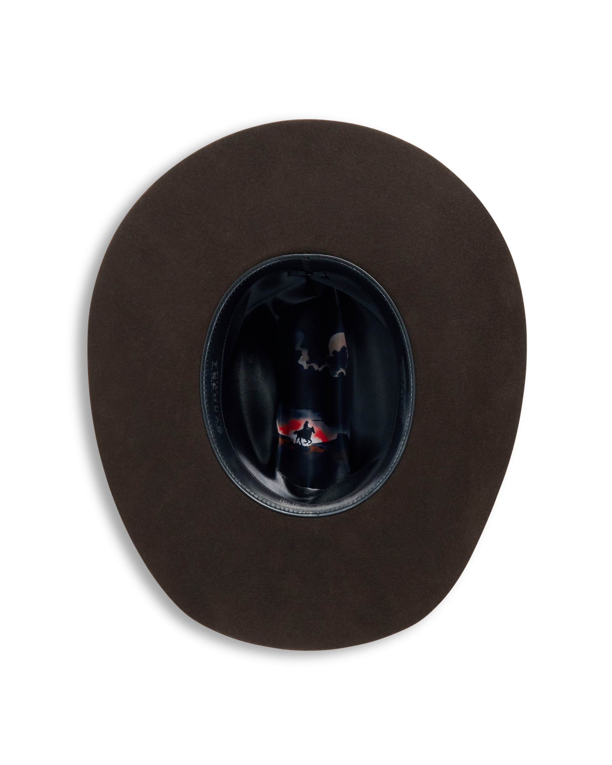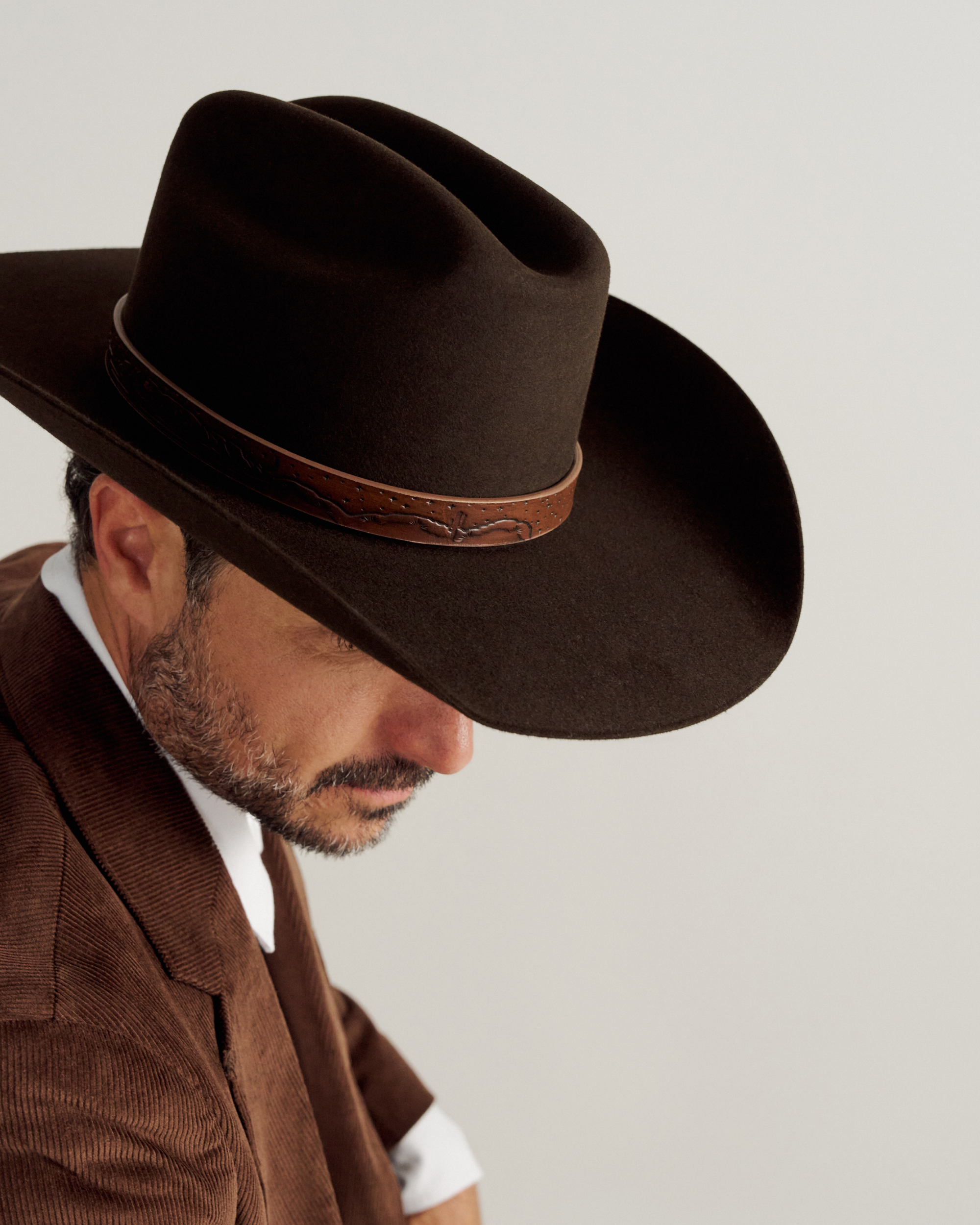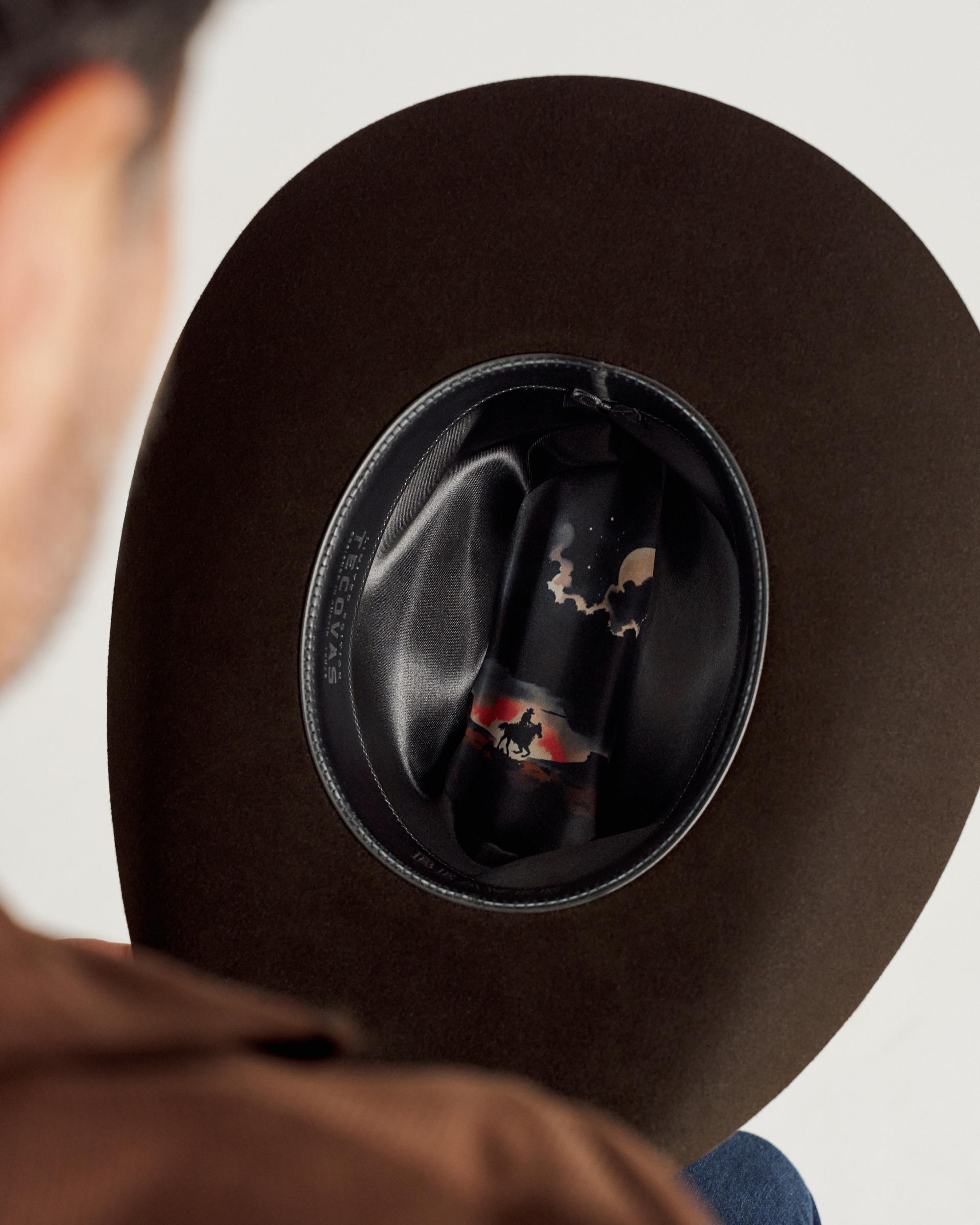 To celebrate ten years of Tecovas, we elevated our classic Cattleman Hat to honor the journey that brought us here. This limited-edition design updated with beaver blend felt features a cowhide hat band embossed with the Palo Duro landscape and night sky, and a satin-stitch interior lining that mirrors the original artwork on the Birthday X Wild Rag Scarf.