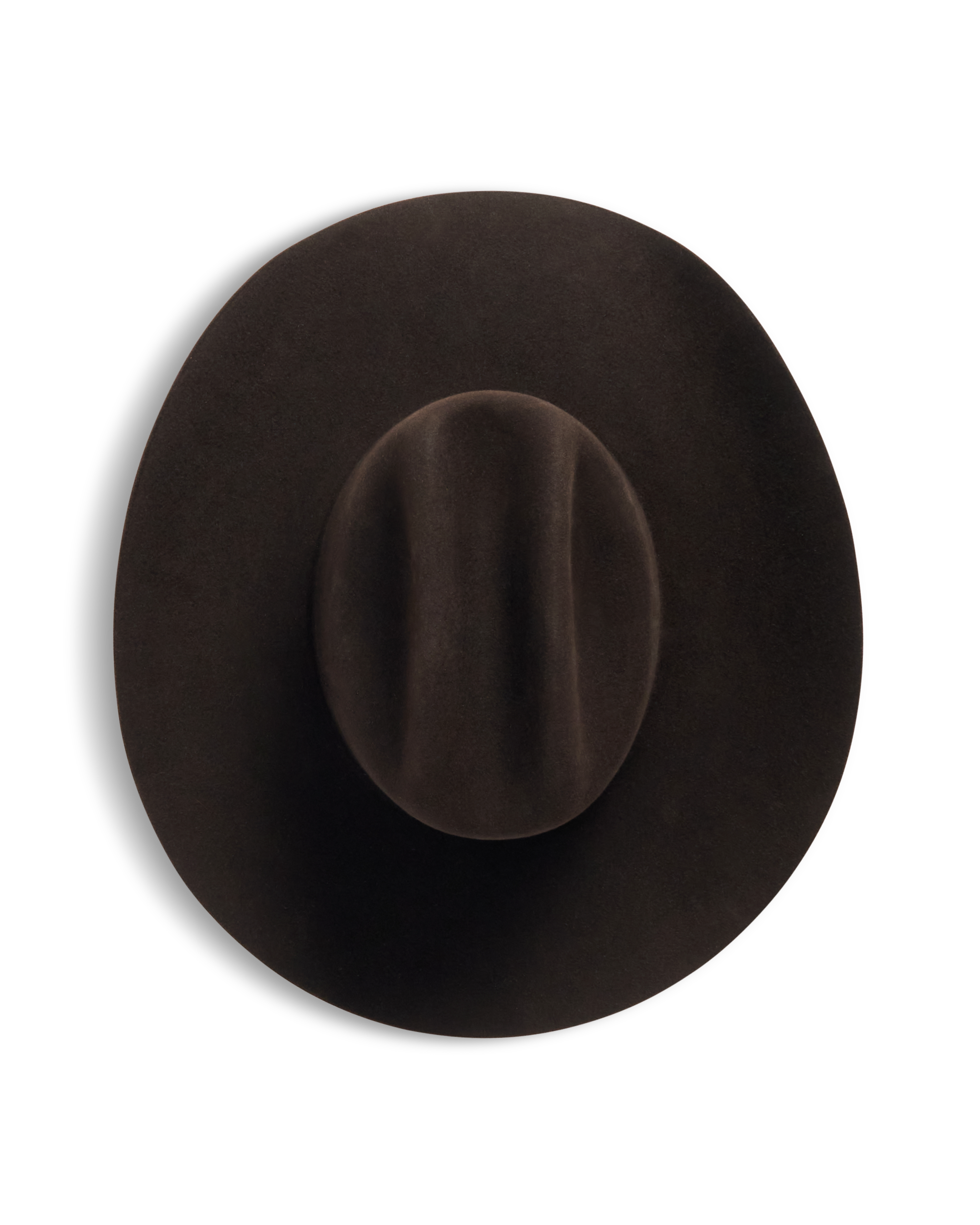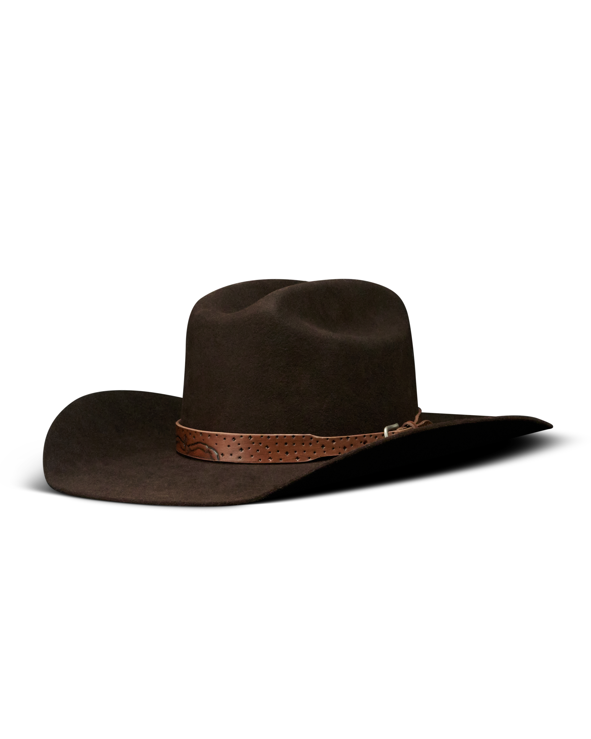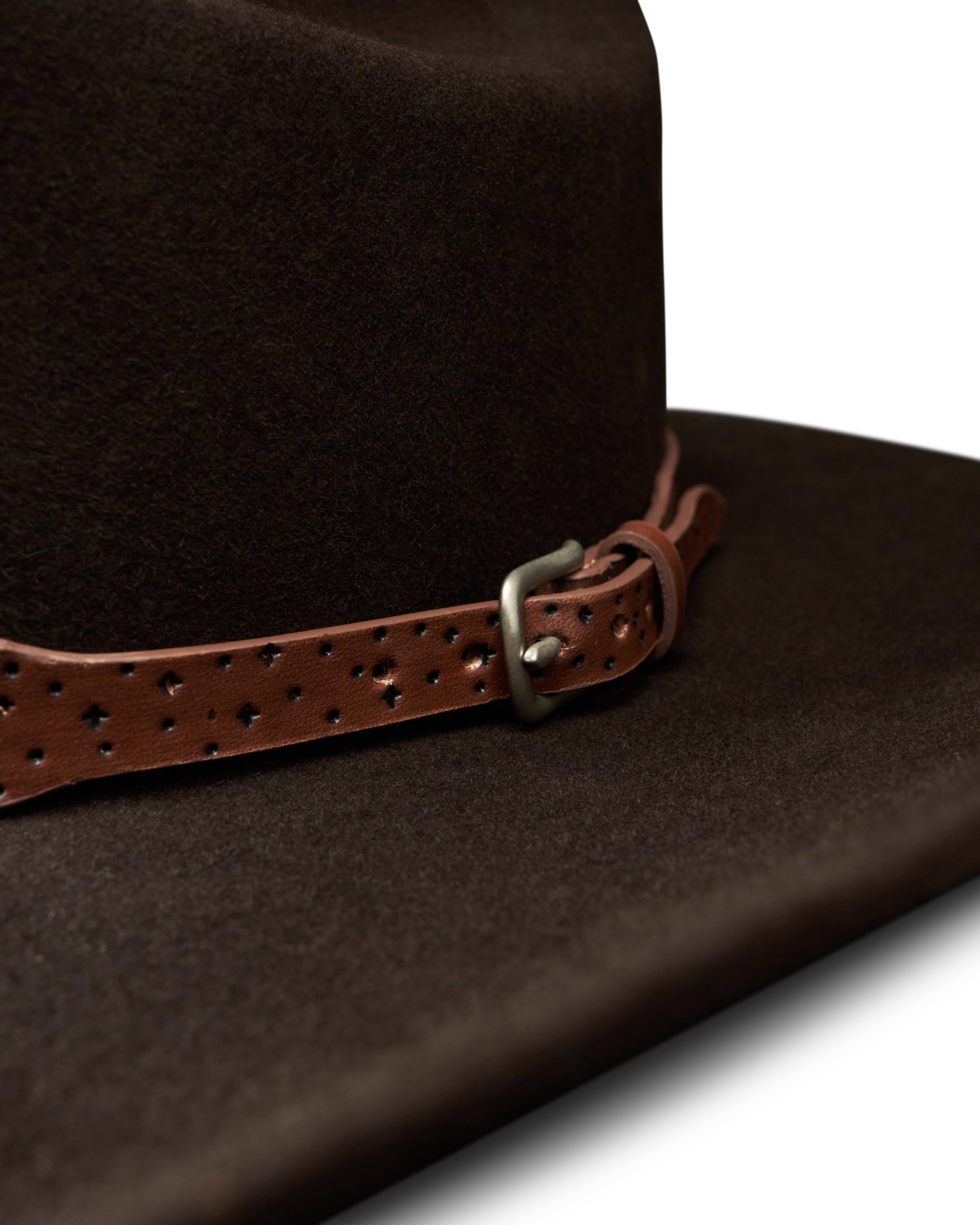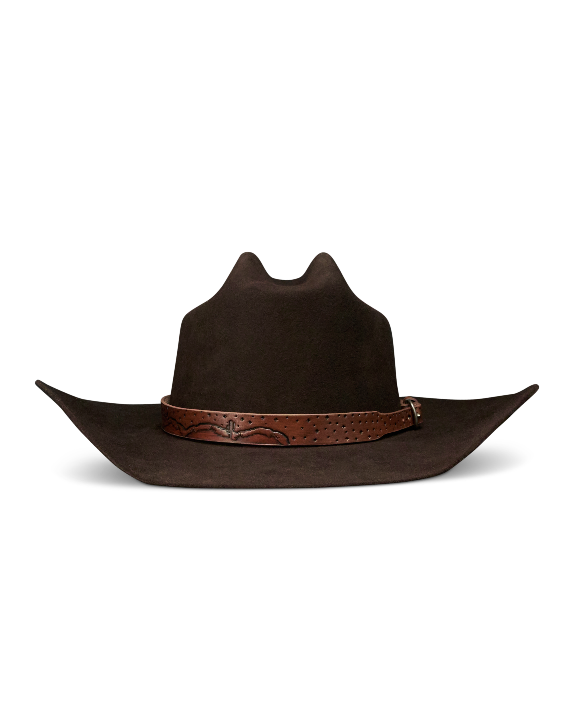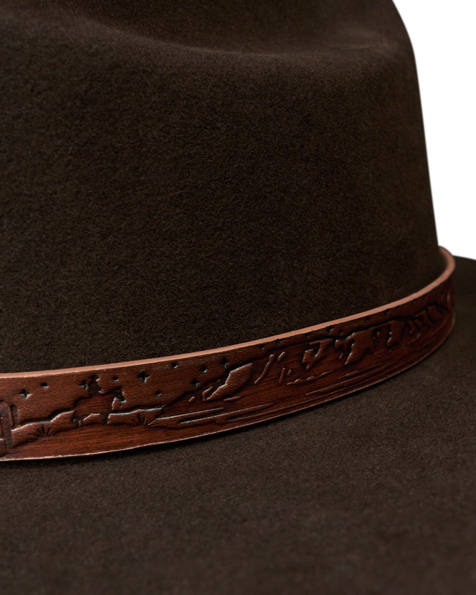 To celebrate ten years of Tecovas, we elevated our classic Cattleman Hat to honor the journey that brought us here. This limited-edition design updated with beaver blend felt features a cowhide hat band embossed with the Palo Duro landscape and night sky, and a satin-stitch interior lining that mirrors the original artwork on the Birthday X Wild Rag Scarf.
