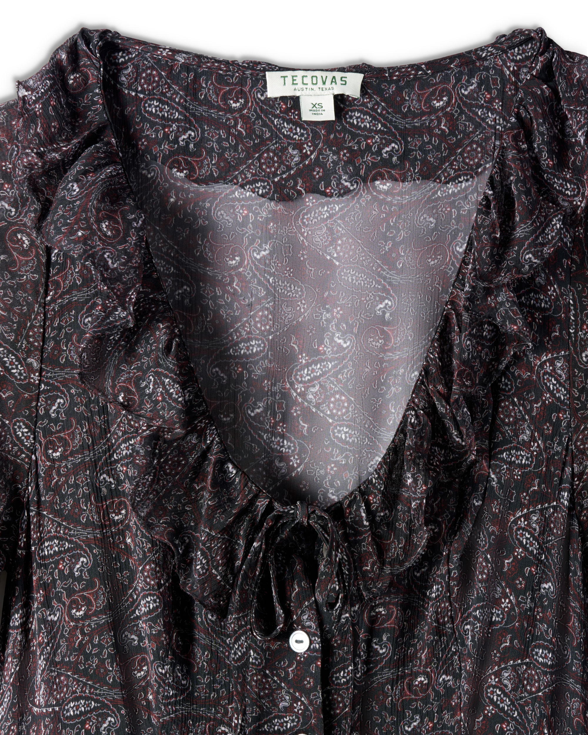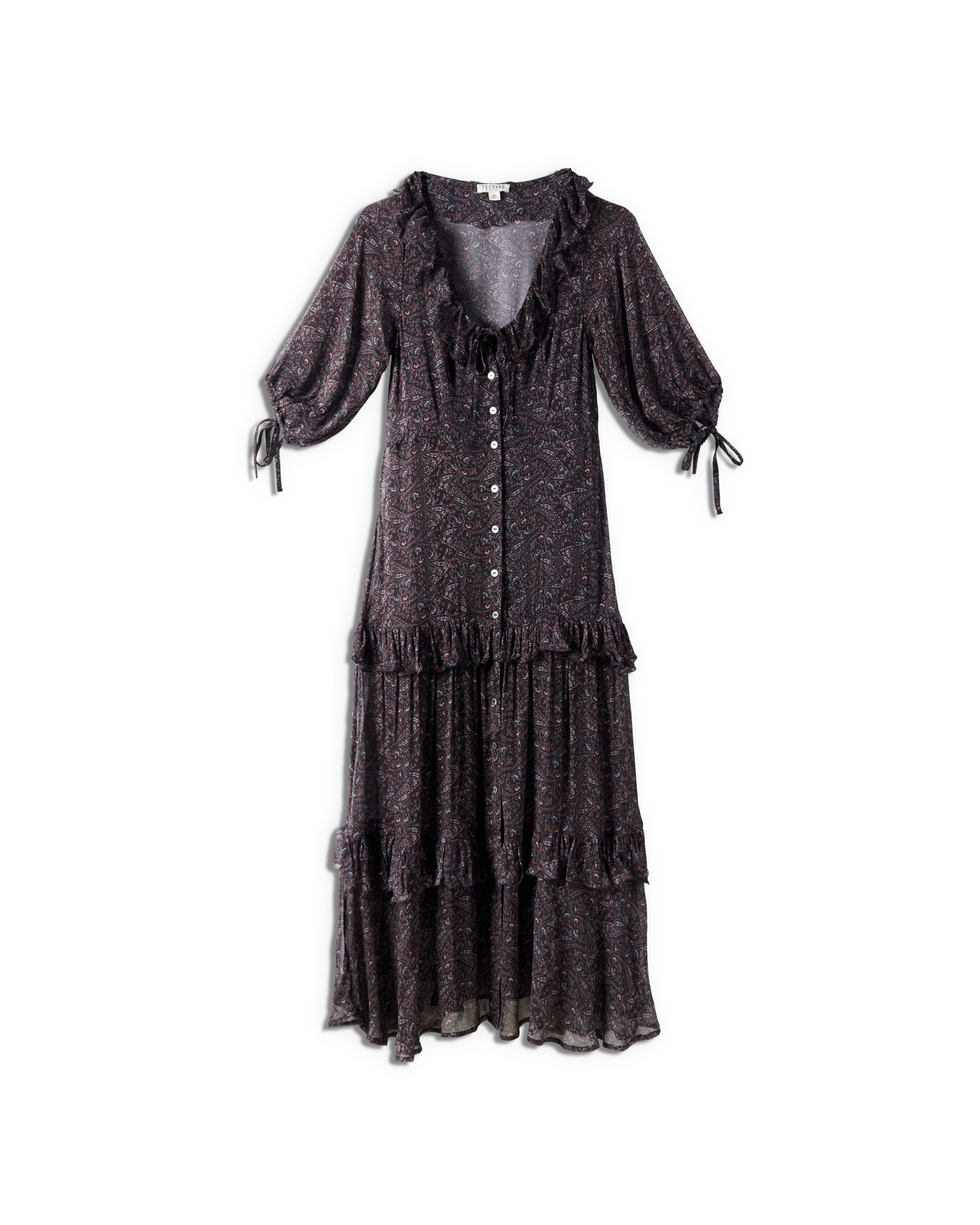 Made for movement—and making an entrance. This elbow-length maxi dress comes in two custom prints and a sheer viscose fabric that feels effortlessly elevated. Feminine ruffles, puff sleeves, and delicate picot edging bring the charm, while a full slip keeps it bra-friendly and easy to wear. Adjustable sleeve ties and a front button placket let her style it her way—buttoned-up or a little bold. Pair it with boots or dress it up; either way, this one turns heads.