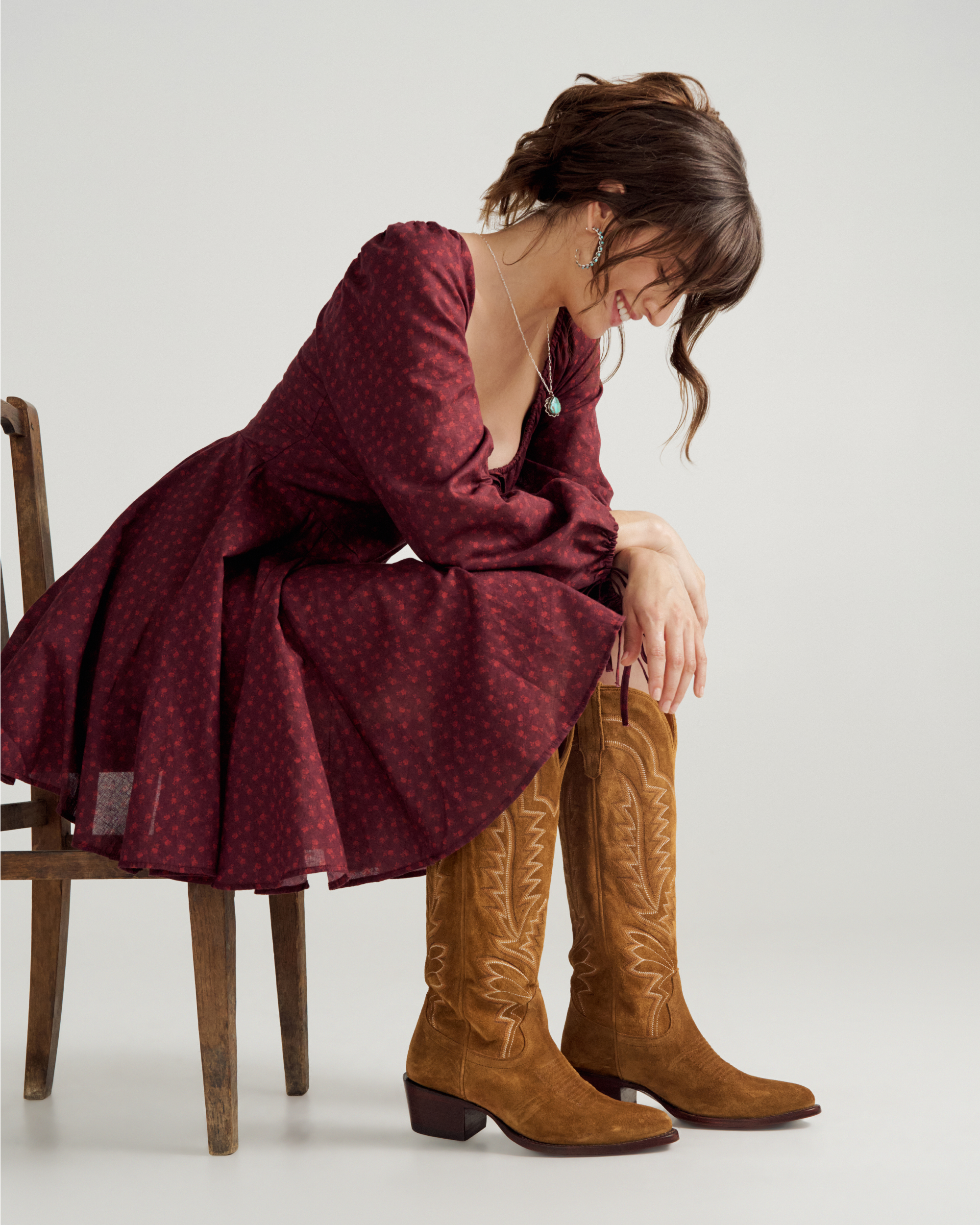 Cooler days, crisp nights, and a dress that does both. With a custom print, sculpting corset-inspired seams, and soft puff sleeves, this breathable cotton-linen mini is made to turn heads—and keep you comfortable. Finished with thoughtful touches like bra-strap tabs and self ties, it’s ready for tall boots, trucker jackets, and wherever the season takes you.