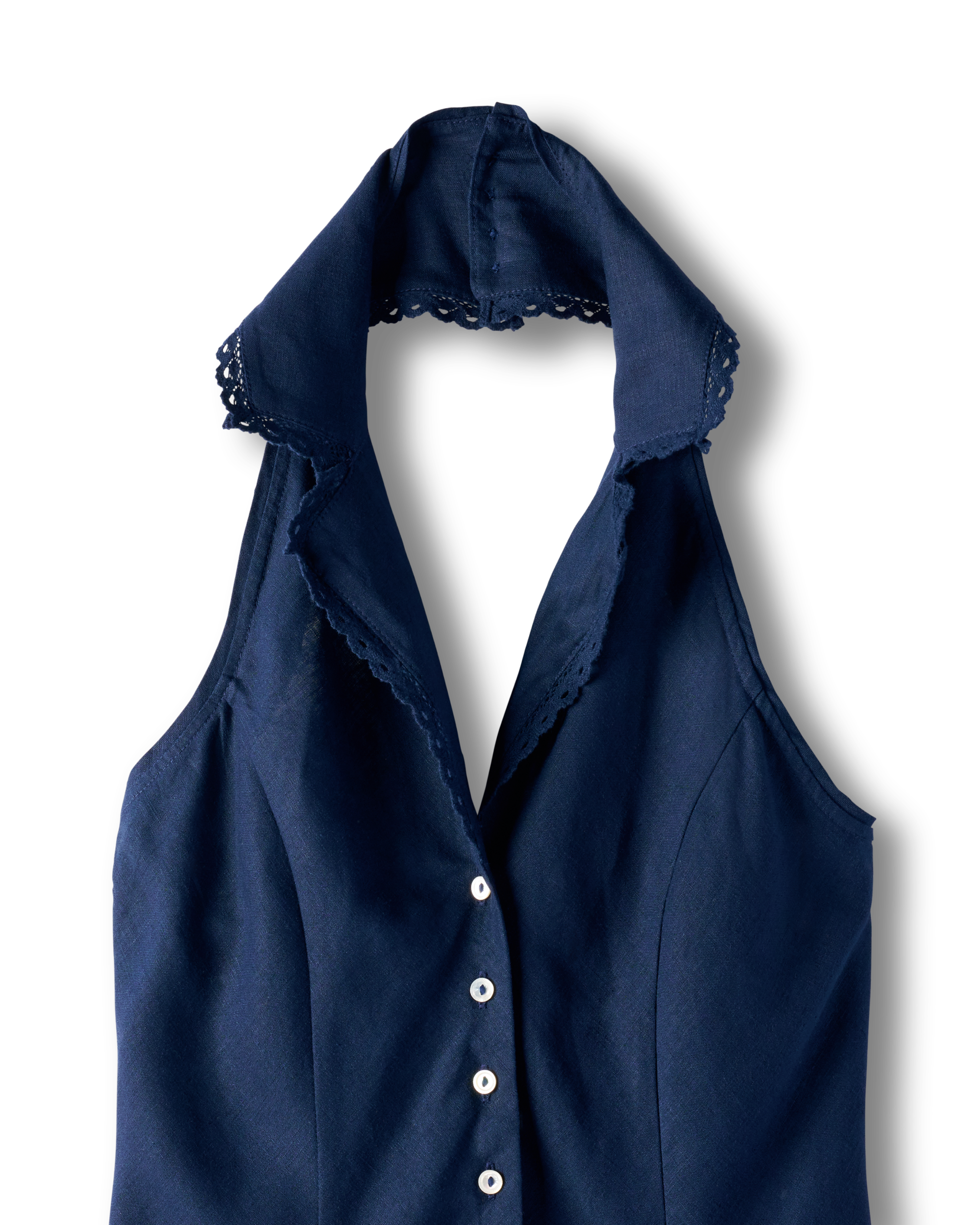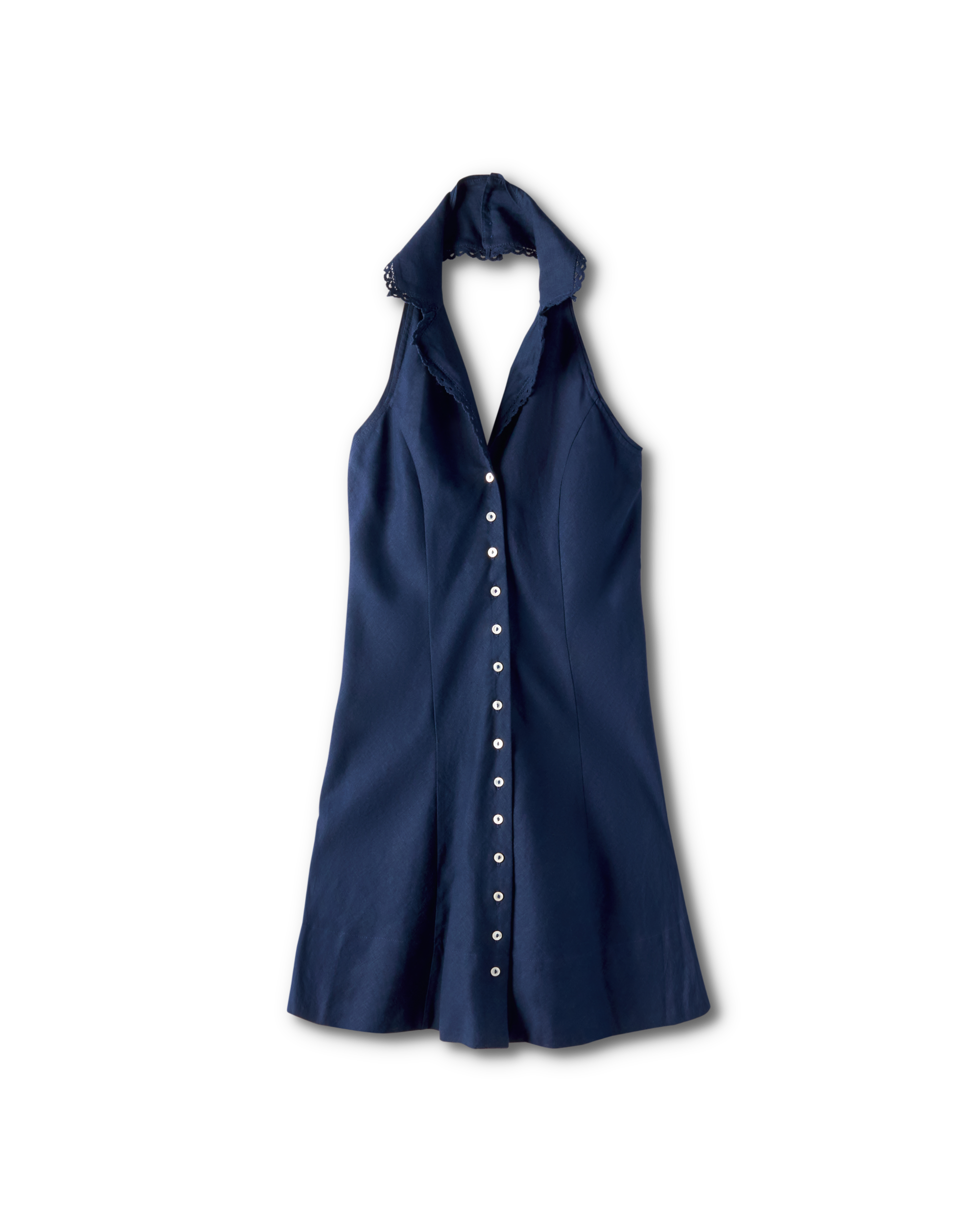 Crafted from a lightweight linen blend, this breezy silhouette is perfect for sunny adventures. The halter neckline beautifully frames the face and highlights the collarbone, while the mini length lets you show off your favorite boots. Available in two vintage-inspired custom prints, each design speaks to our Western DNA in a fresh, wearable way. The bold red spur print offers a playful nod to classic cowboy heritage, while the purple floral version adds a soft, feminine touch with intricate lace details. This dress is a go-to for any warm-weather occasion.