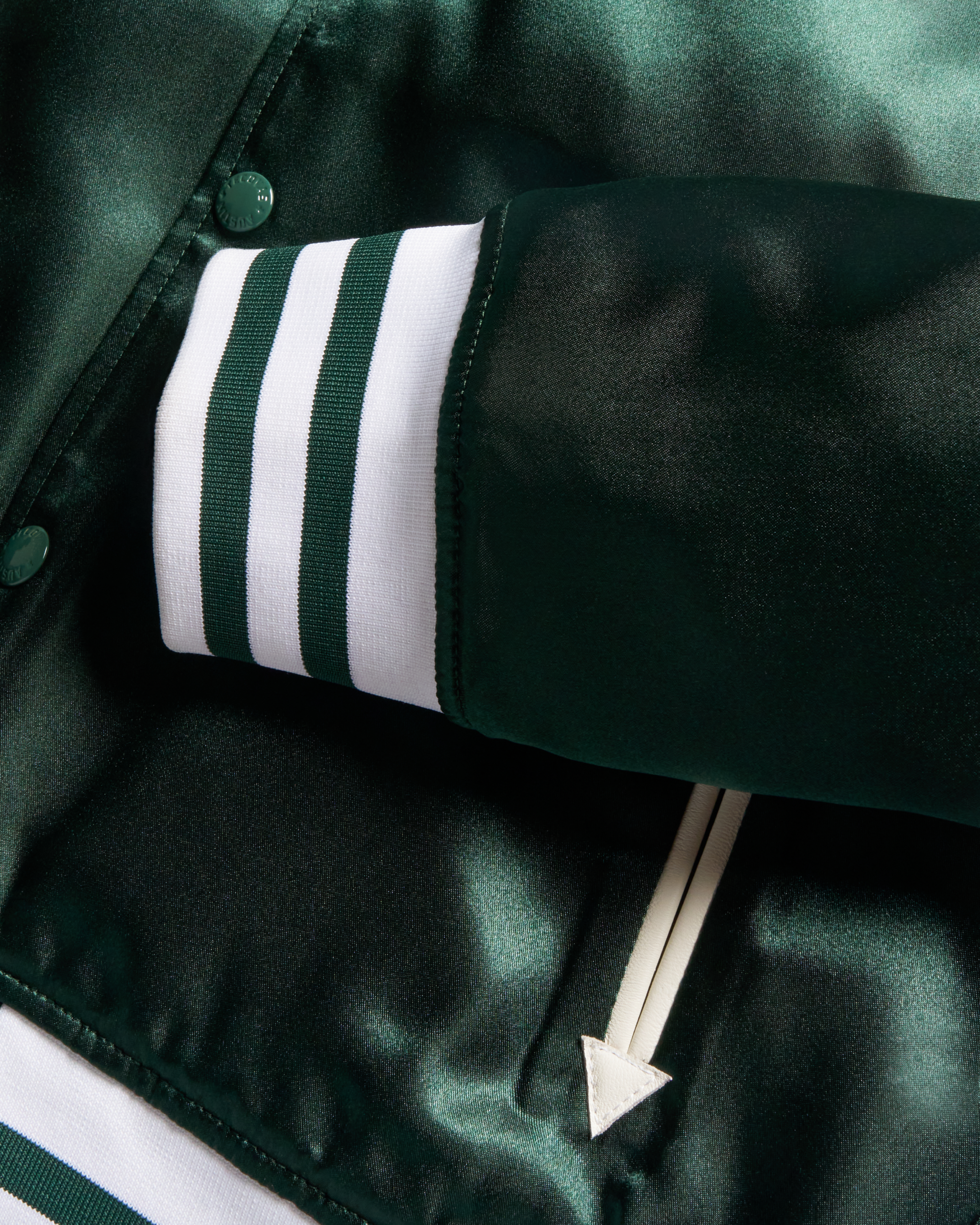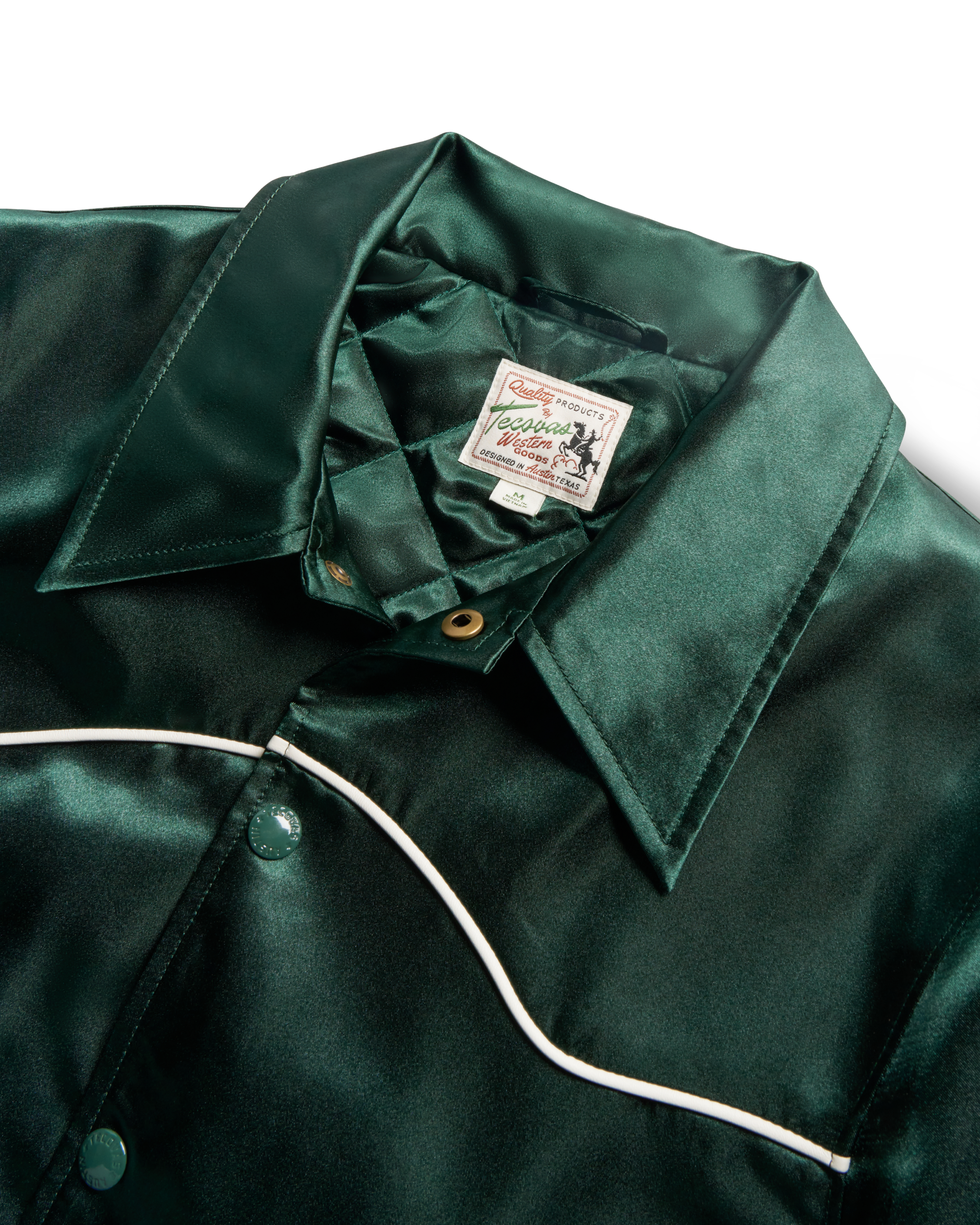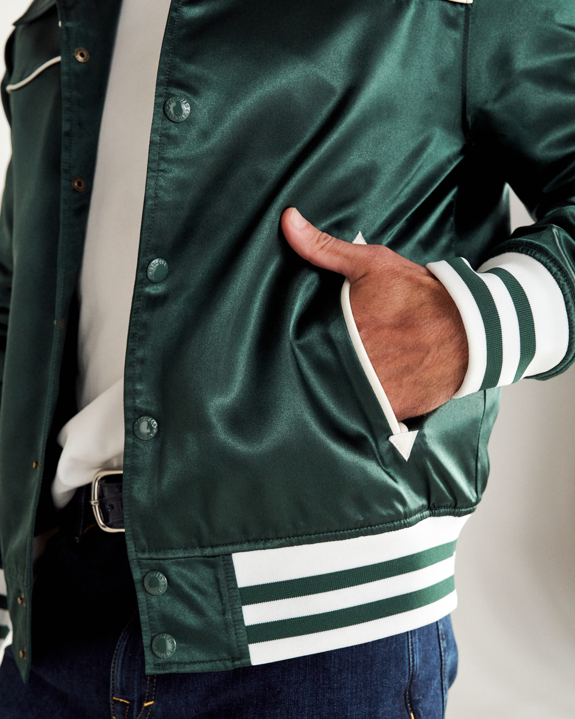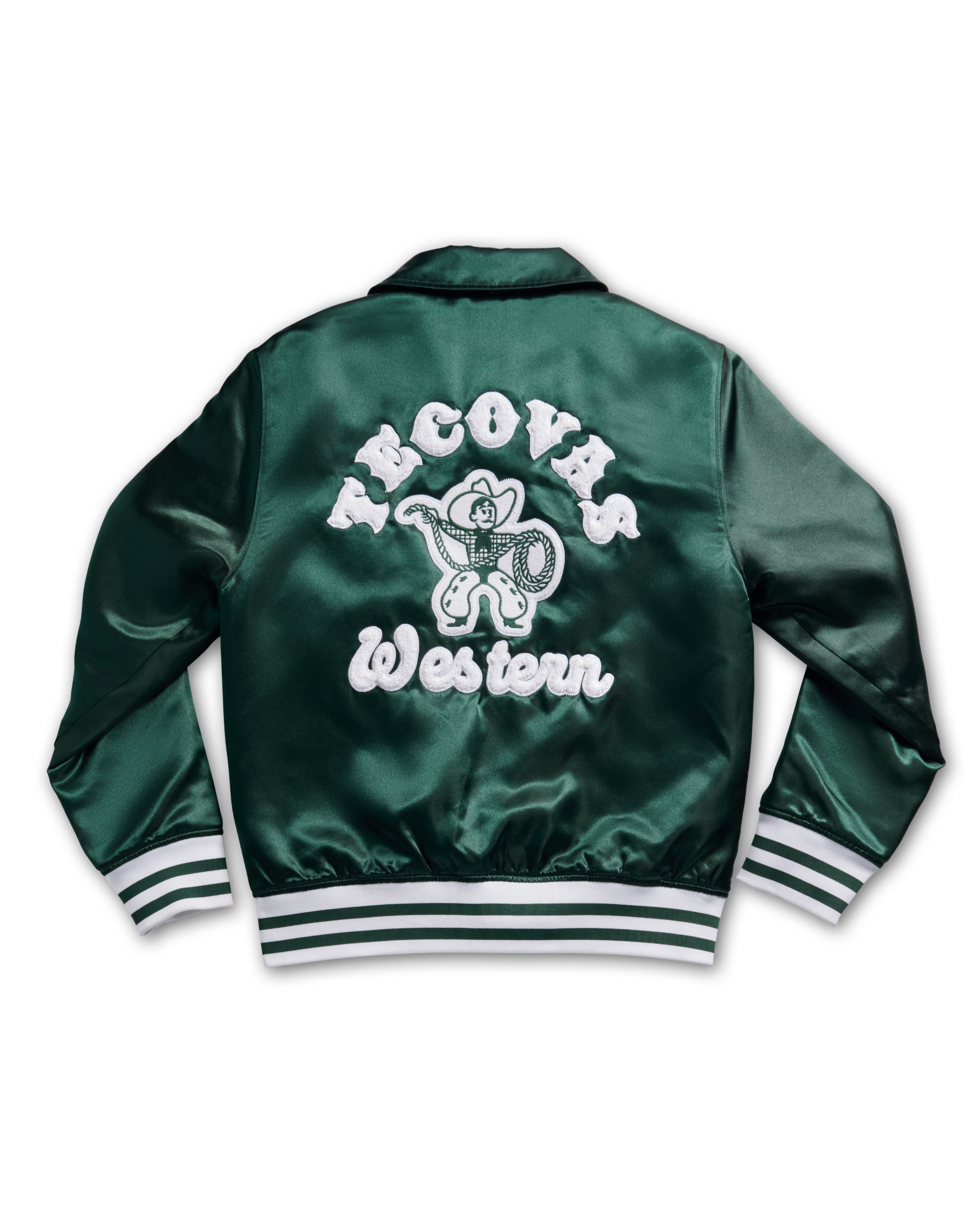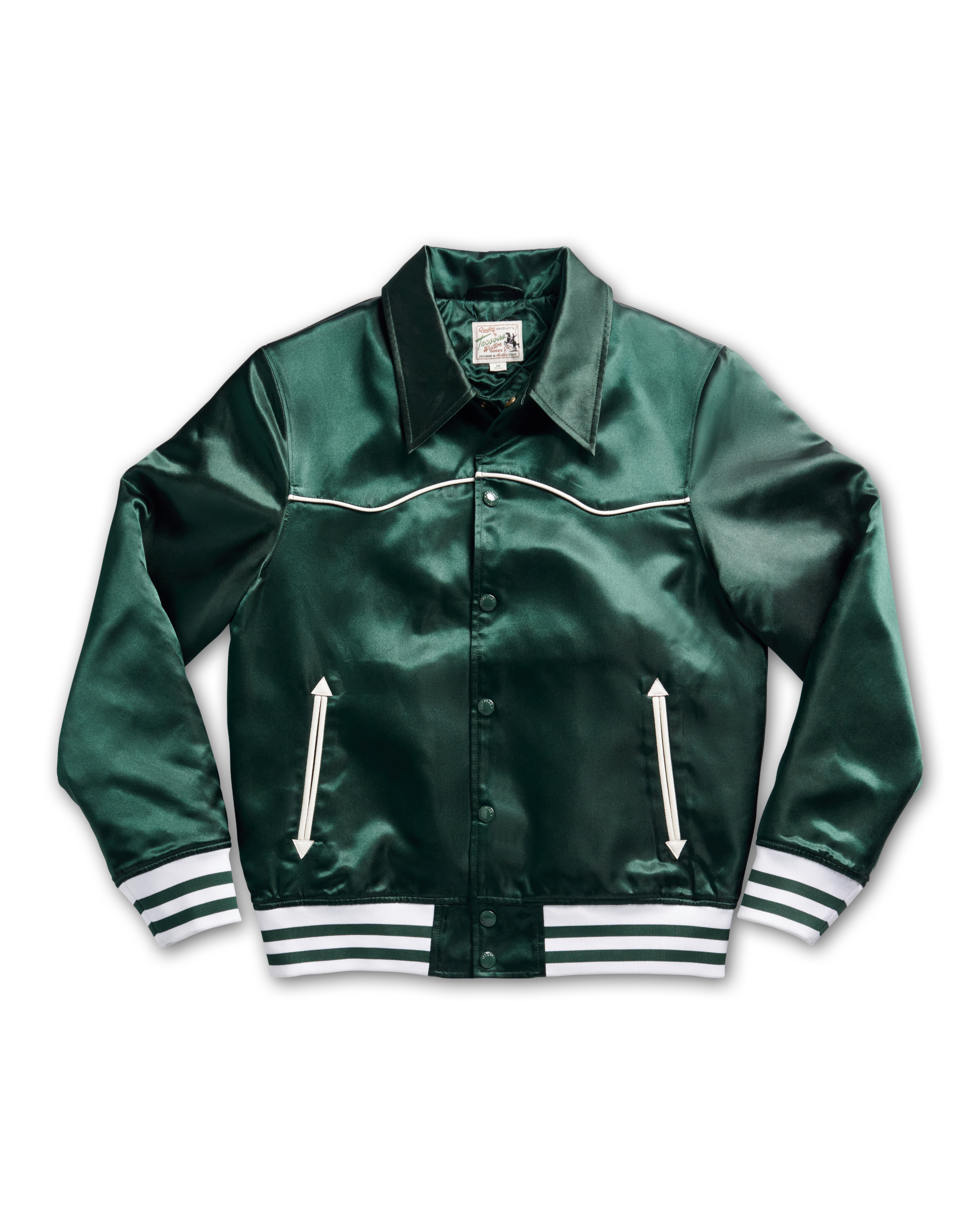 Whether youโre heading to the rodeo, a live show or a rollicking night out on the town, the Varsity Jacket brings Western flair to a traditional silhouette in a way that will draw eyes and compliments. Its satin finish makes a bold first impression and embroidered smile pockets, Western yoke trim, and varsity letter and patch logo on the back add texture and design detail. Itโs a fun piece made for good times.