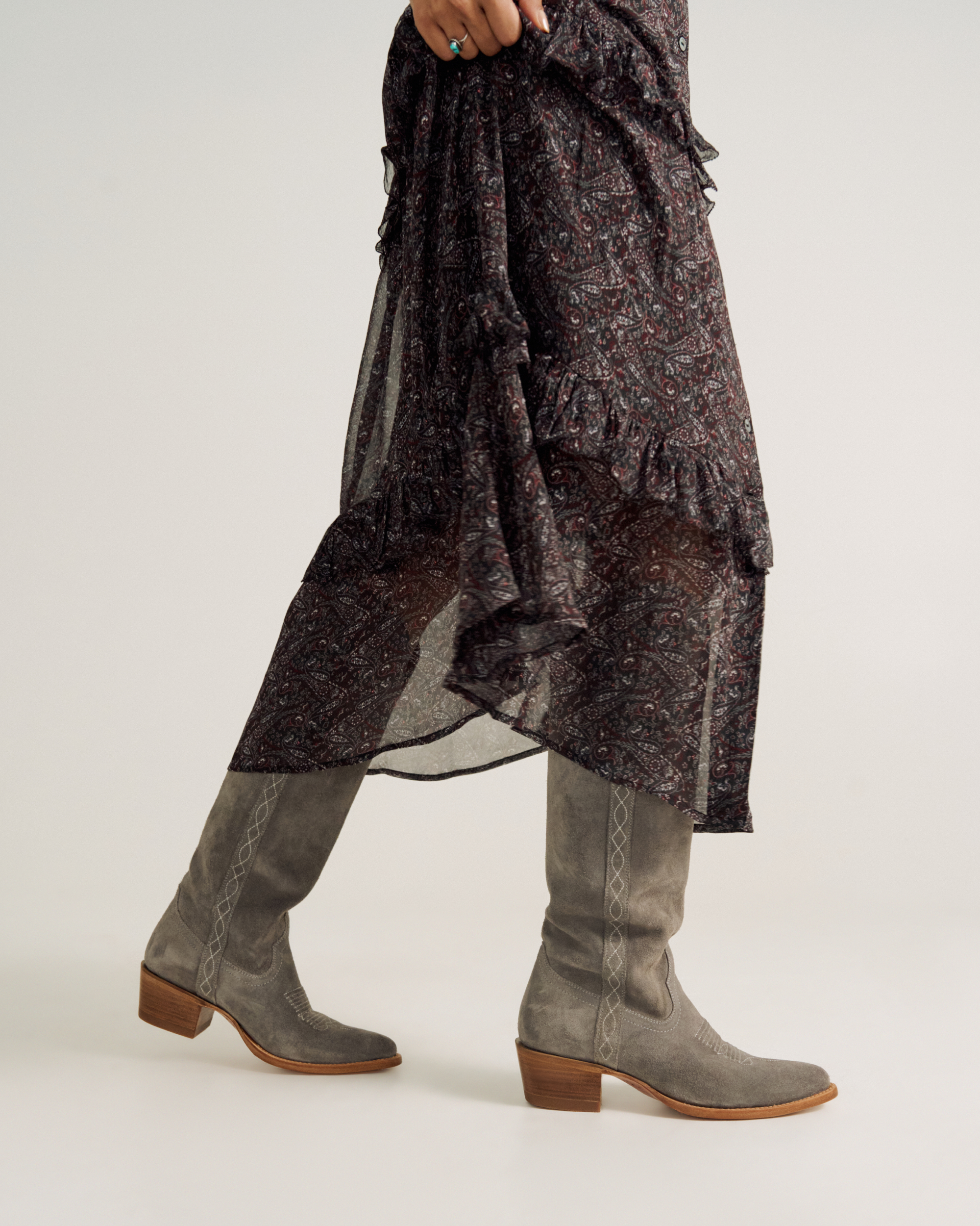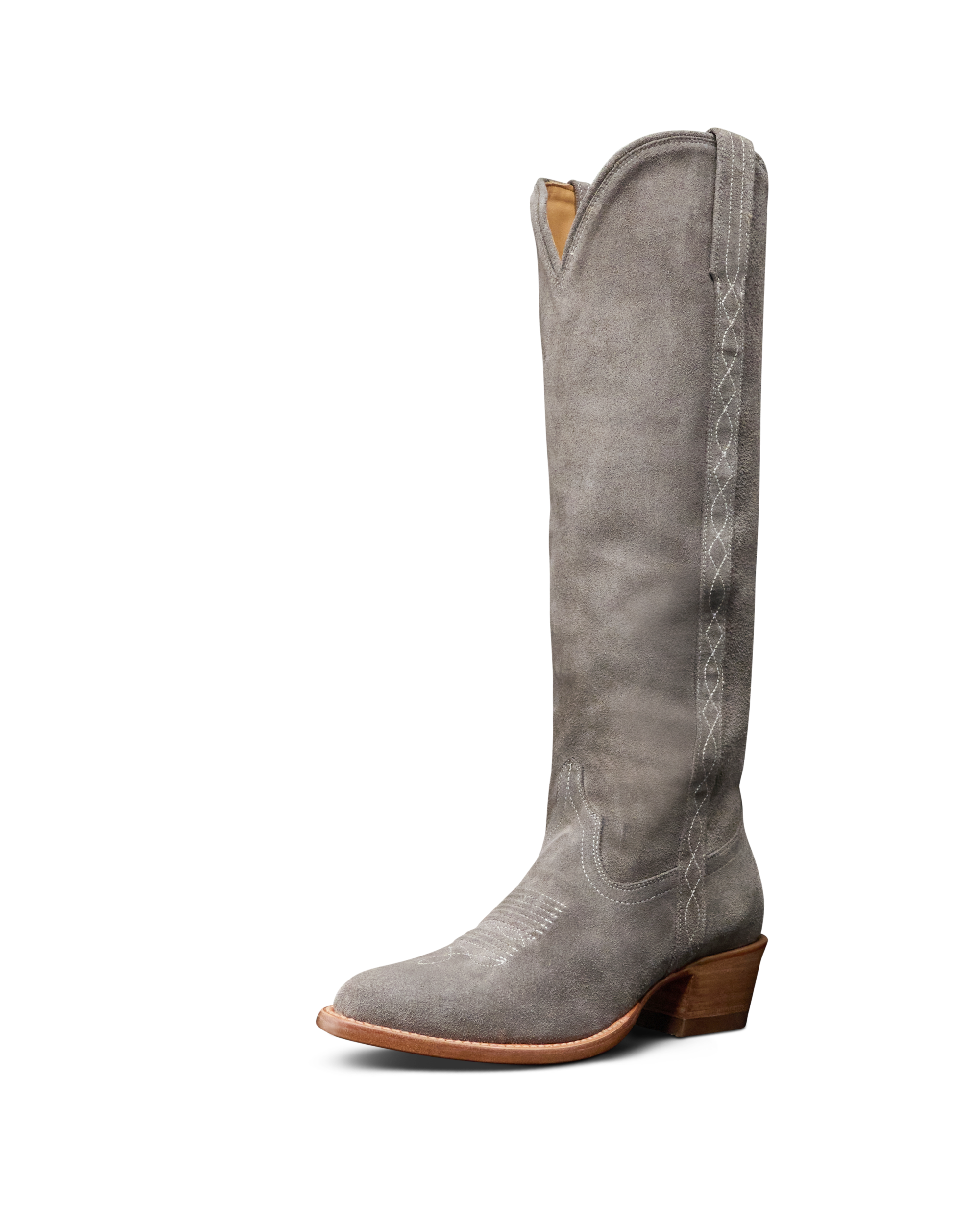 Stride confidently in The Abby Cavalier, a sleek boot that with endless versatility. Its clean 17” shaft, inspired by classic cavalier riding boots, offers a fresh take on The Abby. Subtle Western stitch lines run from welt to topline, adding elegant detail that complements the design. Made from suede treated for water resistance, this boot boasts a rich, luxurious look and feel. With a 2” heel and Tecovas’ signature toe bug, the Abby Cavalier elevates your style with timeless sophistication.