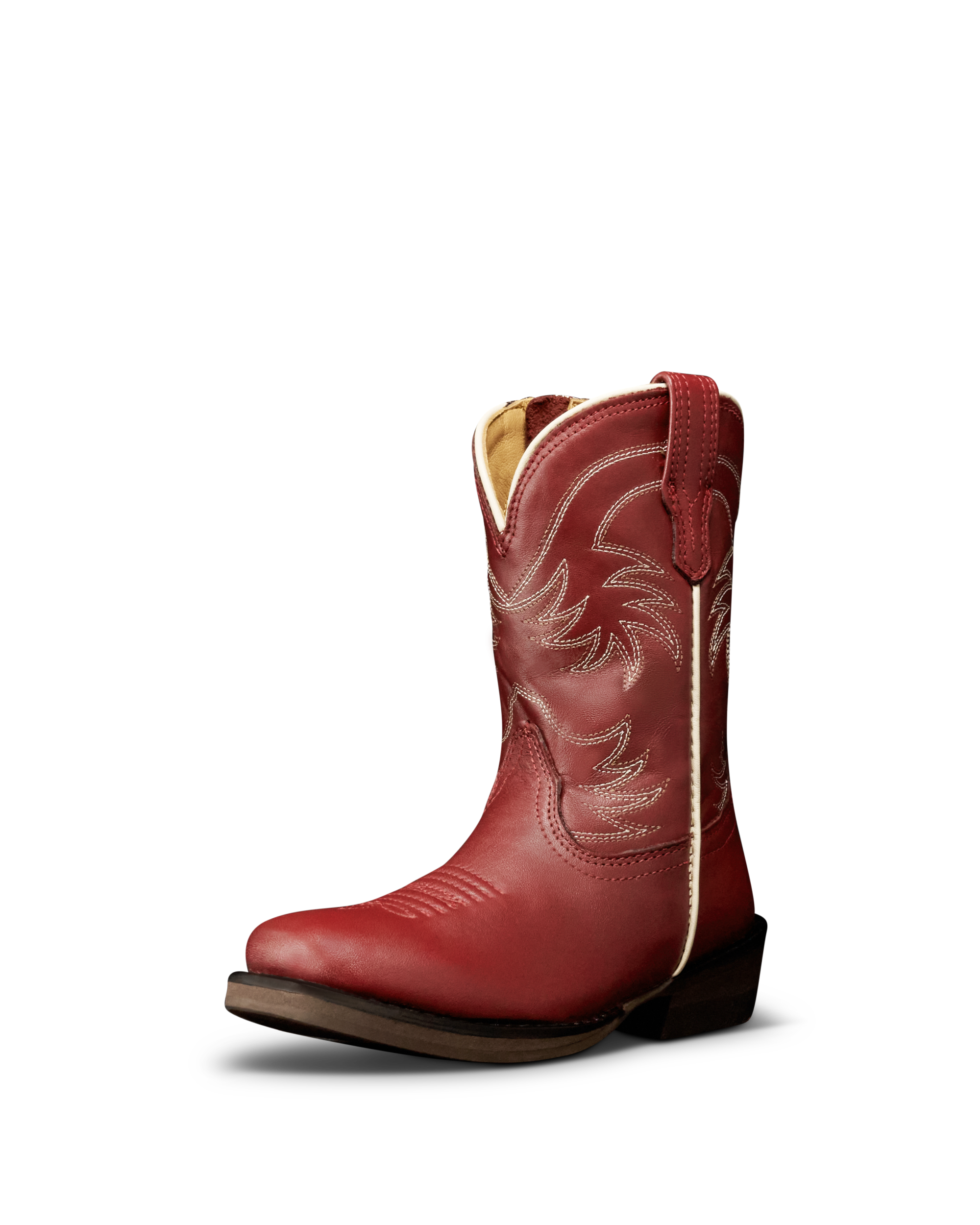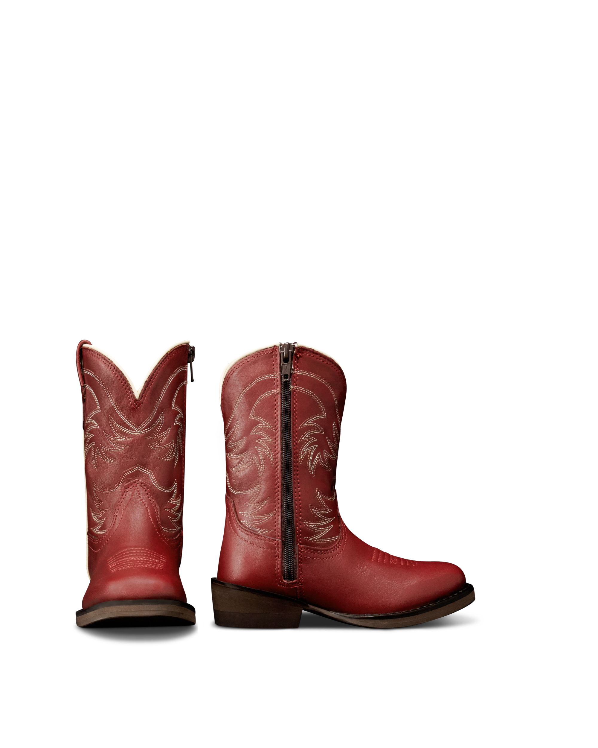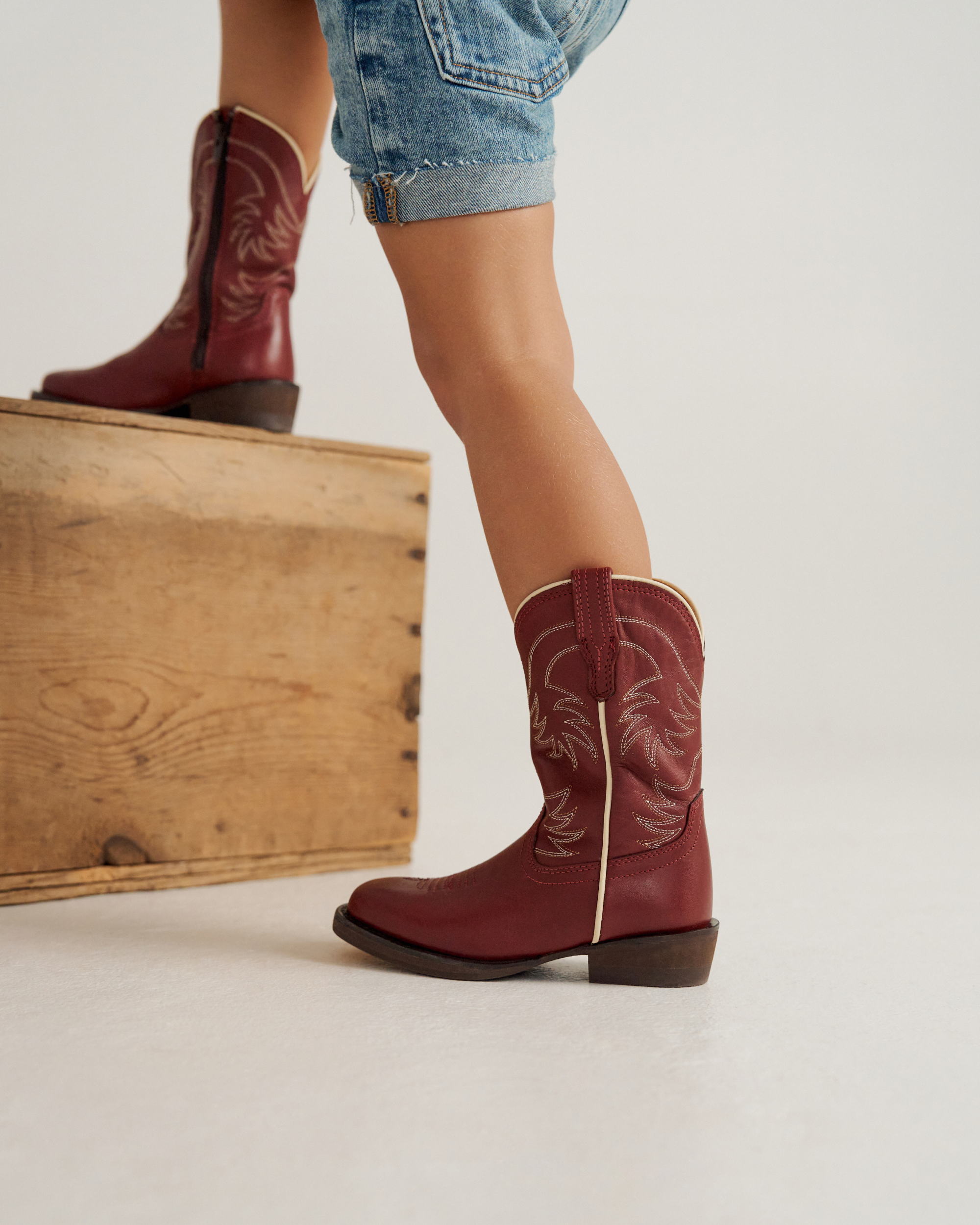 The Annie Toddler brings our best-selling cowgirl boot down to size — because style starts early. A 6” shaft with classic stitch detailing, sturdy square toe, and 1 ¼” rubber heel make it every bit the icon, just scaled for smaller strides. With a genuine leather collar, breathable mesh lining, and cushioned midsole, comfort keeps up with every move. Finished with an easy inside zipper and durable rubber outsole — it’s a fashion-forward first step into Western tradition.