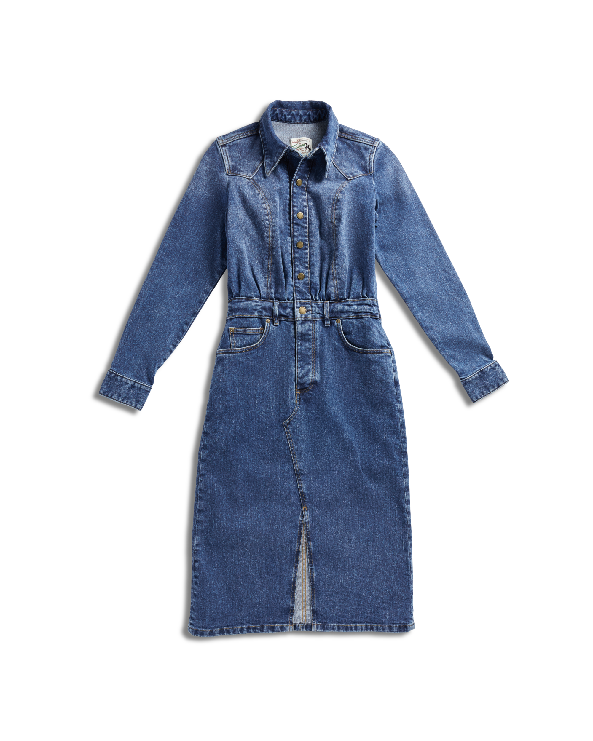 Made from a comfortable stretch denim blend, this dress features an easy fit through the top and a flattering, skimming shape through the skirt. Signature Western yokes and a front slit add movement and personality, while belt loops invite personal styling. Finished with Tecovas' custom, subtle lasso stitch on the back pockets, and a year-round medium wash, this is the denim dress that earns its place in every rotation — easy to wear to work, then dress up for a night out.