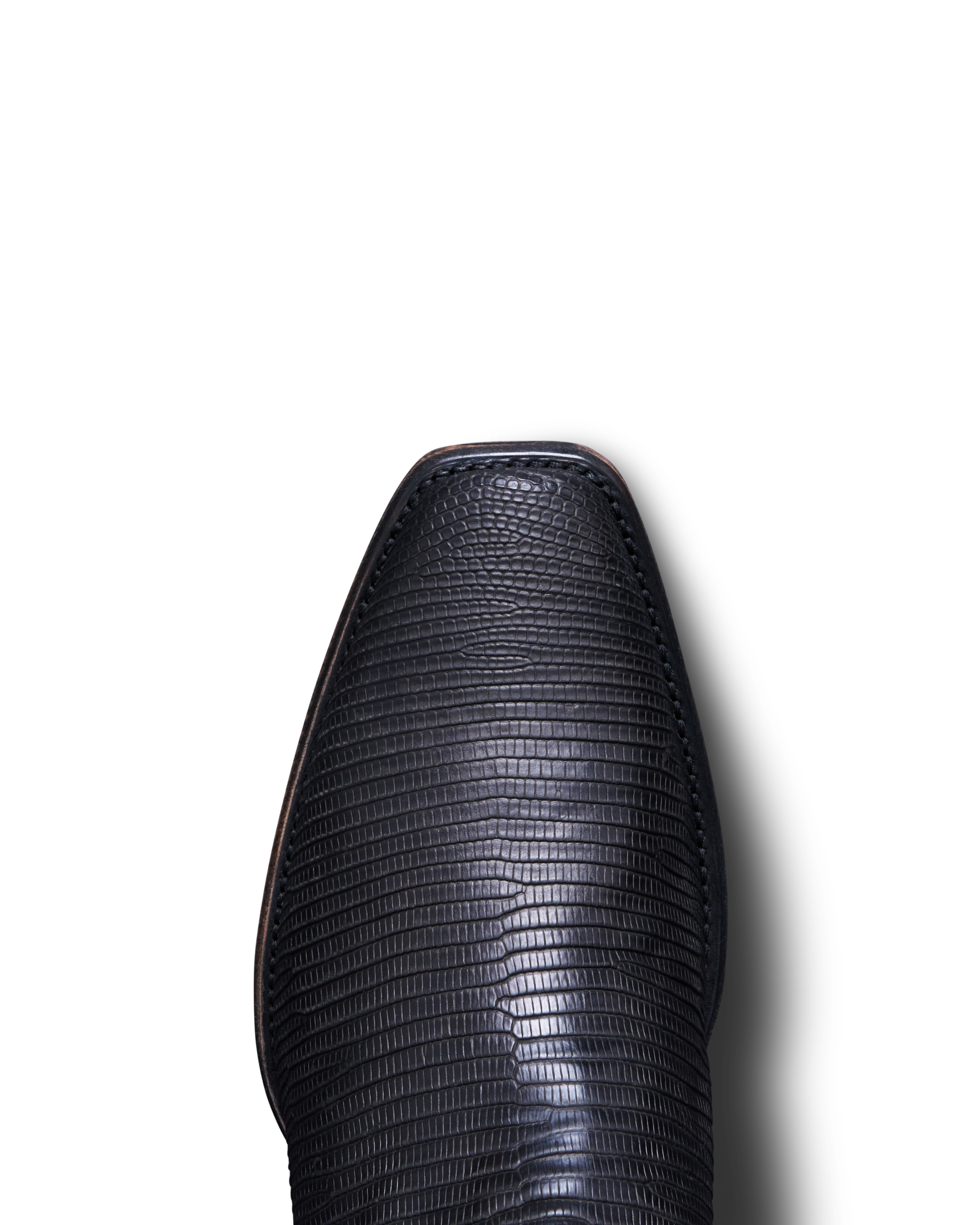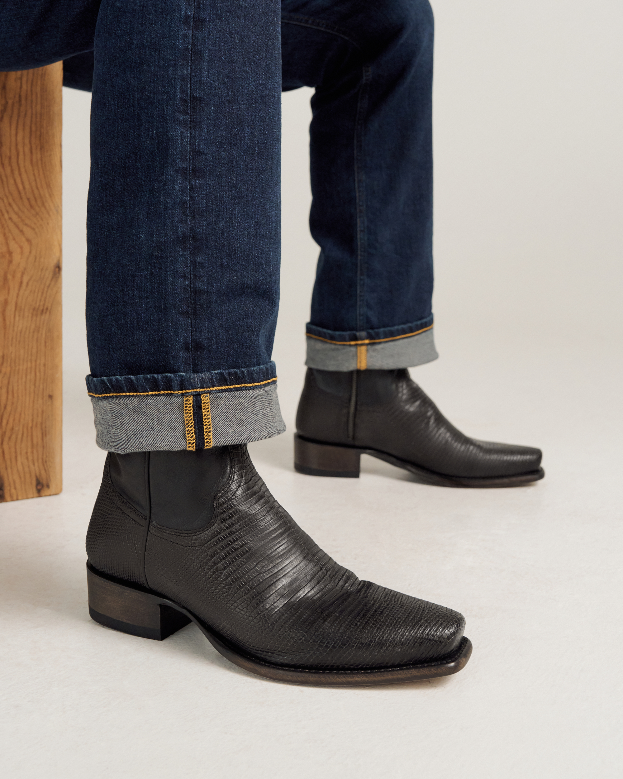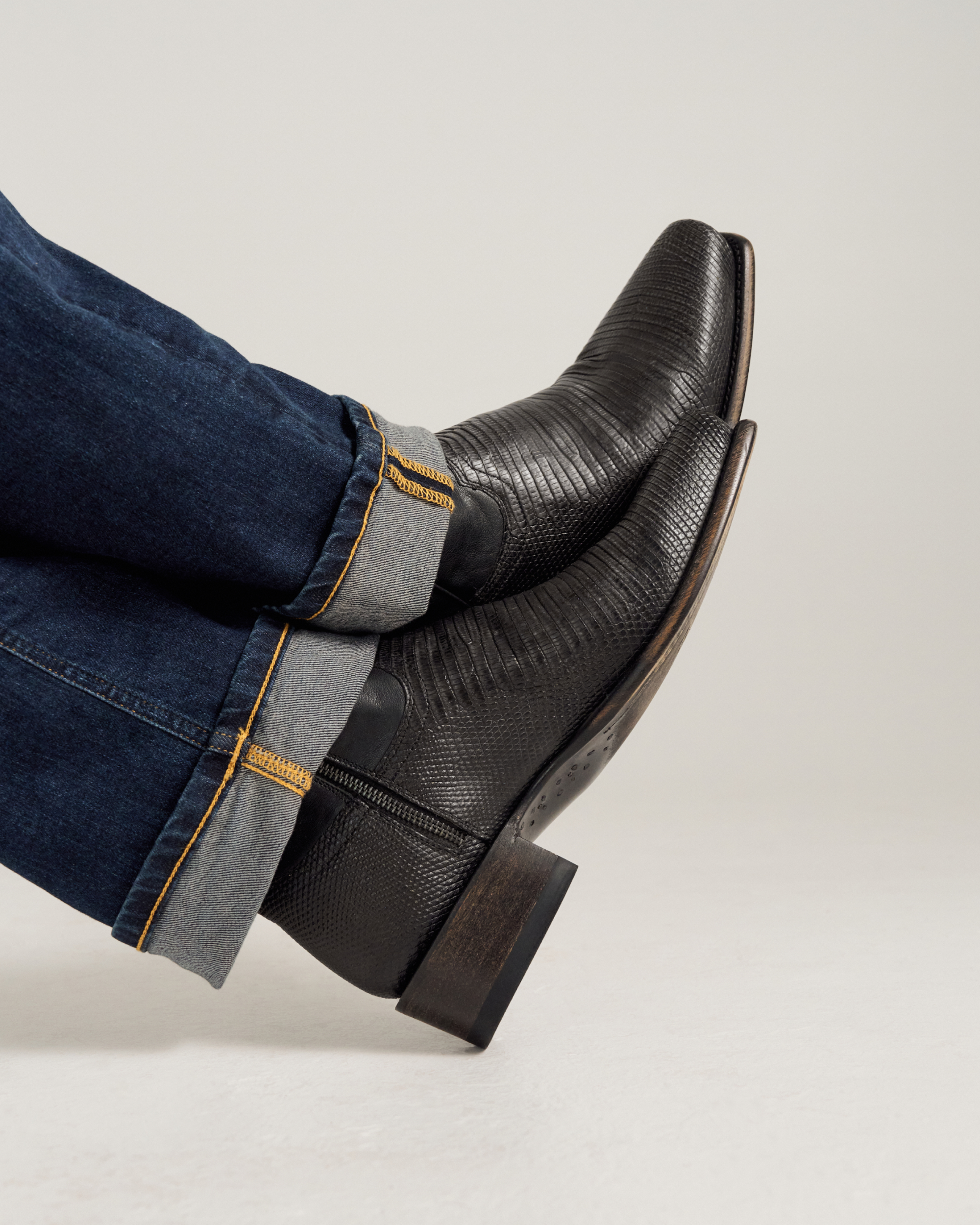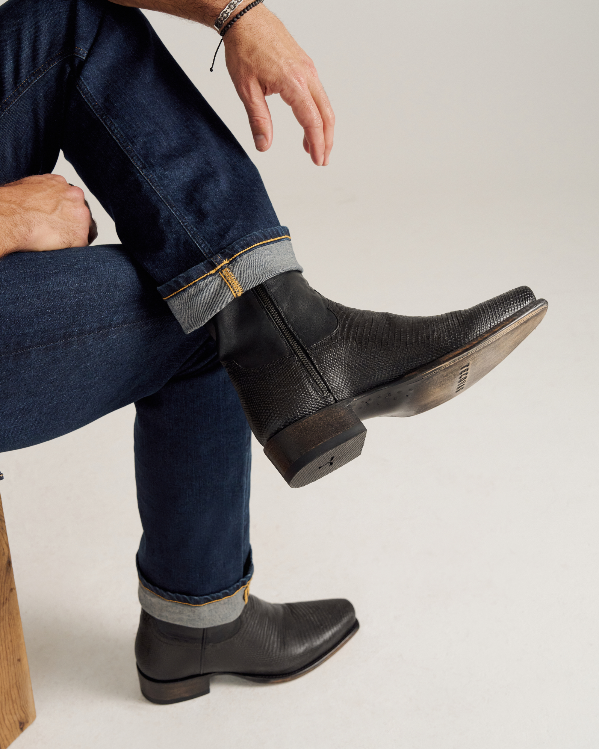 Our lizard of choice, Varanus salvator or water monitor is an exotic reptile hide that has a unique natural belly seam. When aligned on two boot vamps, it makes for a striking symmetrical look. Opt for our exclusive Relic finish for a boot that adds visual texture and wears its unique battle scars with pride.