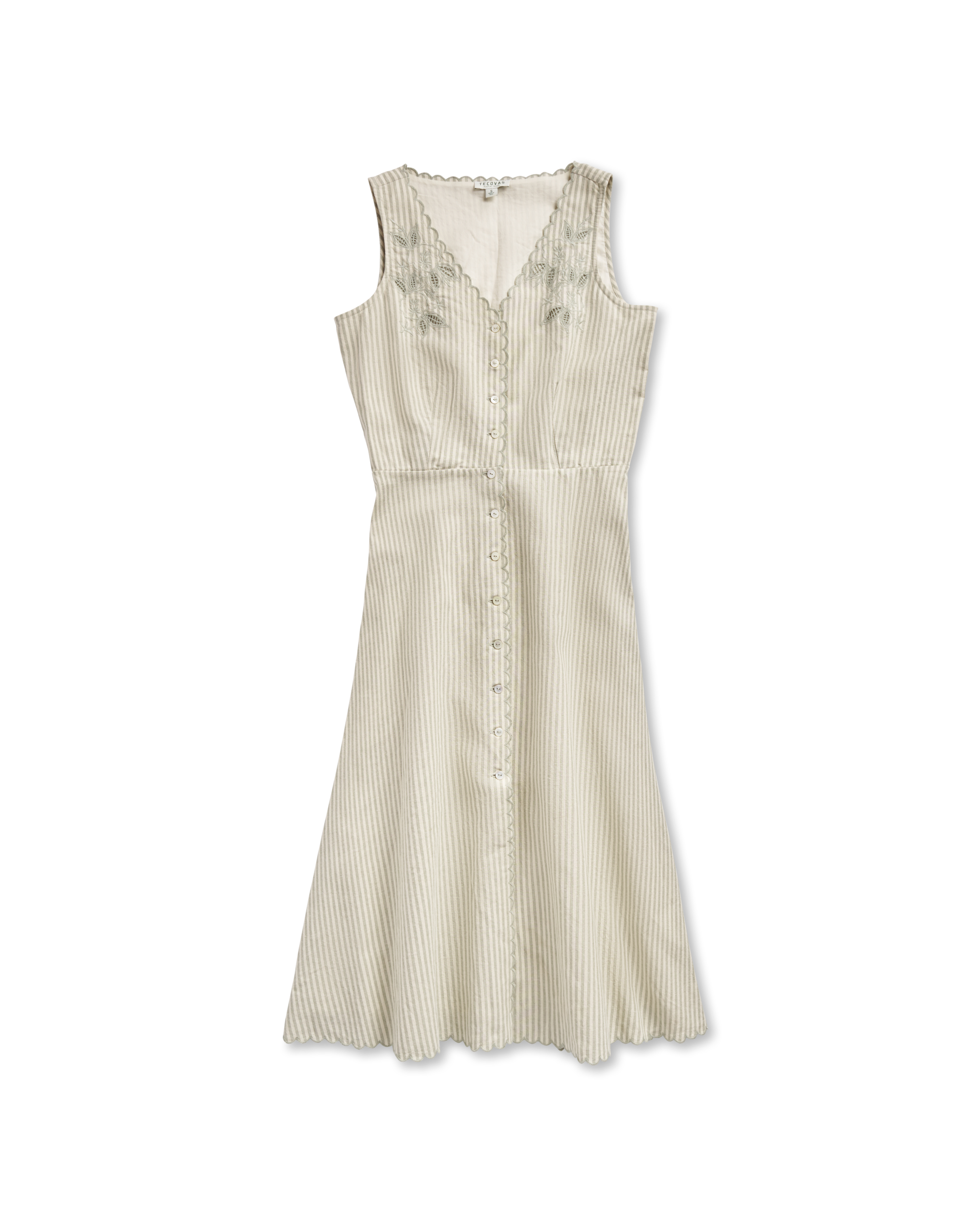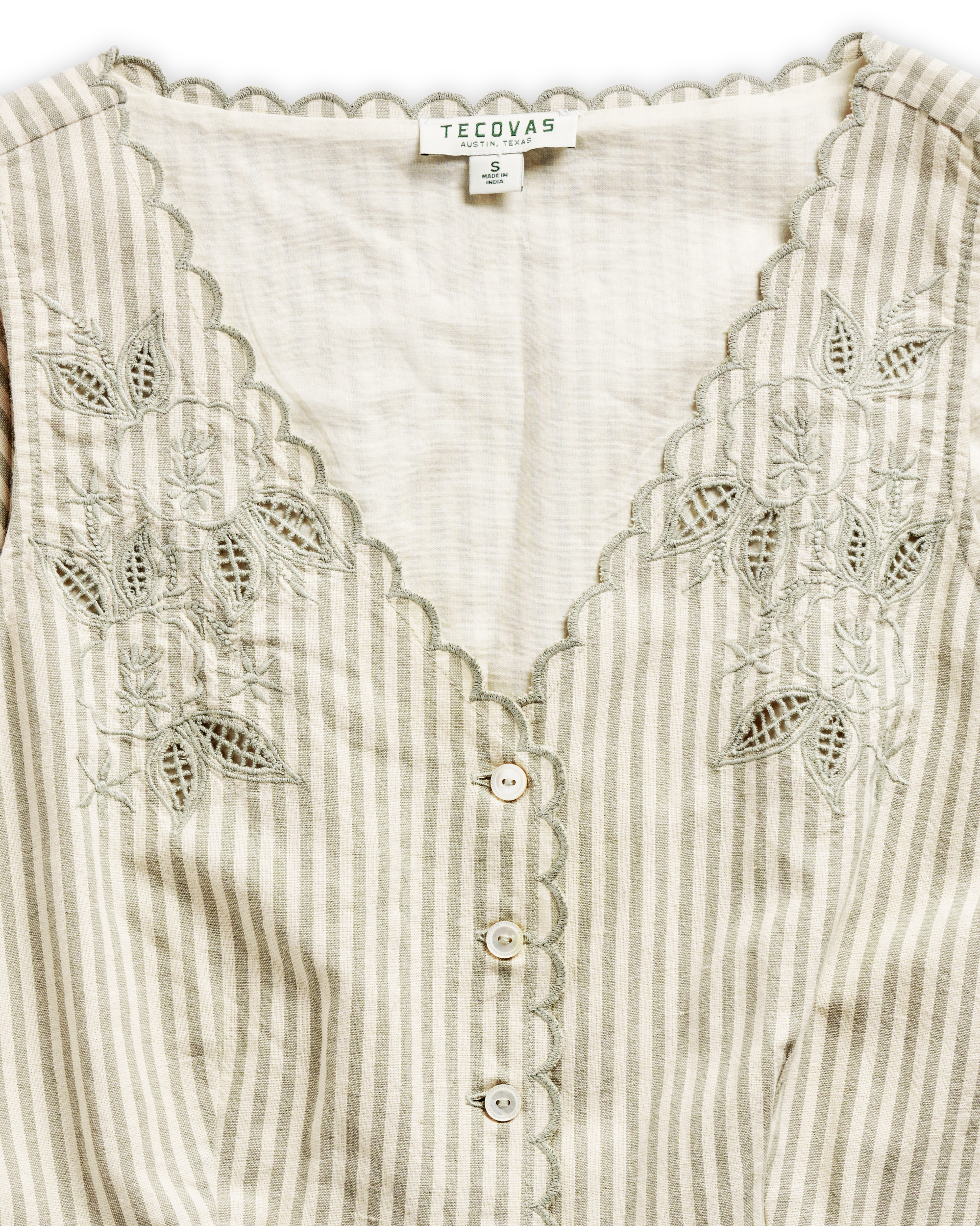 Crafted from a lightweight linen blend, this breezy midi is perfect for warm days and golden-hour moments. Scalloped edges and lace eyelet details add a touch of romance, while the button-front design lets you style it your way. The A-line silhouette flatters with a natural waist fit, and yesโit has pockets. Dress it up with boots or keep it casual with sandals; this oneโs a summertime staple.
