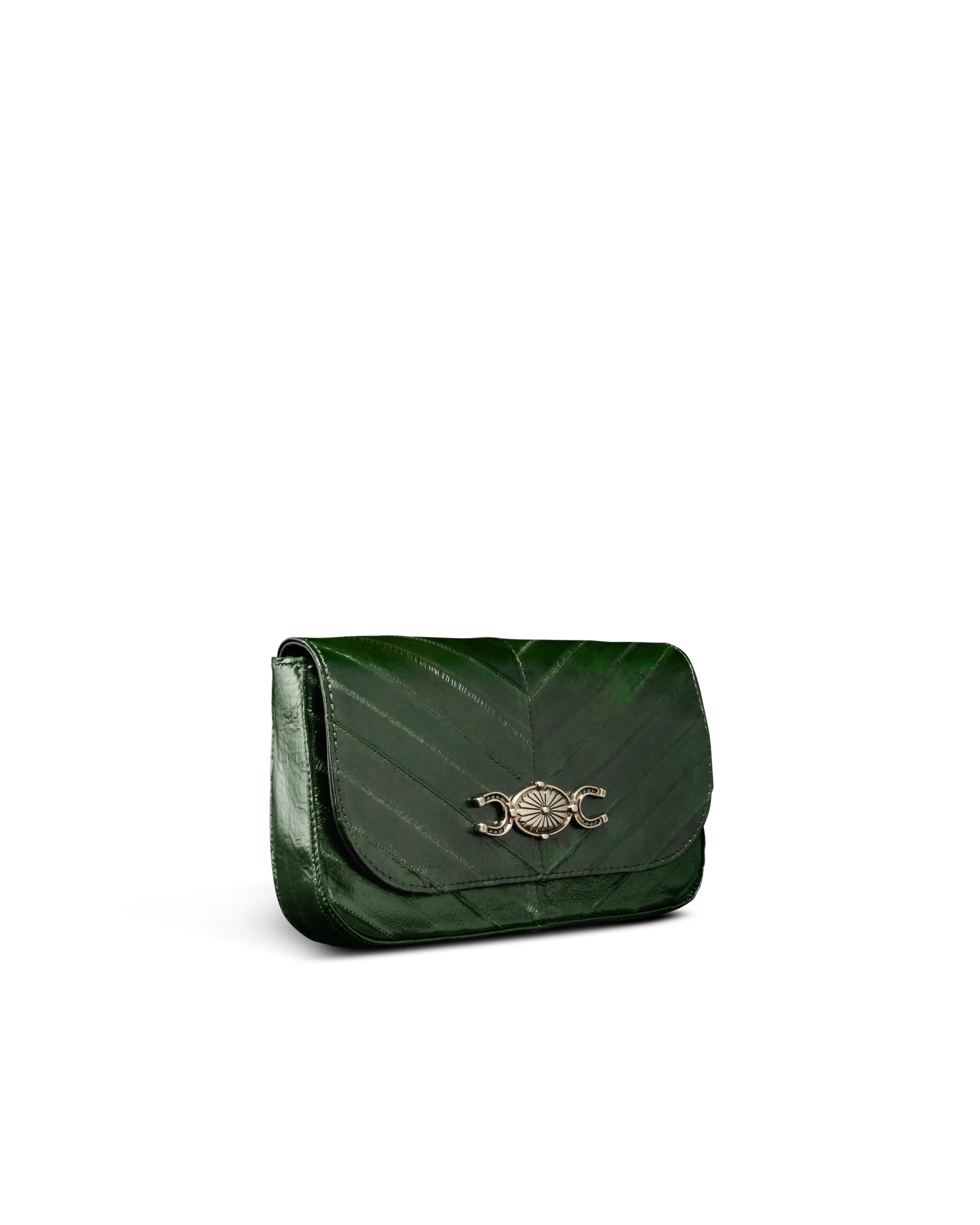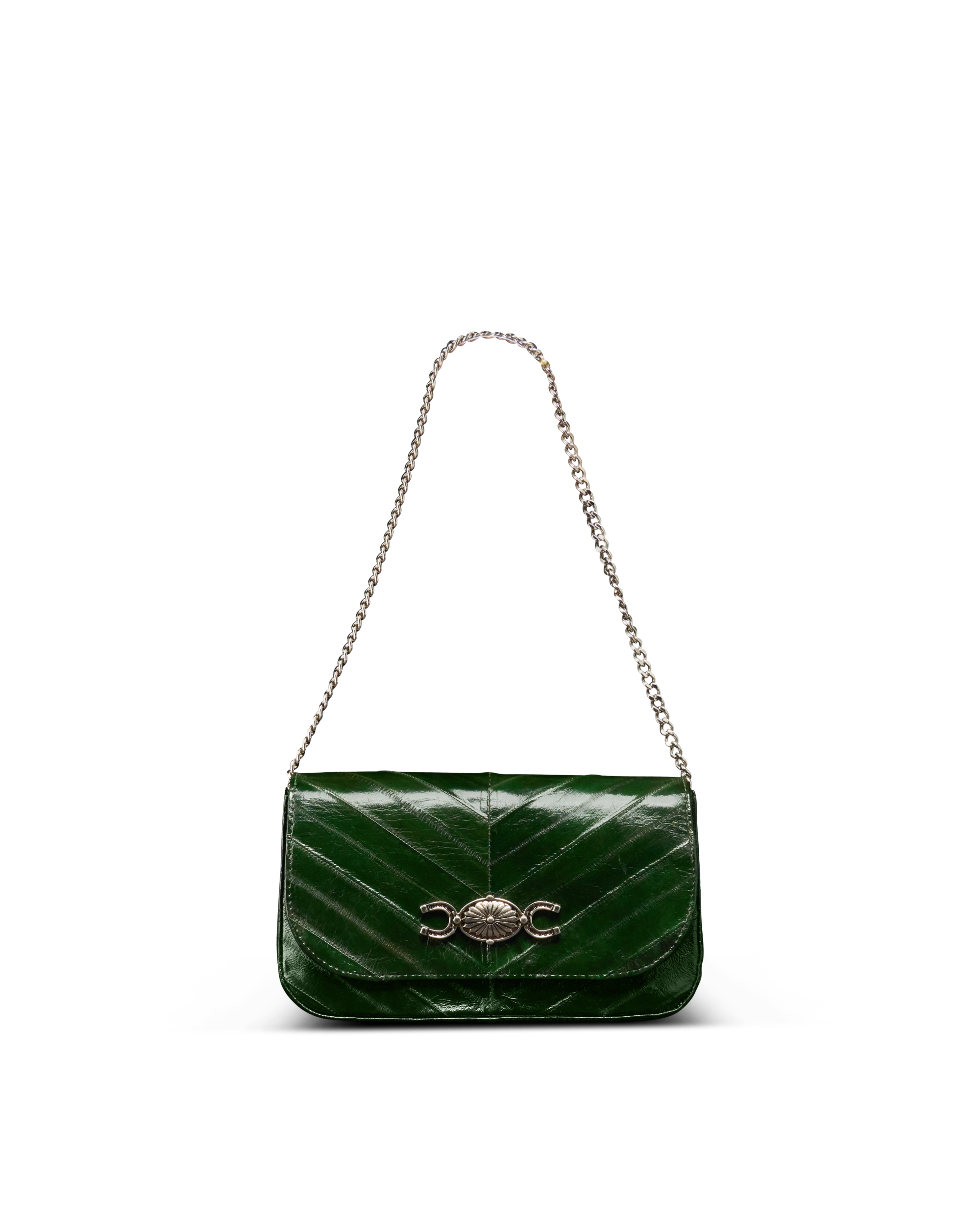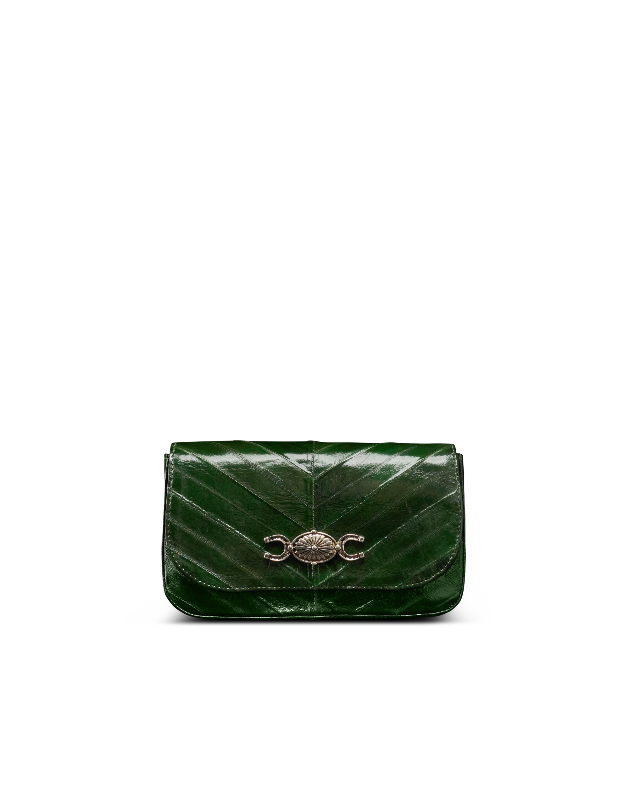 Crafted from glossy eel leather and finished with a custom horseshoe concho, this clutch blends heritage charm with modern sophistication. Designed to stand out without saying a word, it’s a bold yet timeless piece — perfect for nights out or standout moments.