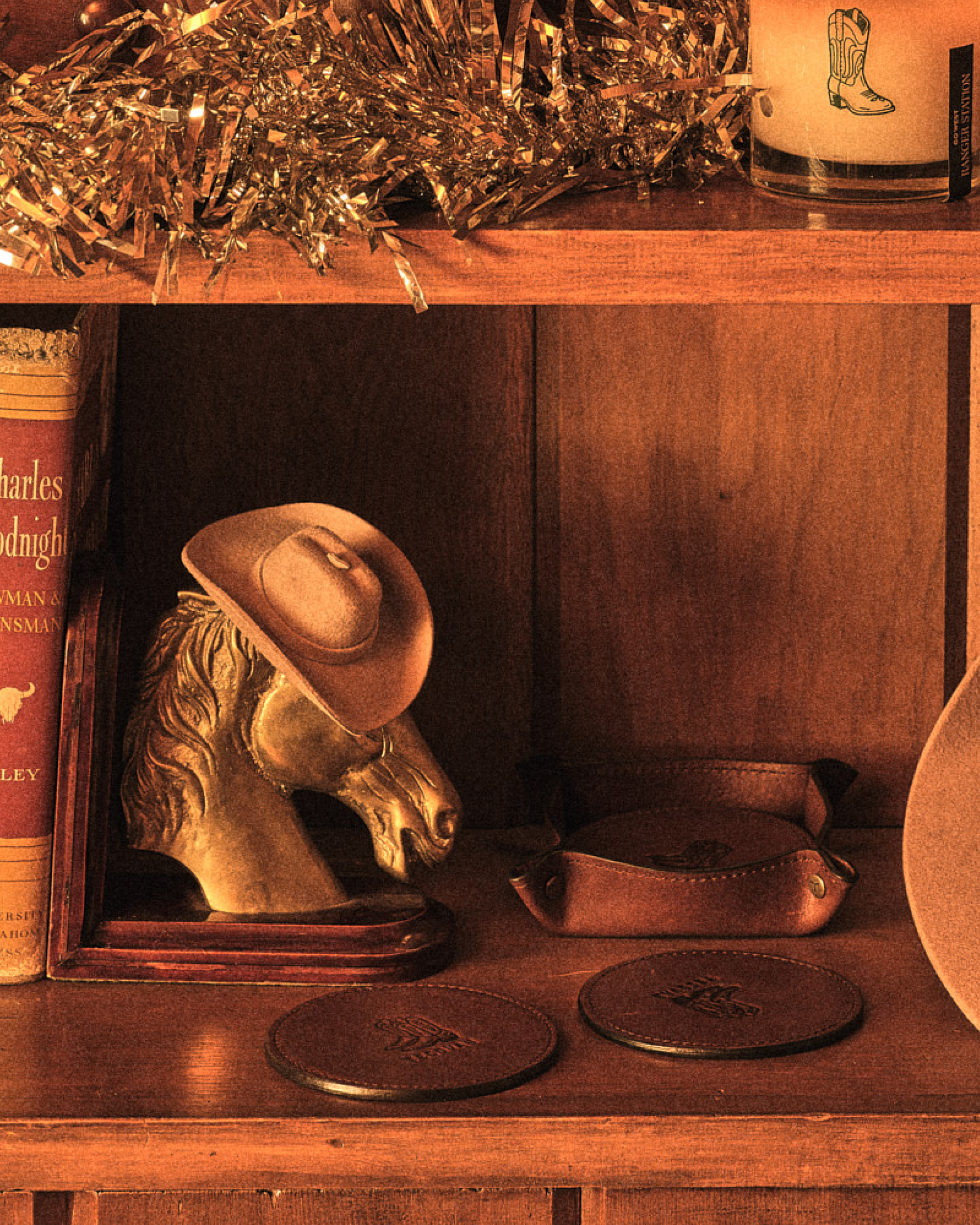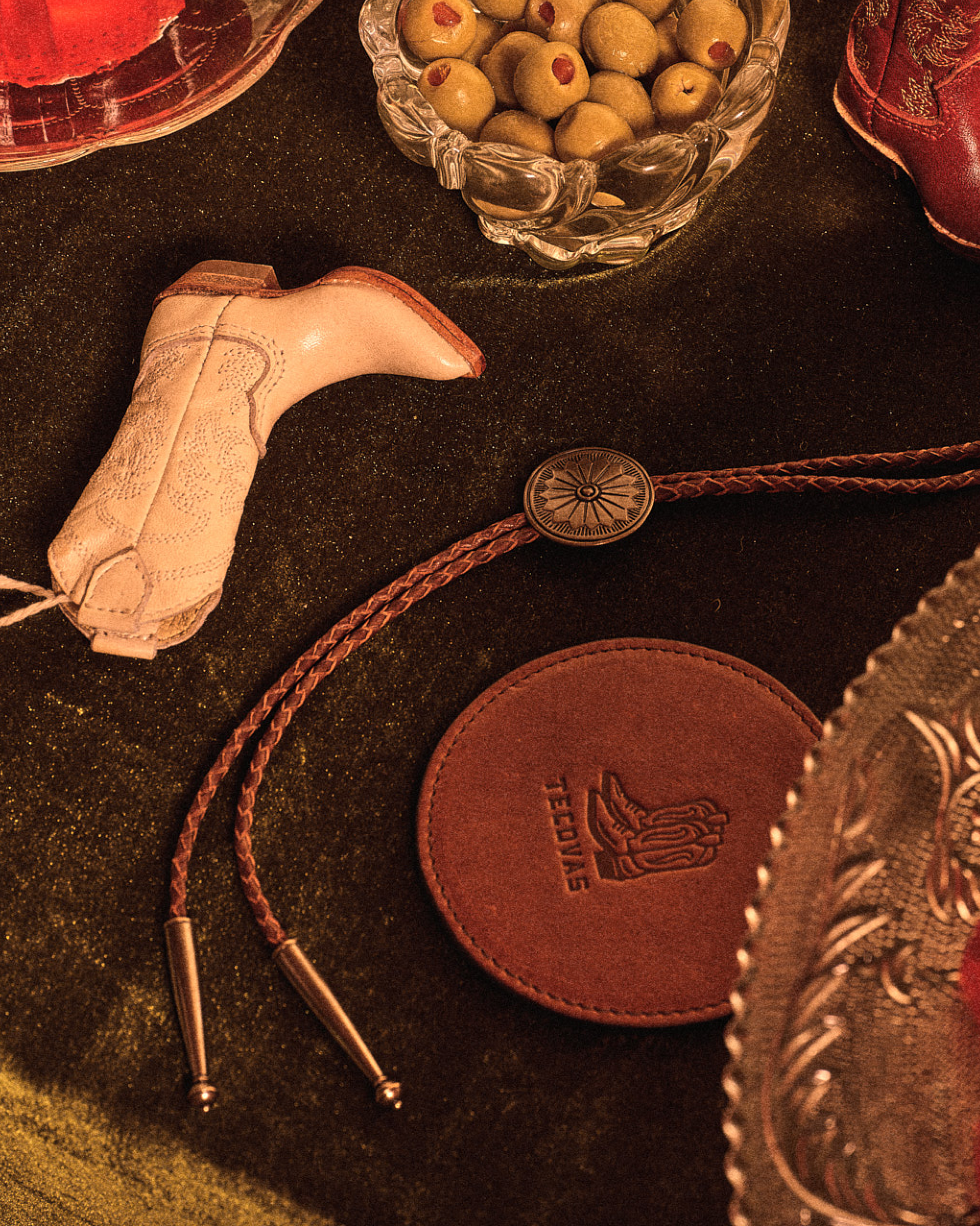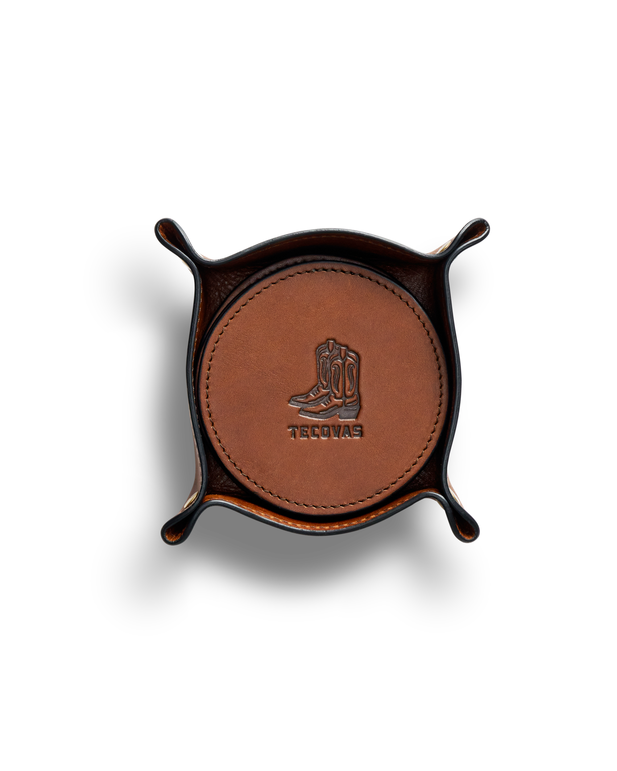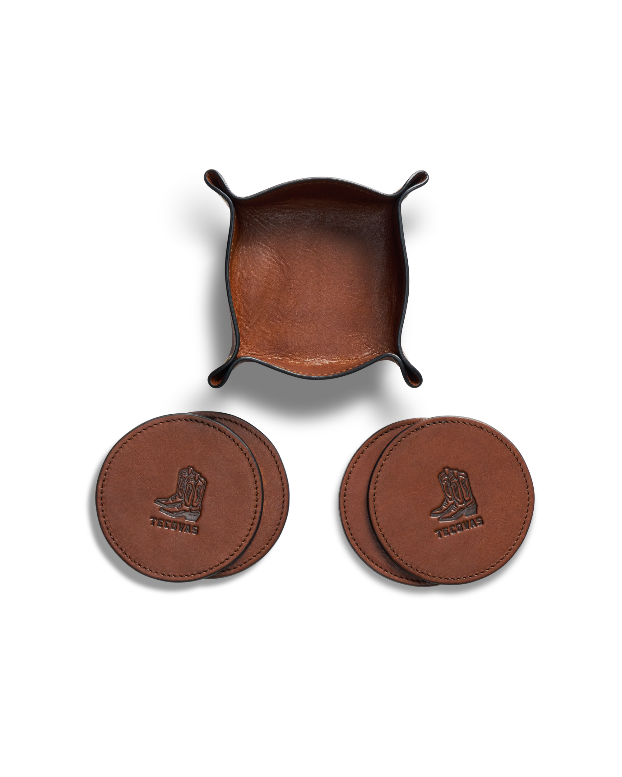 Bring a touch of the West to any table. This set includes four 4” genuine leather coasters with a tray — debossed with boots and the Tecovas logo on one side and left blank on the other for brandable customization. Comes with a dust bag, making it perfect for gifting or keeping your home as polished as your style.