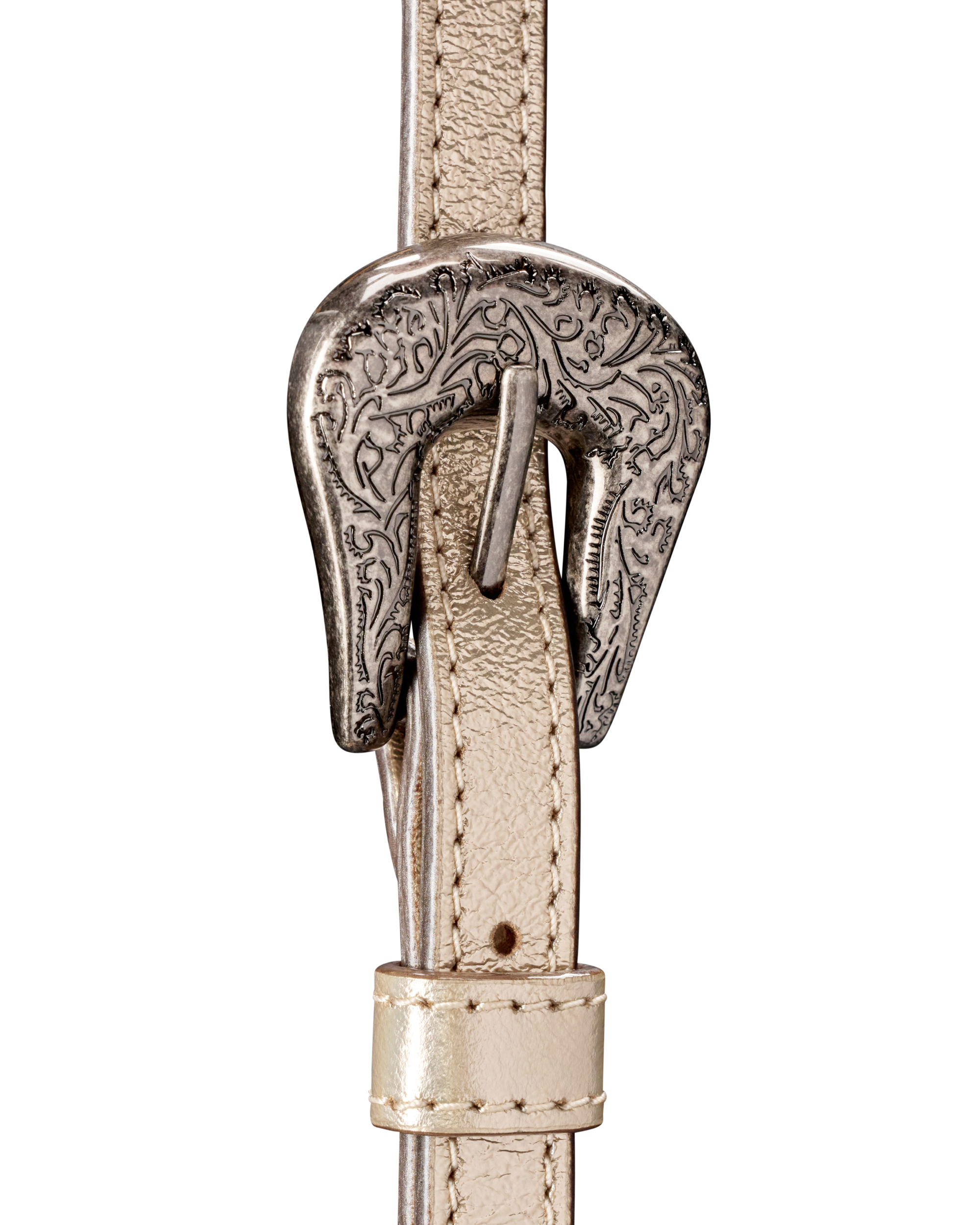 Solid brass hardware with a matte nickel finish; buckle in dark antique nickel