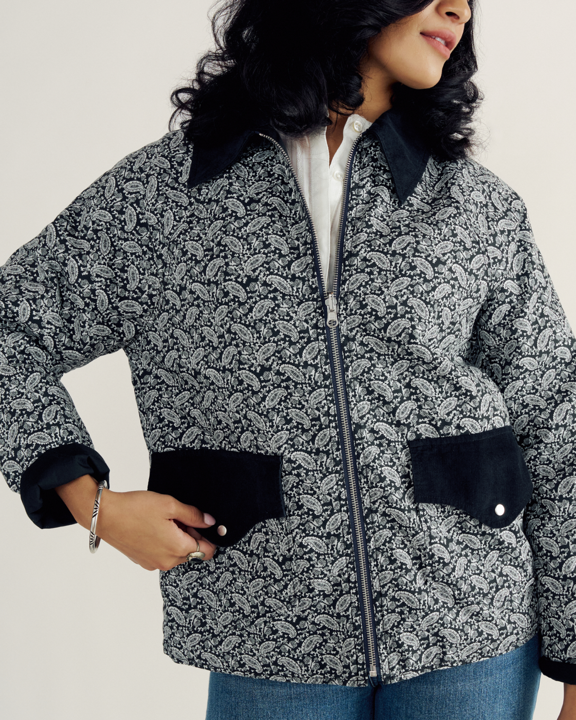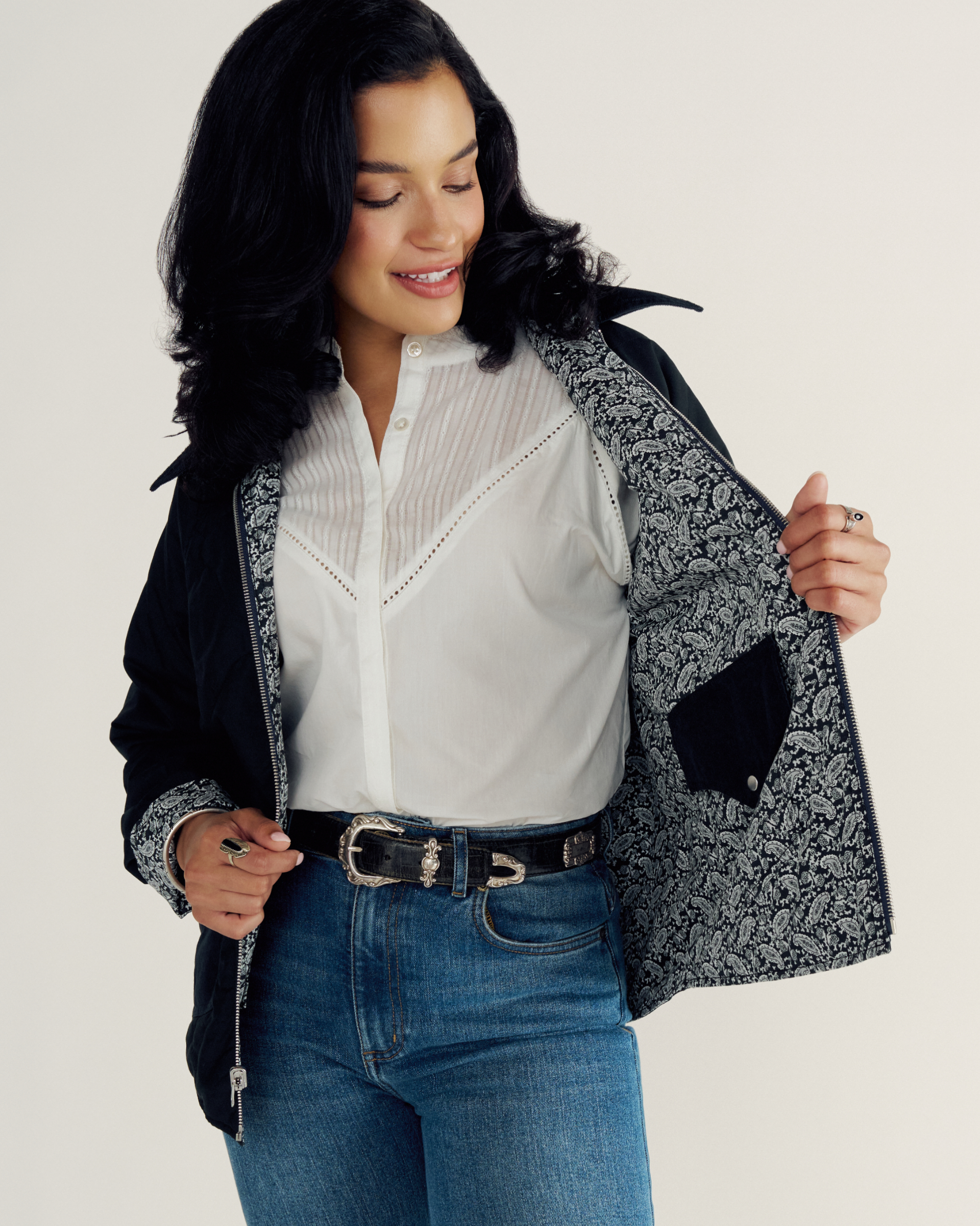 The Women’s Liner Jacket does double duty — with a bold paisley print on one side and classic black on the other, it’s built to mix, match, and move with your day. Lightweight but warm, and filled with Ecodown (a sustainable down alternative), it’s finished with corduroy trim at the collar and pockets for a Western touch. Lay it over denim or pair it with a dress, this one’s got range.