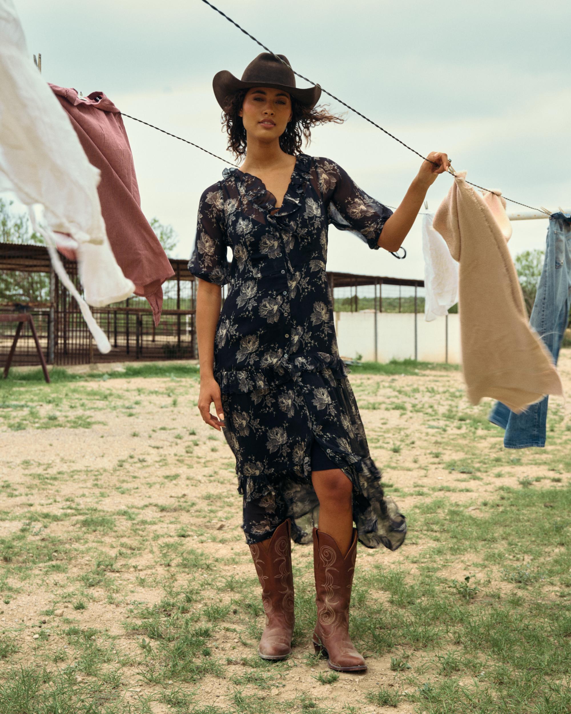 Model is 5'9" with 34" bust, 26" waist, 39" hips and wears Tecovas size S