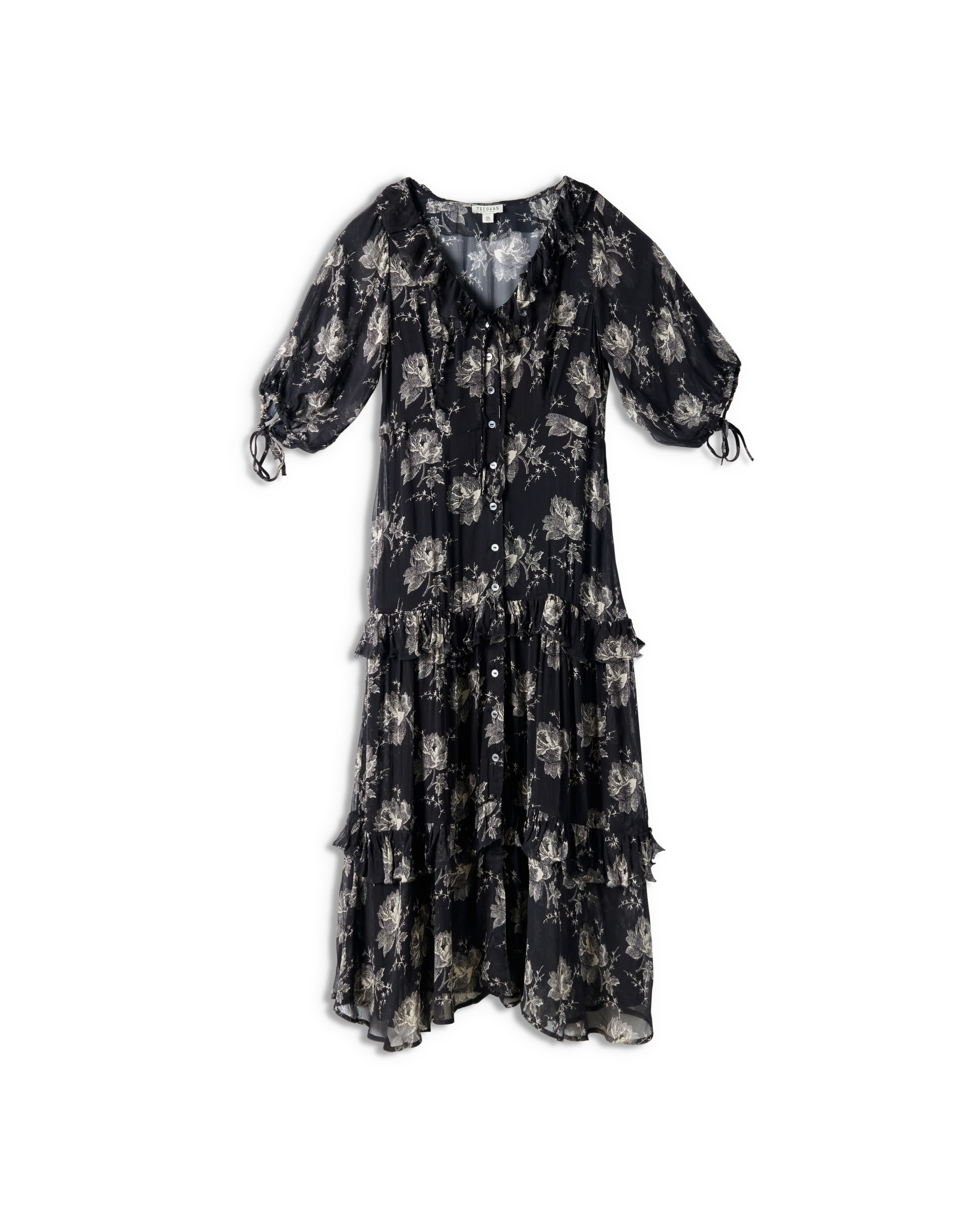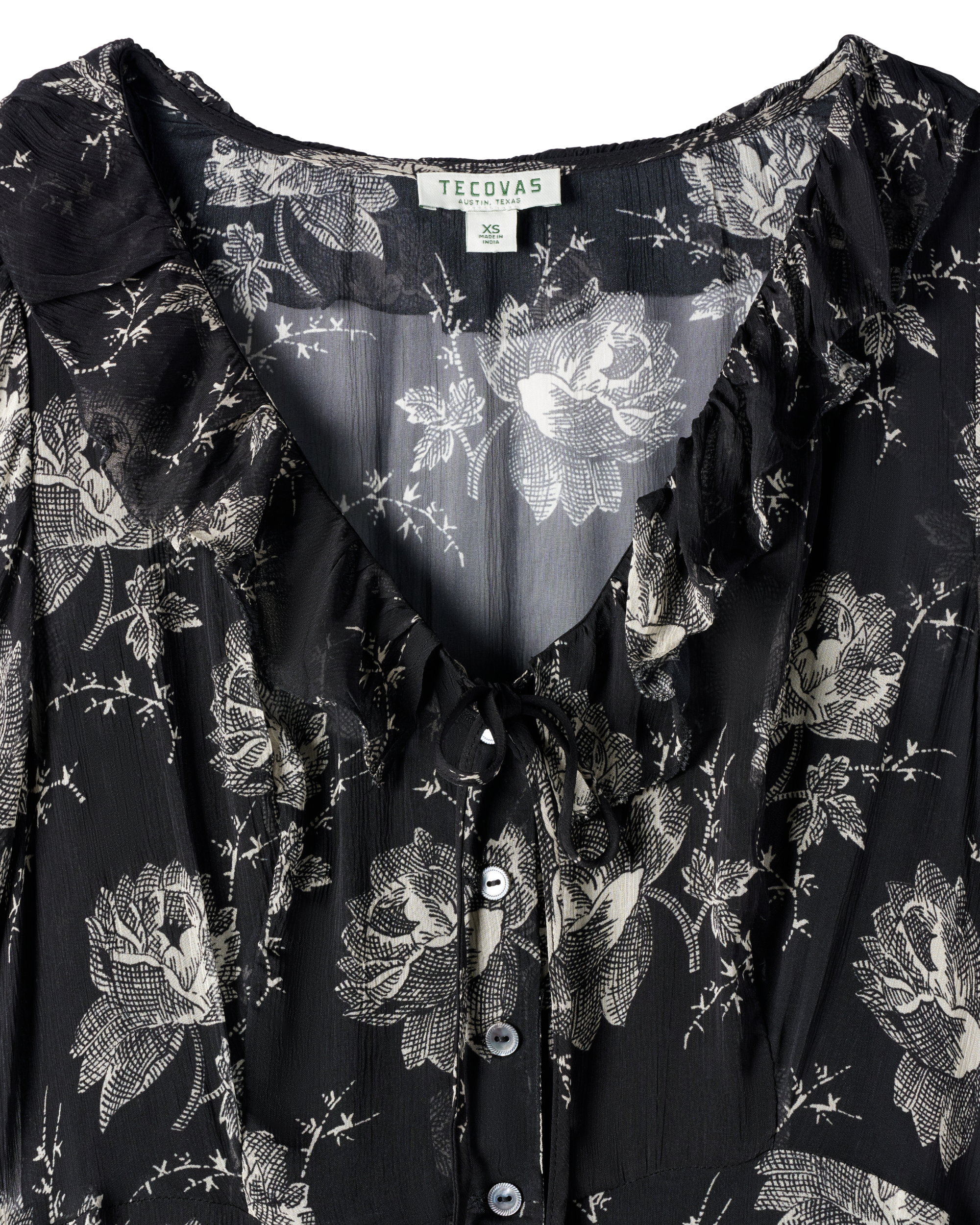 Made for movement—and making an entrance. This elbow-length maxi dress comes in two custom prints and a sheer viscose fabric that feels effortlessly elevated. Feminine ruffles, puff sleeves, and delicate picot edging bring the charm, while a full slip keeps it bra-friendly and easy to wear. Adjustable sleeve ties and a front button placket let her style it her way—buttoned-up or a little bold. Pair it with boots or dress it up; either way, this one turns heads.