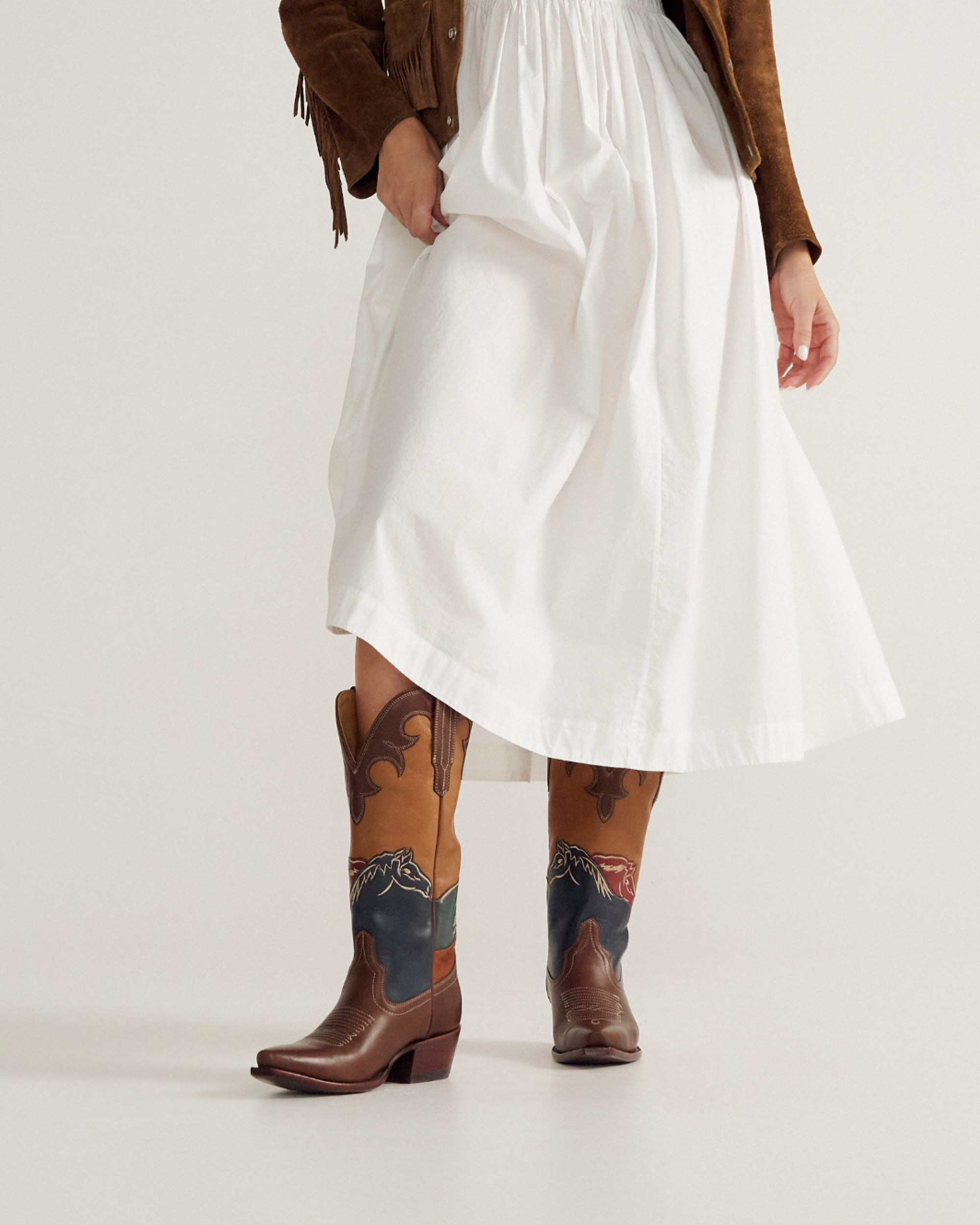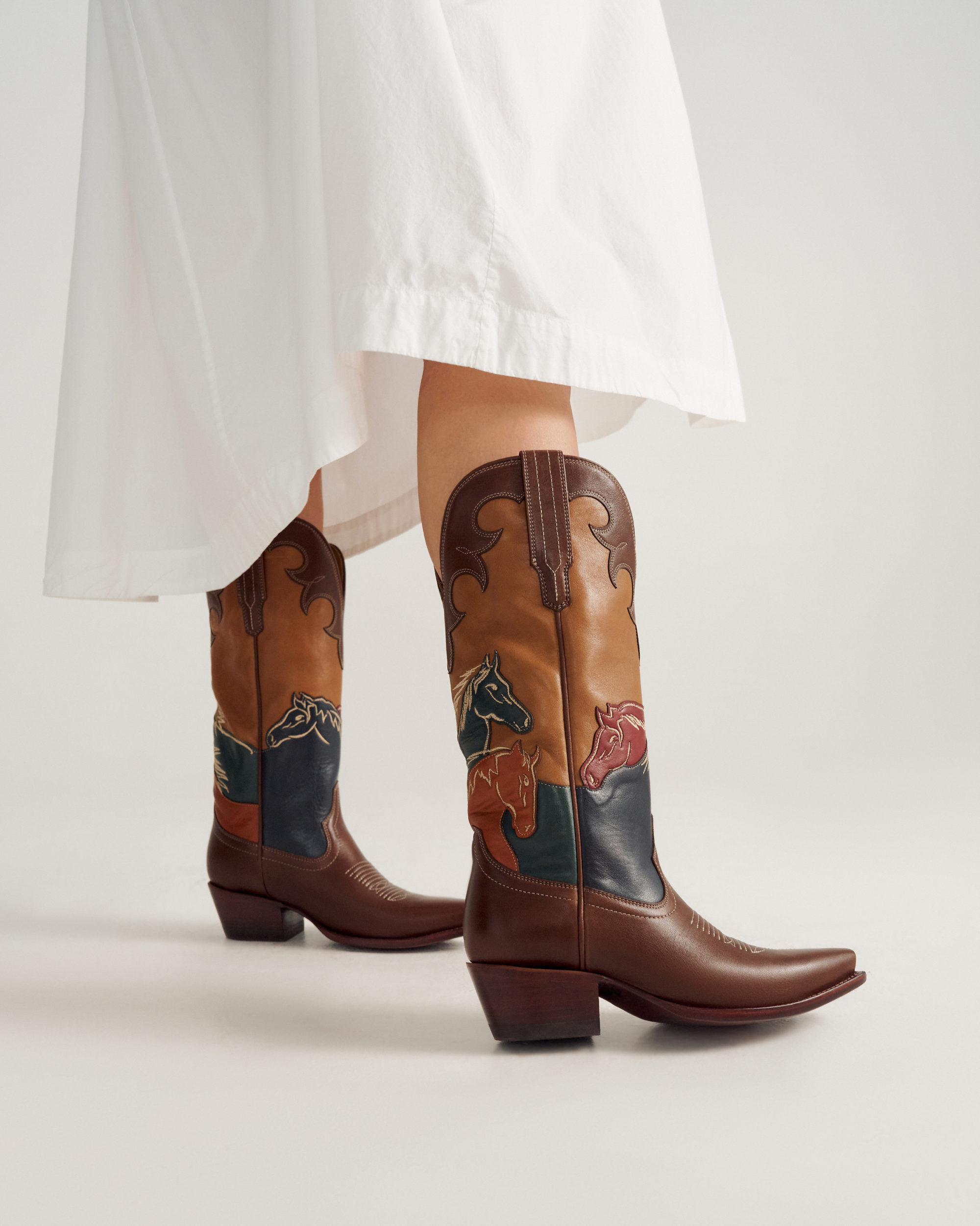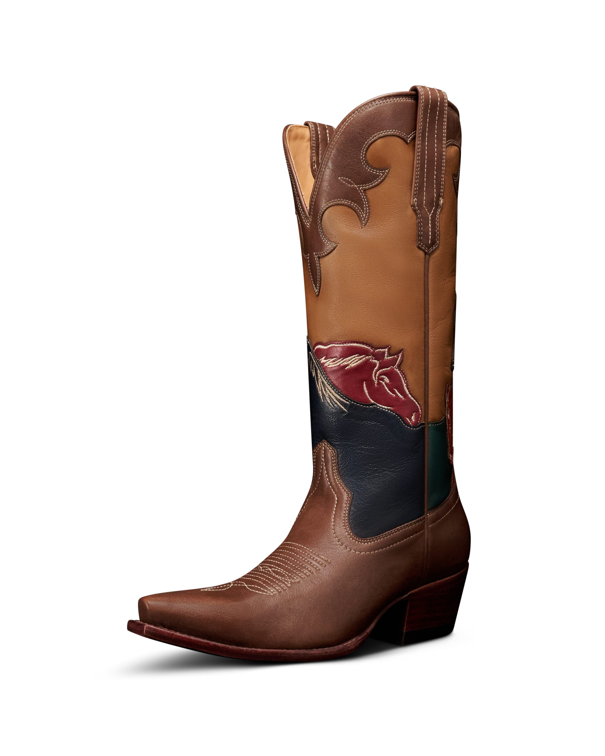The Annie Wild Horses is more than a boot—it’s a story of craft, heritage, and the spirit of Texas captured in leather. Standing 14” tall with a bold 2” heel and a fashion-forward snip toe, this boot features four uniquely colored and stitched overlays, each depicting a wild horse in motion. The tonal scalloped collar echoes the supple cowhide vamp below, creating a shaft that almost reads like a hand-painted canvas. This limited-edition style is for the true Western boot collector, offering artistry, craftsmanship, and a connection to vintage artisan boots that’s impossible to replicate.