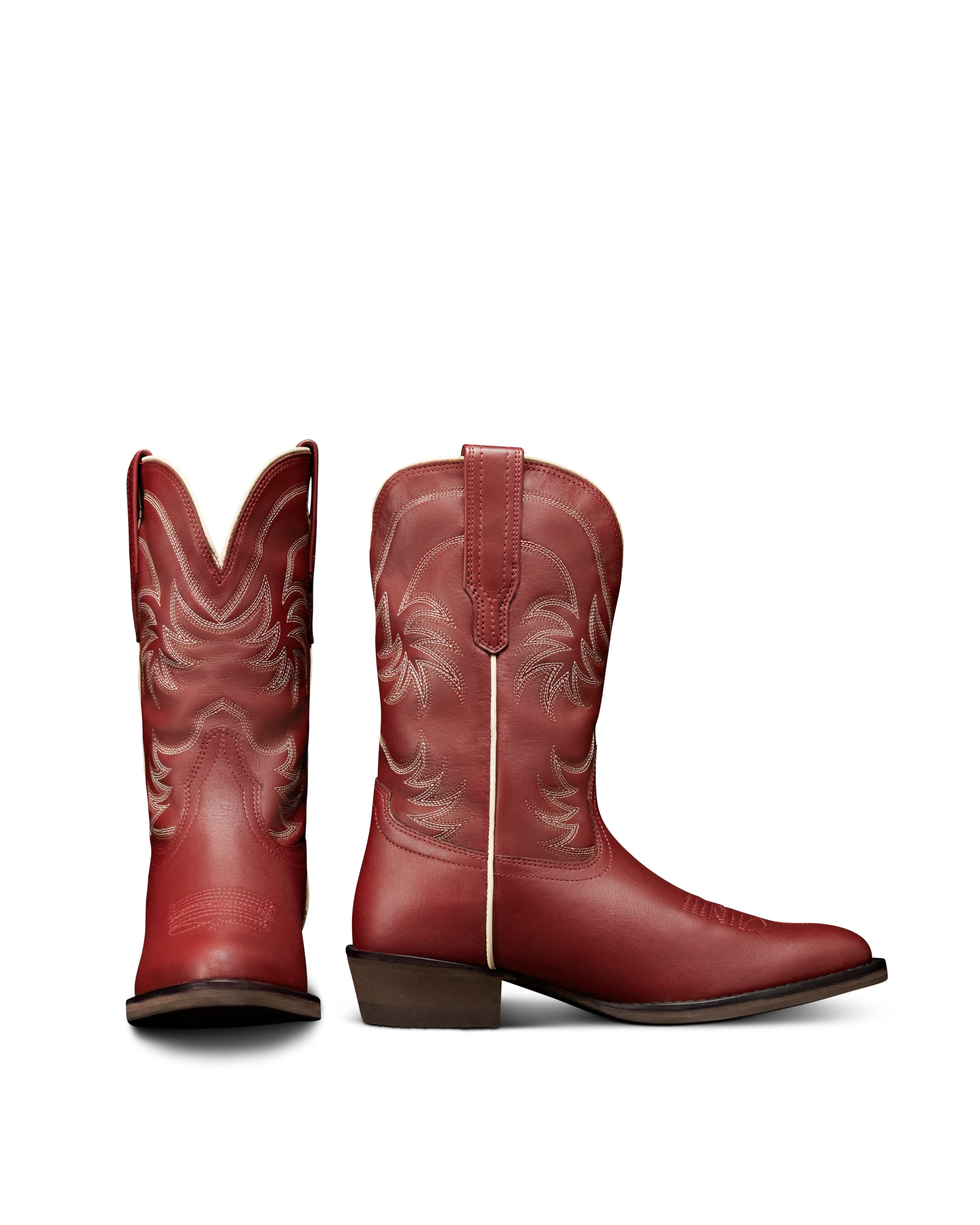 The Annie Kid takes our best-selling cowgirl boot and gives it a playground-ready spin. With an 8.5” shaft featuring classic stitch detailing, polished round toe, and 1 ⅜ ” heel, it’s every bit the icon — just scaled for smaller strides. A cushioned midsole and breathable mesh lining keep little feet comfortable all day, while a rubber outsole stands up to every sprint, stomp, and scuffle. Built tough for big adventures — yet polished enough for picture day.