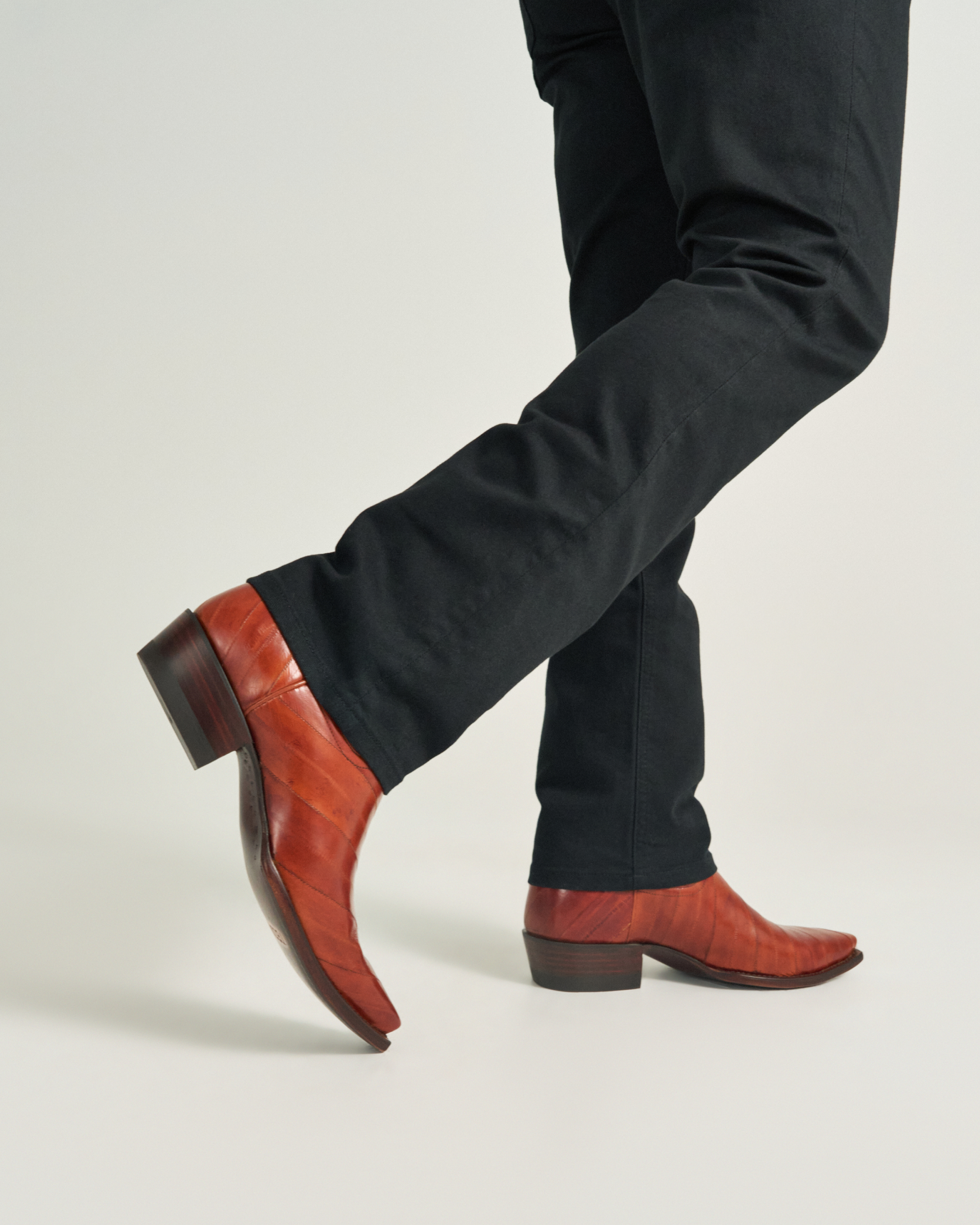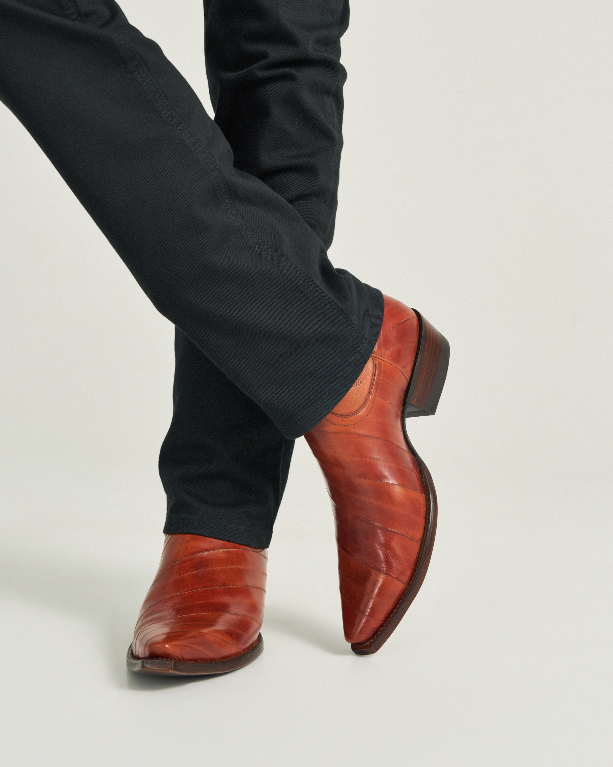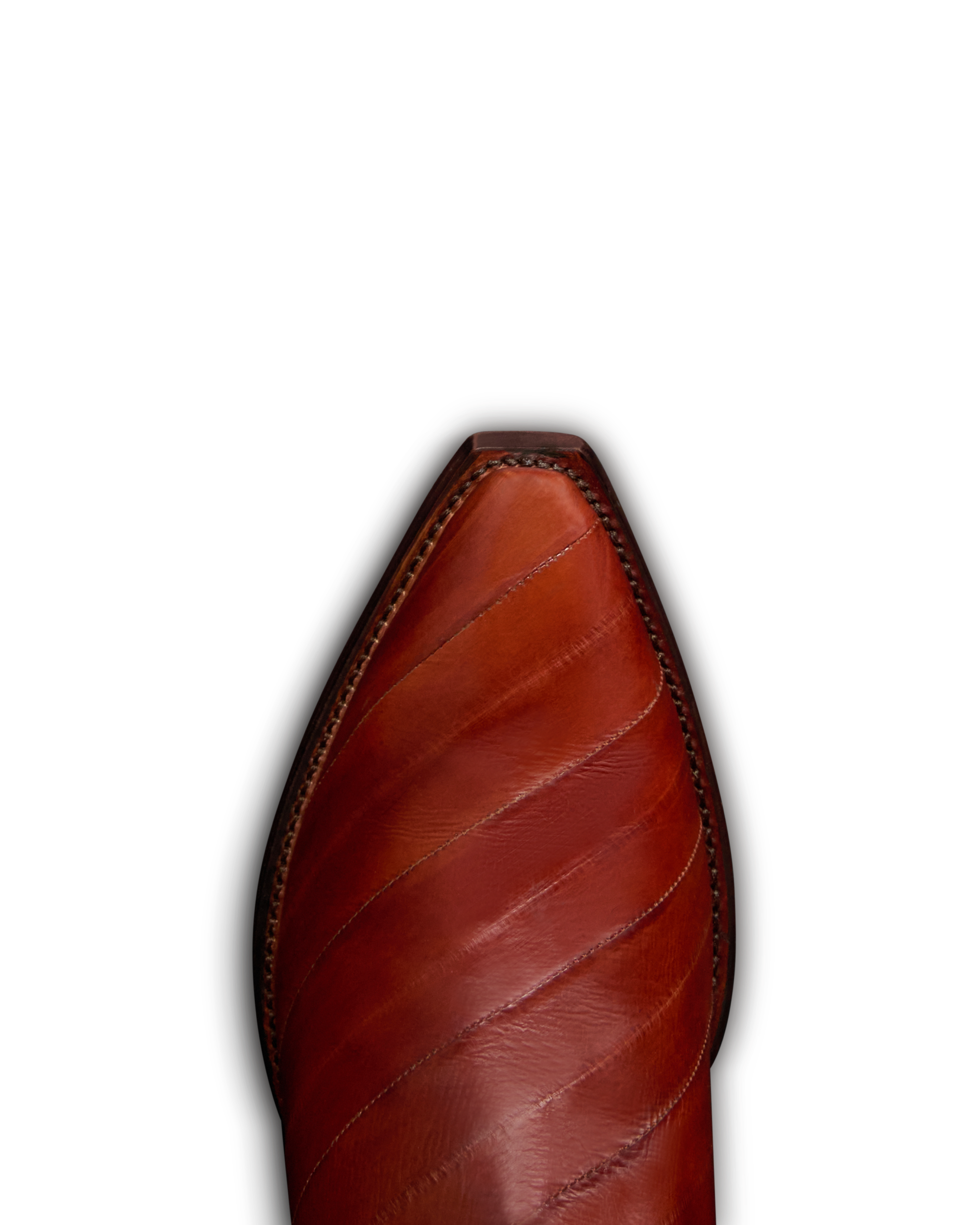 Coveted in Western boots for generations, eel leather is instantly recognizable by its striking linear pattern, created by stitching hides together. Super soft and lightweight, it molds comfortably to the foot and carries a timeless character that only deepens with wear. Its beauty lies in both its rarity and the story it carries forward.