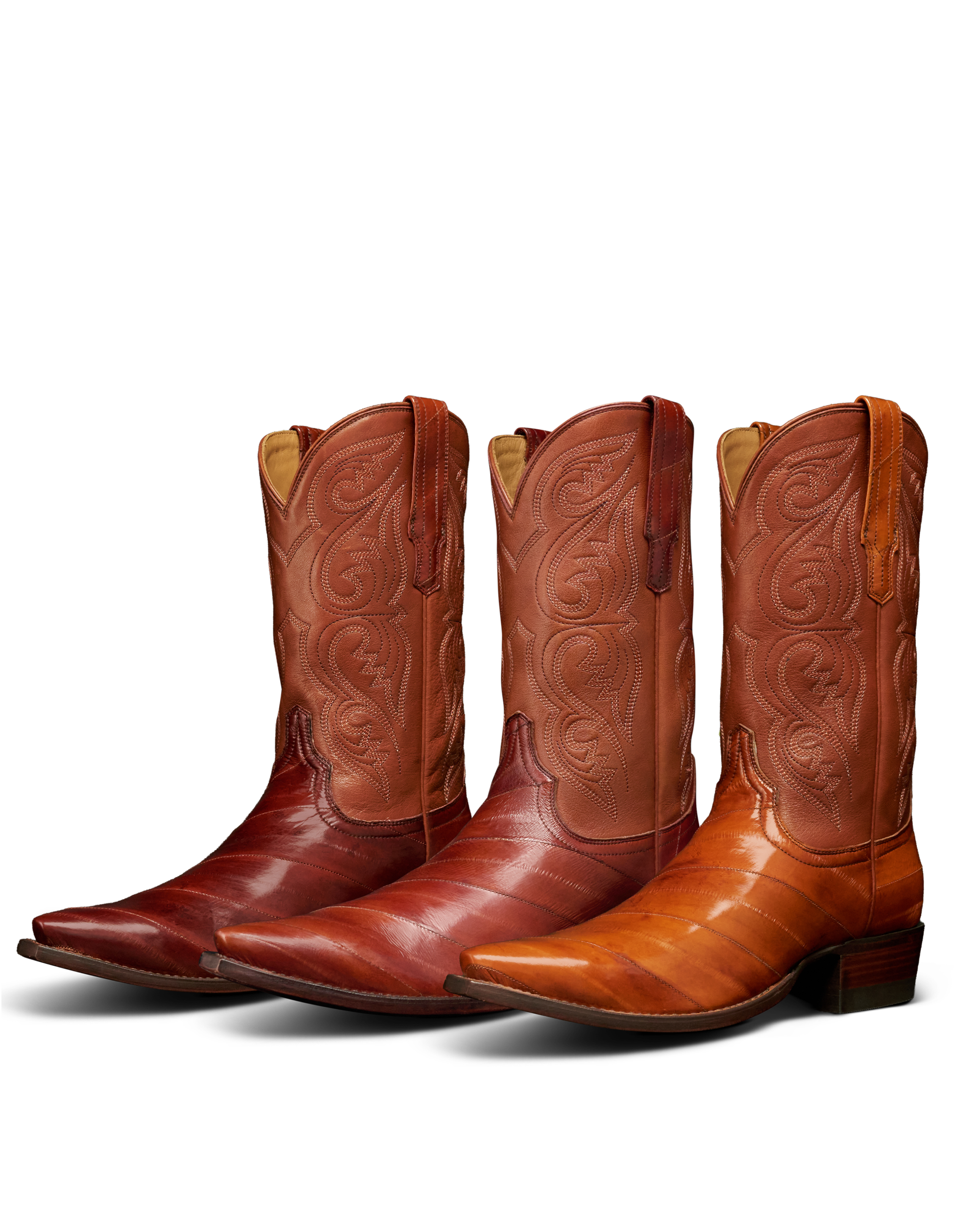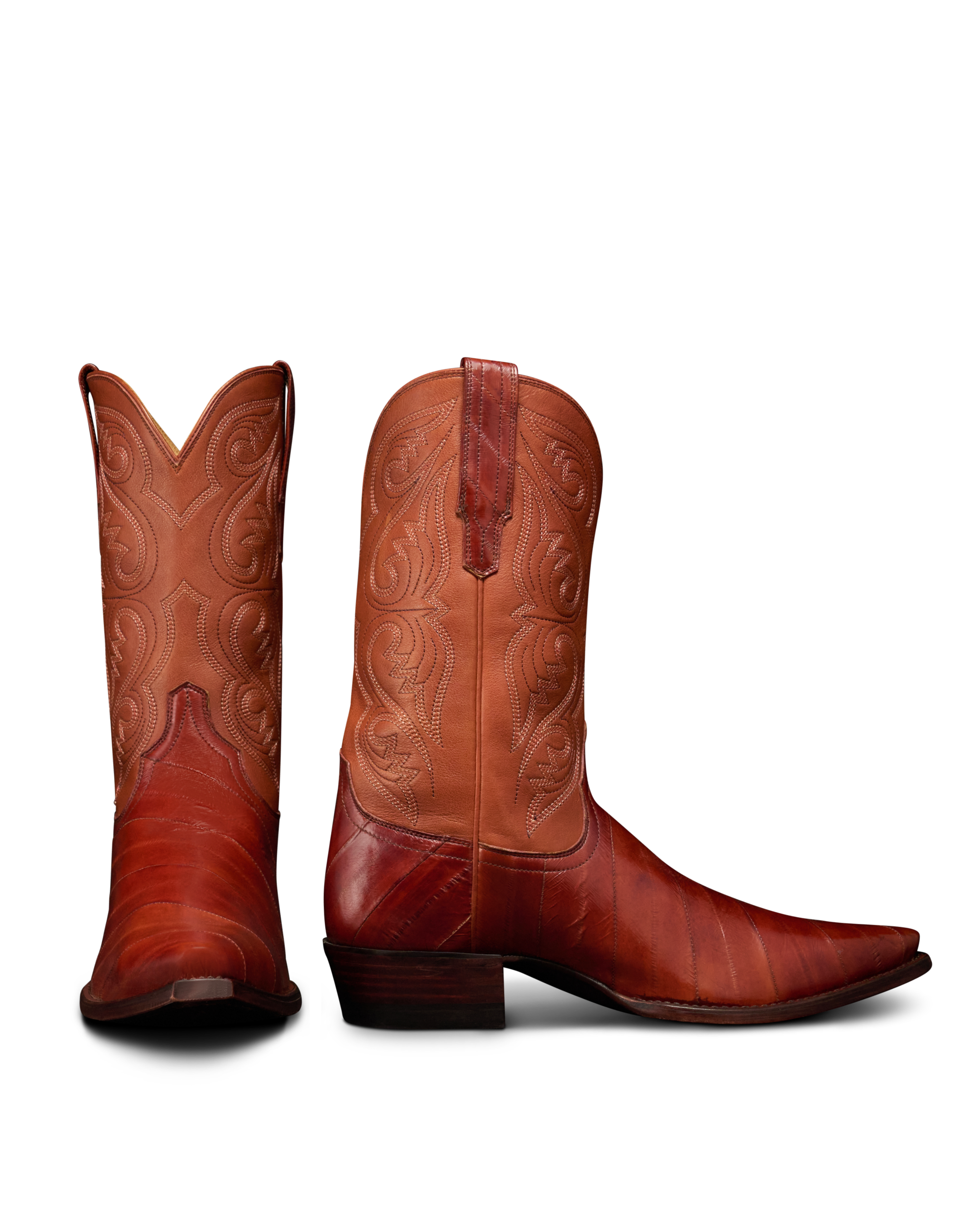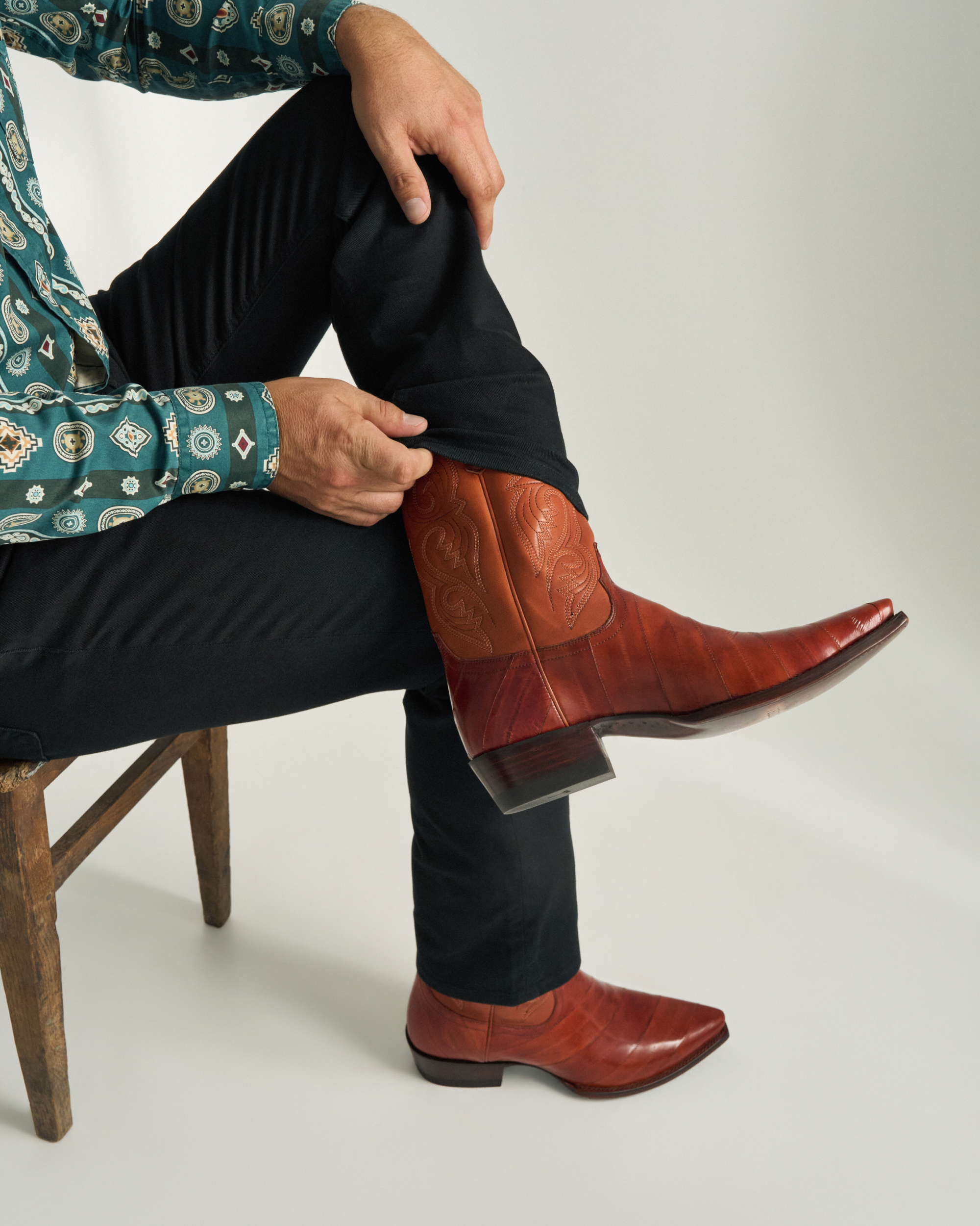 The Garrett snip-toe boot gets a rare twist in eel leather, a material with a character all its own. Each eel has a slightly different color, so the tone varies from pair to pair. The striking linear pattern of the eel, paired with an intricately stitched cowhide shaft, blends vintage Western style with refined craftsmanship.