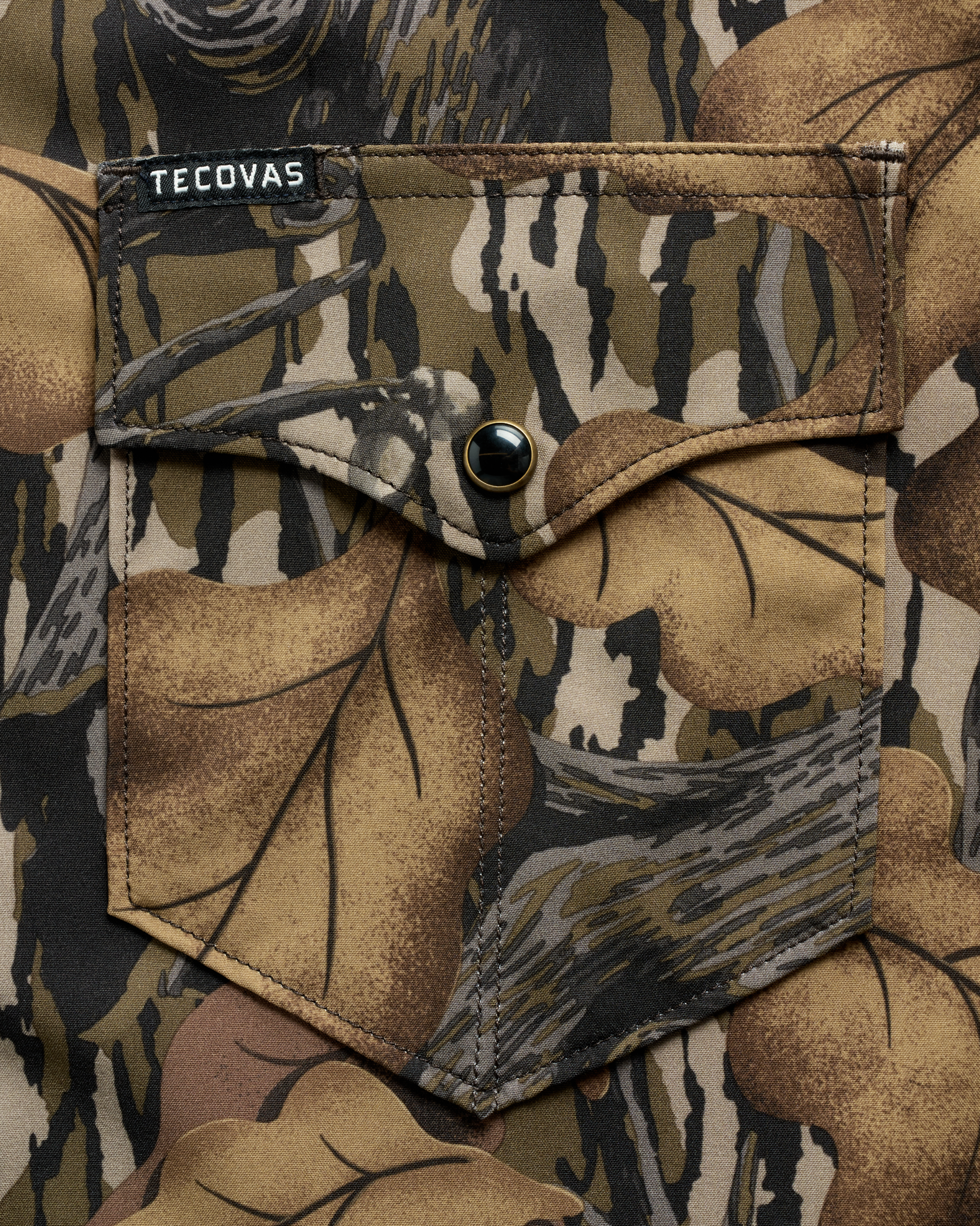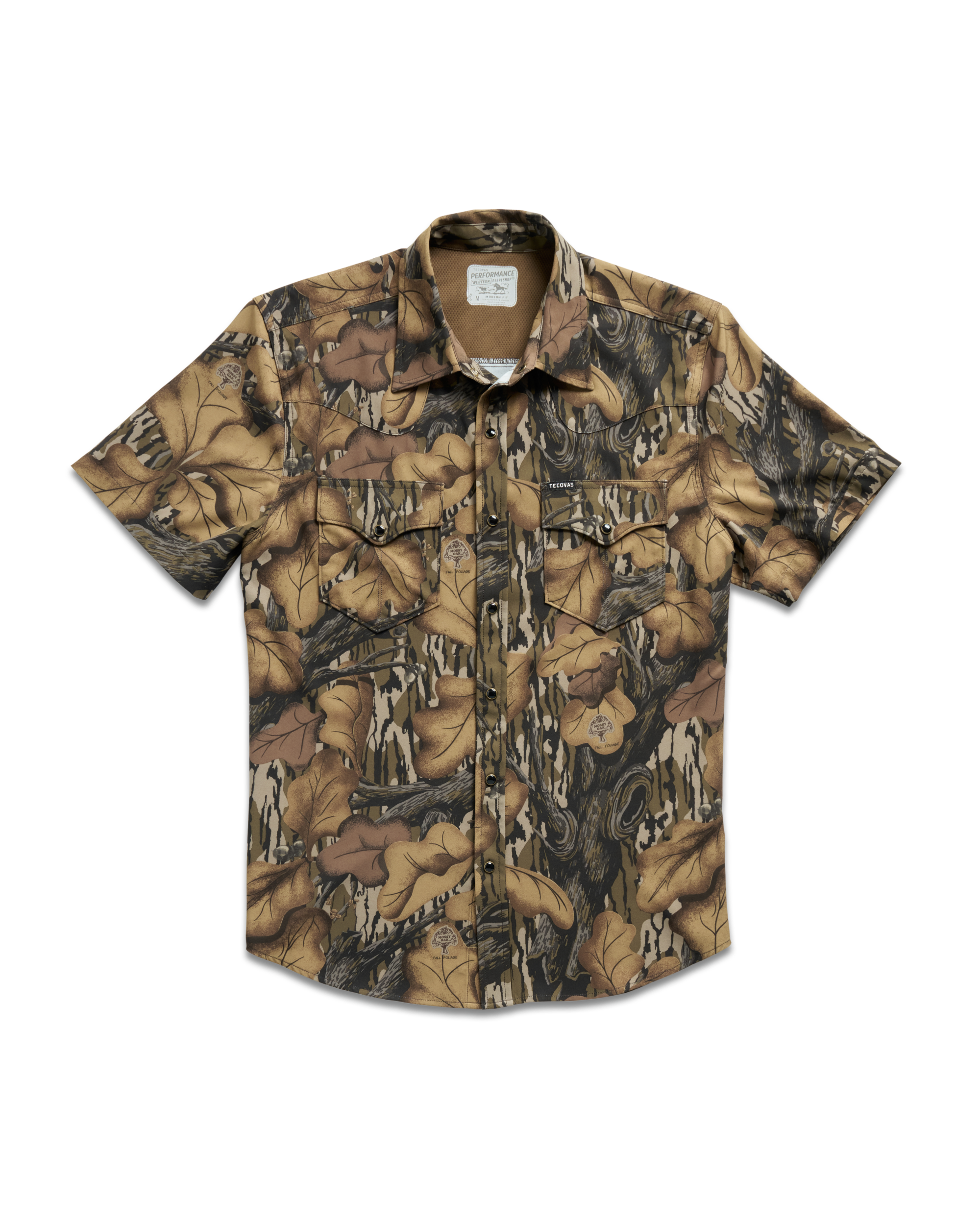 Made from a moisture-wicking polyester/spandex blend with plenty of stretch and wrinkle resistance, this shirt a hot weather essential with a UPF 50+ rating and a ventilated back yoke for extra breathability. Bonus features include a hidden sunglass wipe inside the placket and a dedicated slot on the chest pocket to stow your shades. Finished in an authentic Mossy Oak vault pattern—designed to blend into the wild and stand out everywhere else—this shirt adds a rugged edge to your warm-weather kit. With Tecovas’ signature flying-T pockets and antique brass-accented faux horn pearl snaps, it makes staying cool look cooler than ever.