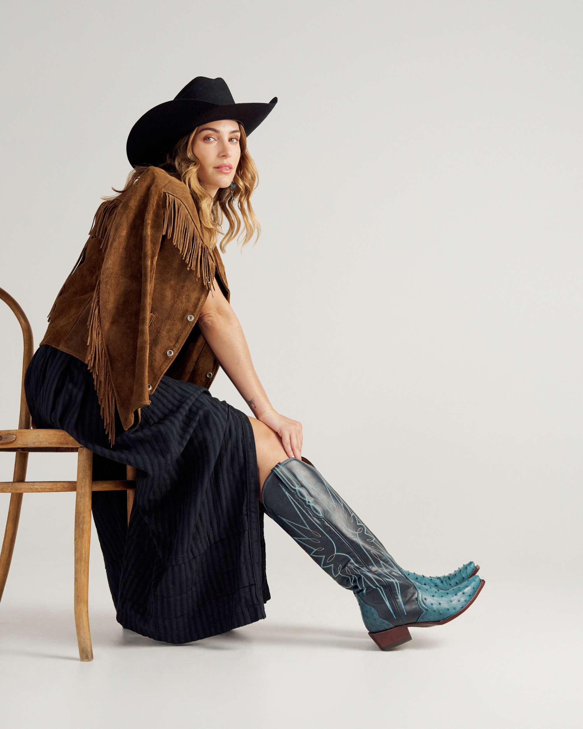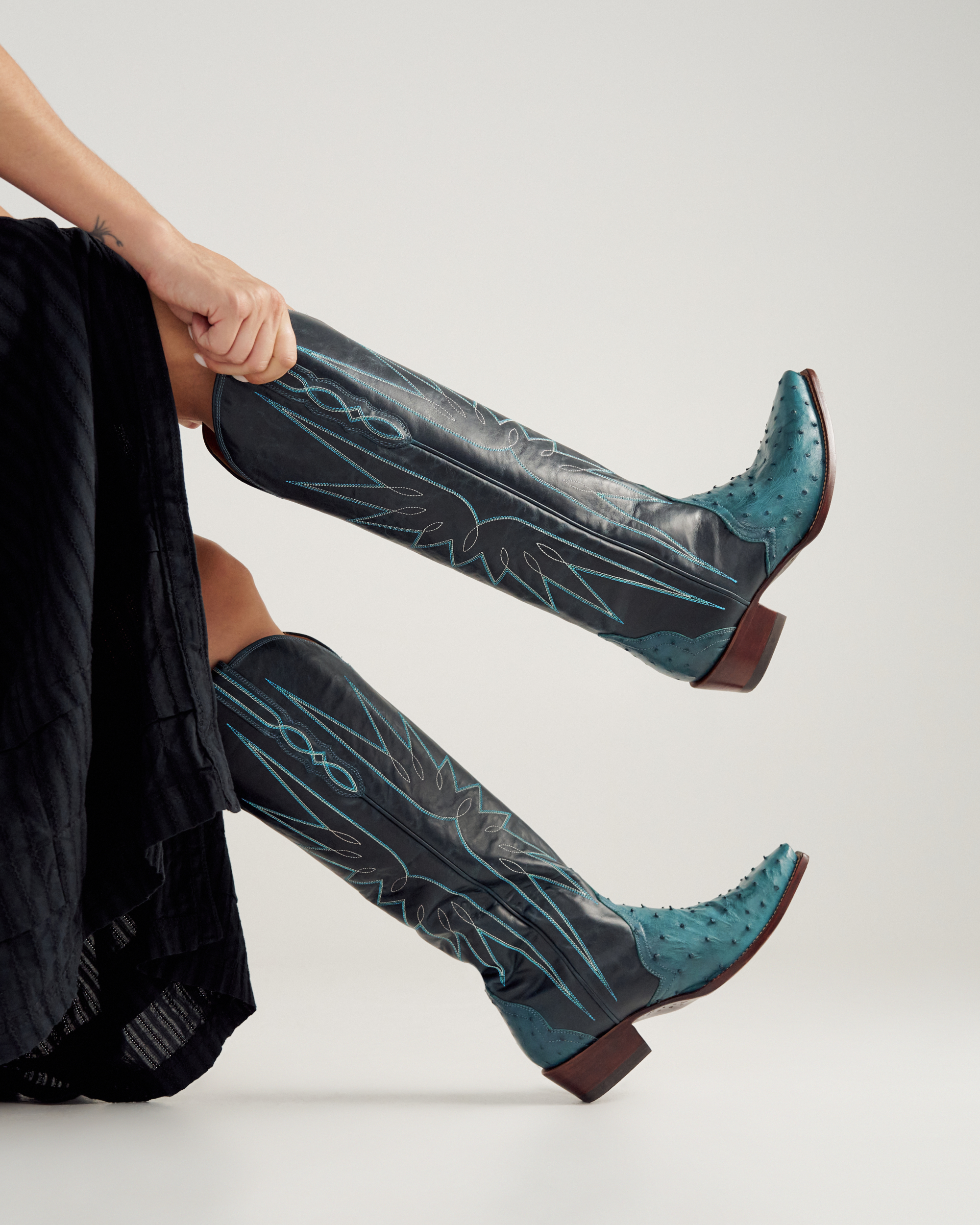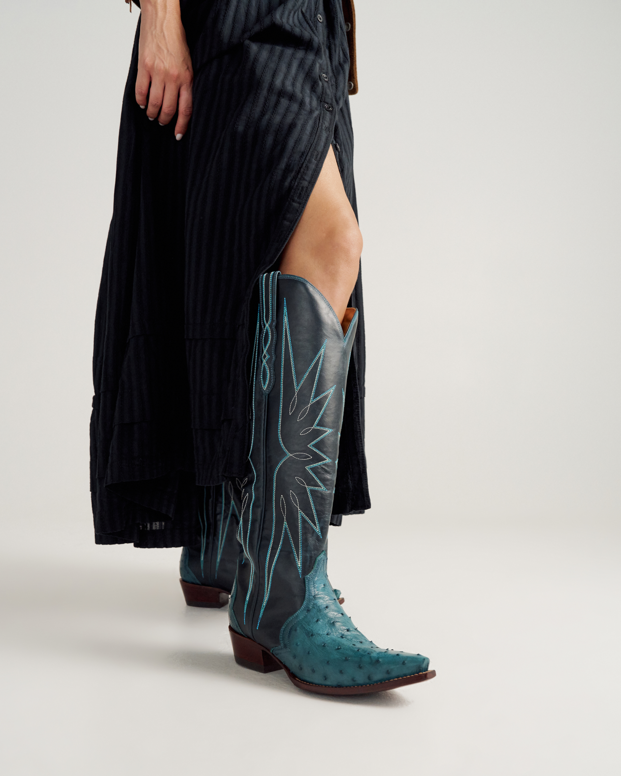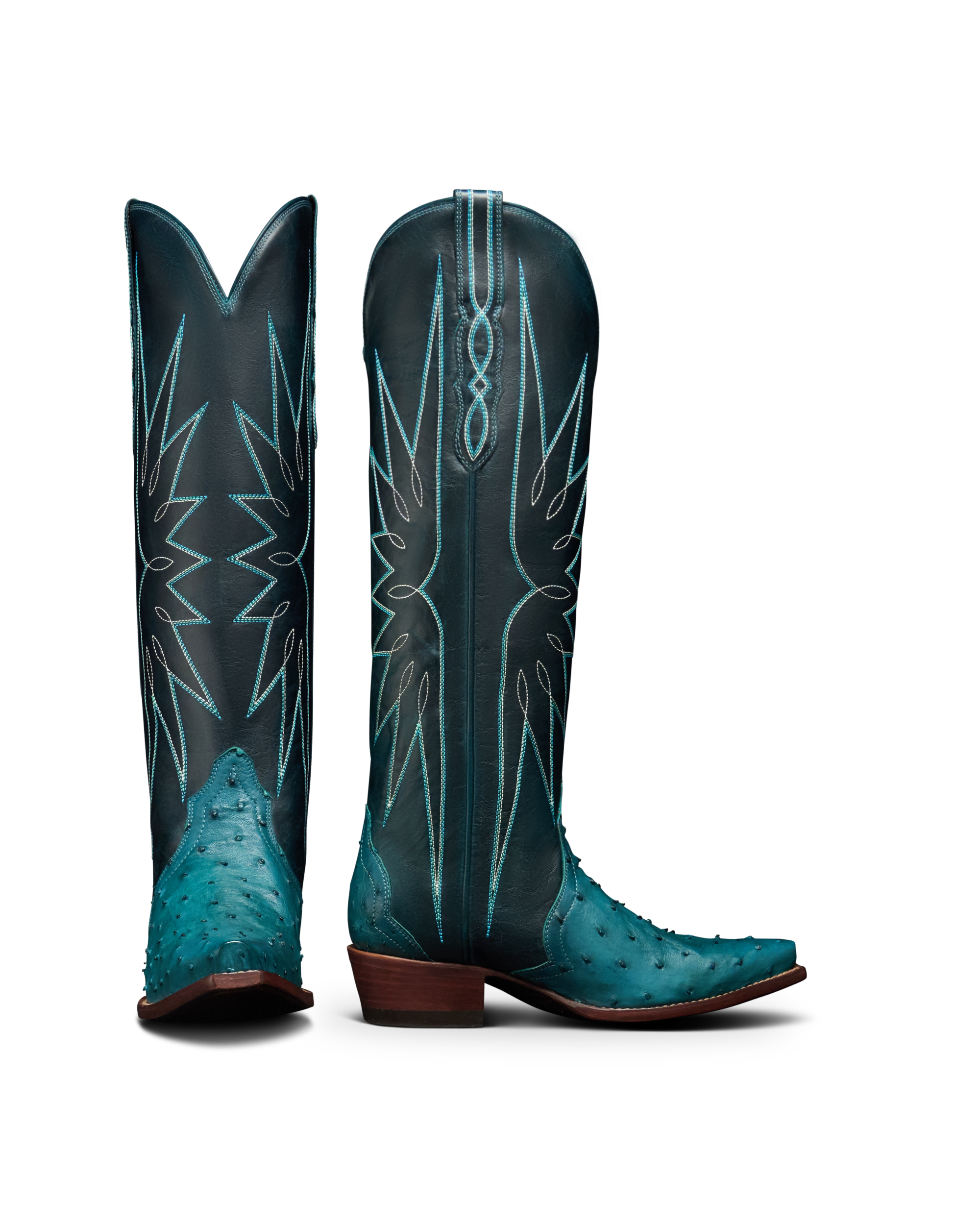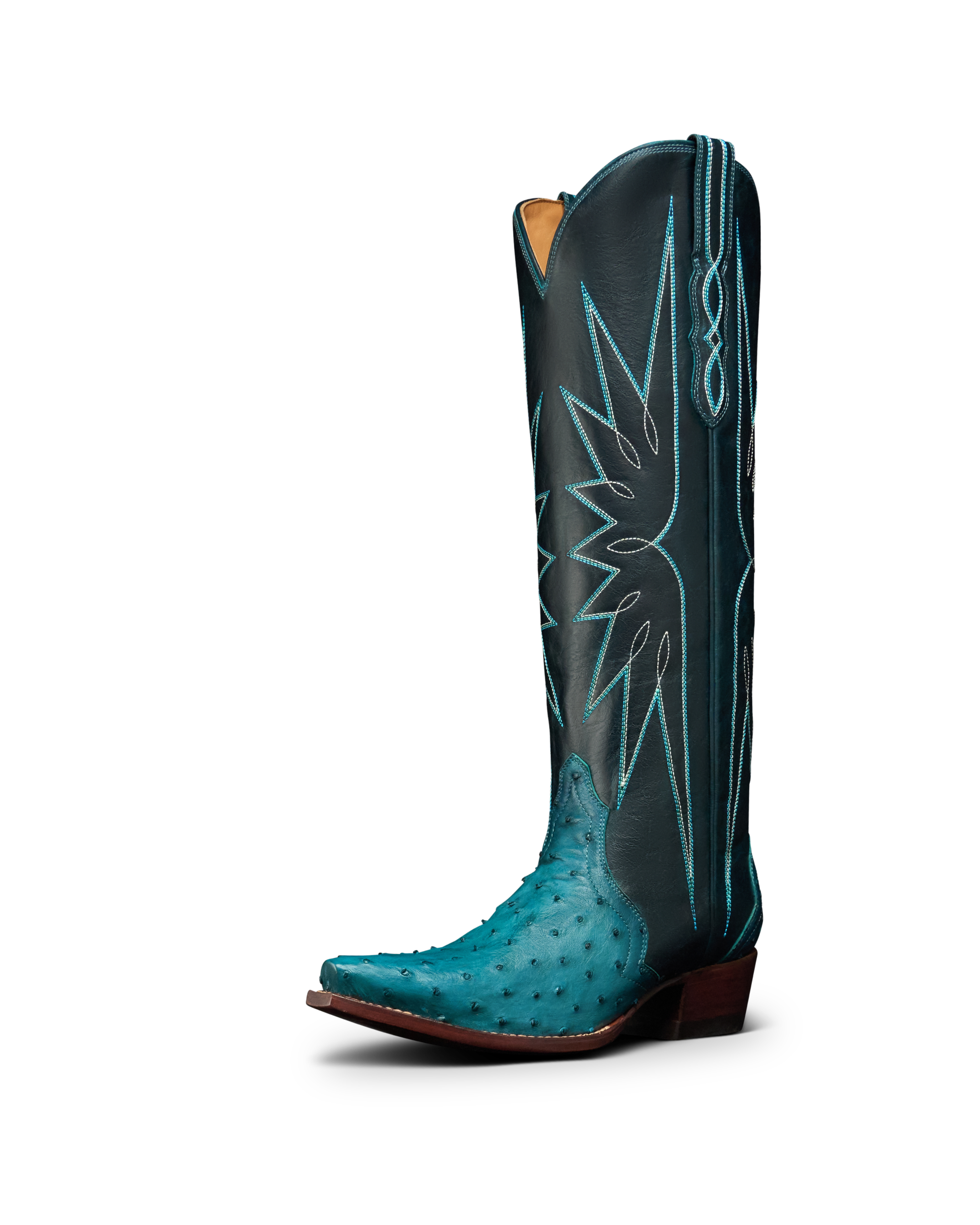 The Loretta goes bold like never before. A 17” shaft in richly charactered cowhide is brought to life with vibrant azure stitching, while the vamp and counter shine in striking azure ostrich — a combination that’s impossible to ignore. A streamlined silhouette, snip toe, and 1 ¾” stacked leather heel keep it wearable, while our signature toe bug delivers a touch of Tecovas flair. Designed for those who want a boot that turns heads, The Loretta isn’t just worn — it’s shown off.