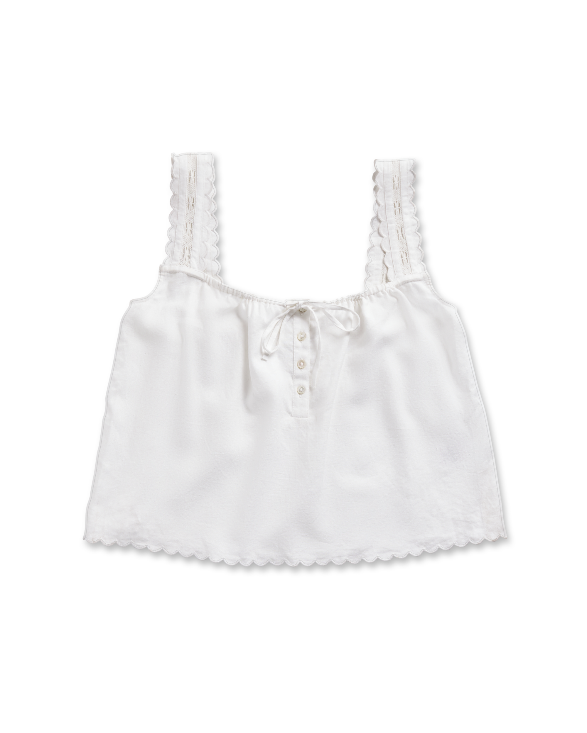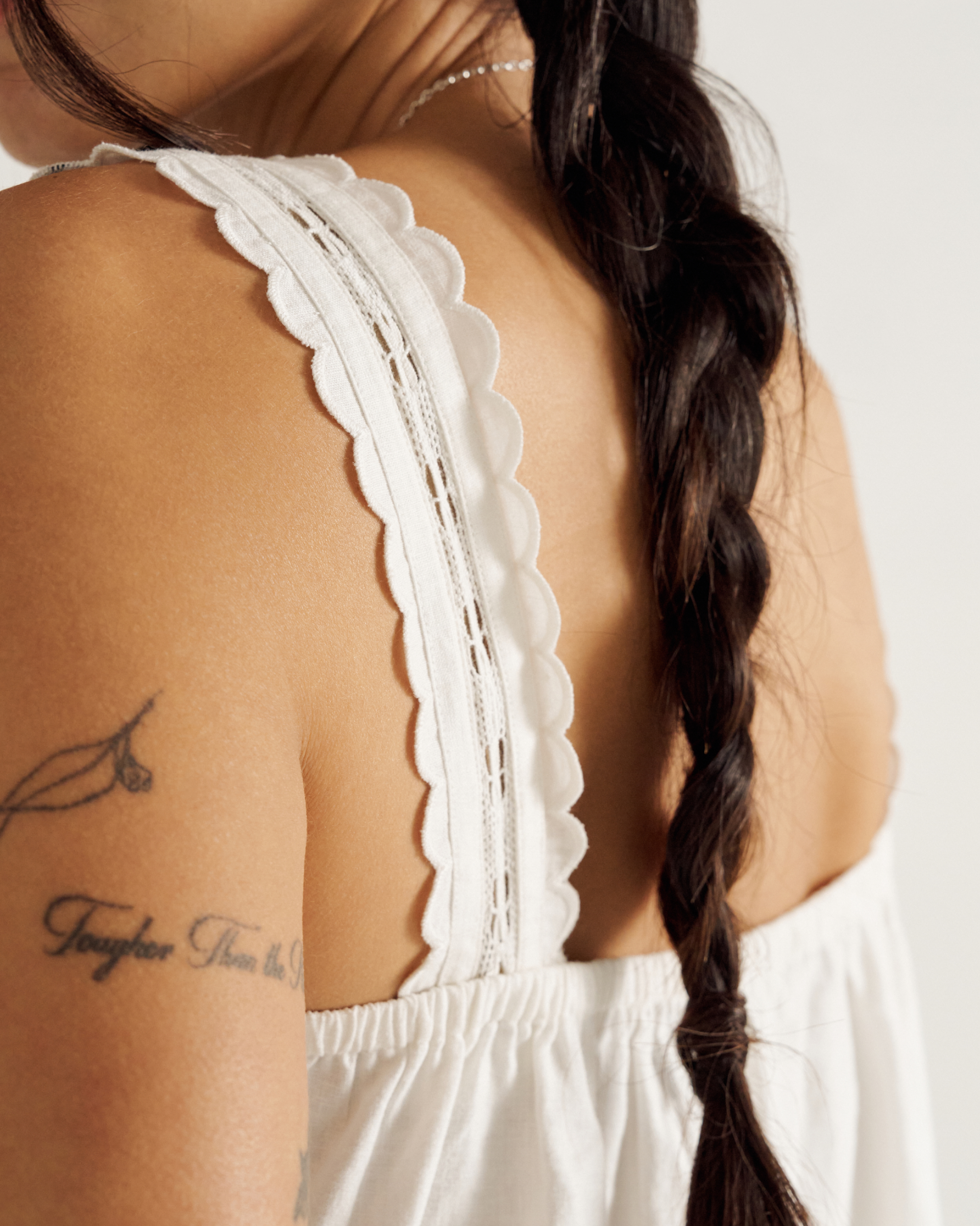 An elevated essential with artisanal details. Scalloped edges, delicate lace, and an adjustable neckline bring a refined touch, while the airy linen blend keeps it effortlessly breathable. Versatile, timeless, and made for sunlit days.