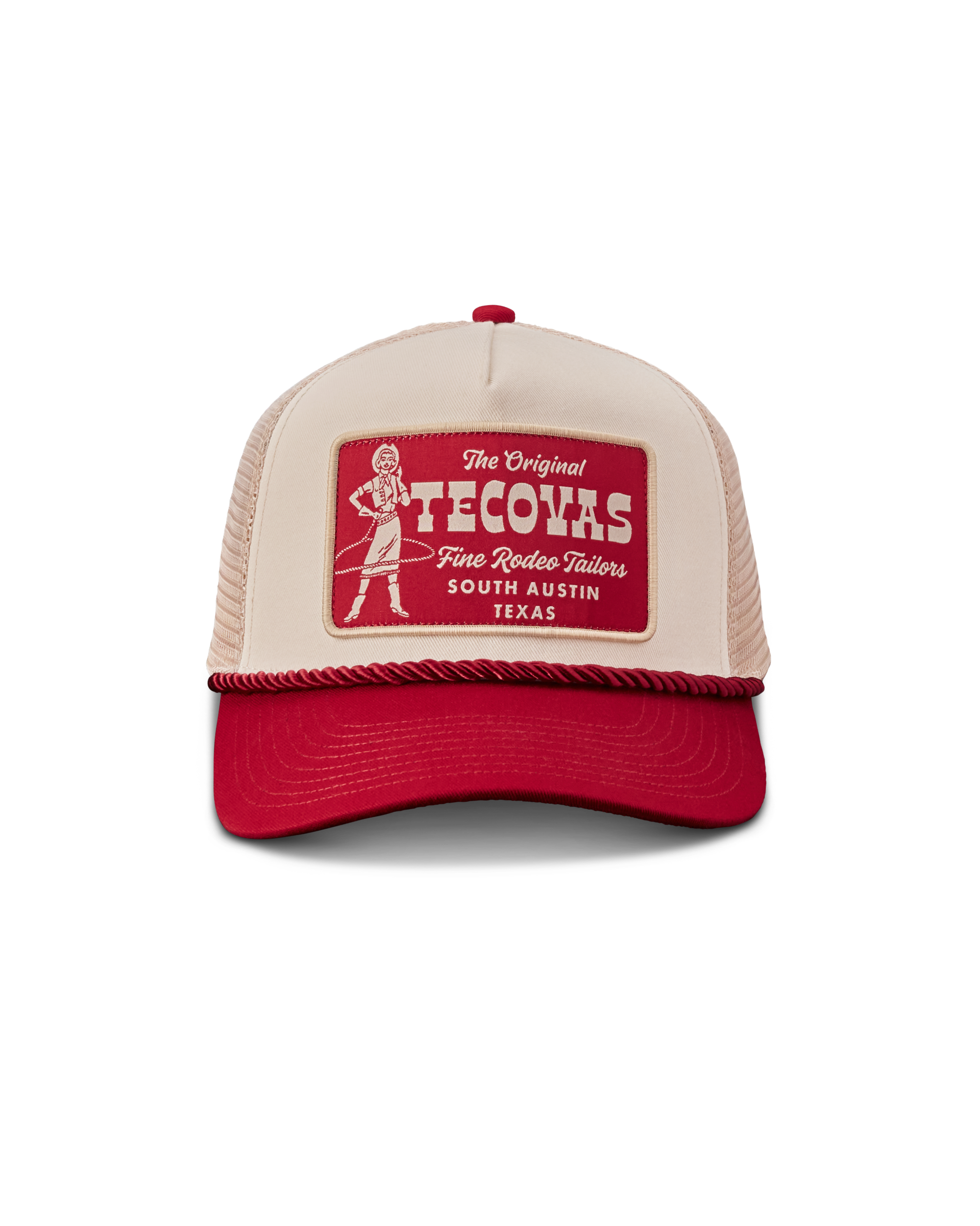 A little bit wild, a whole lot South Austin—this trucker hat brings retro rodeo spirit to everyday wear. Featuring an embroidered patch with a lasso-spinning cowgirl, it's finished with a vintage-style rope trim for extra character. The structured crown, breathable mesh back, and snapback closure make it the perfect fit for long drives, front porch hangs, or wherever the day kicks up dust.