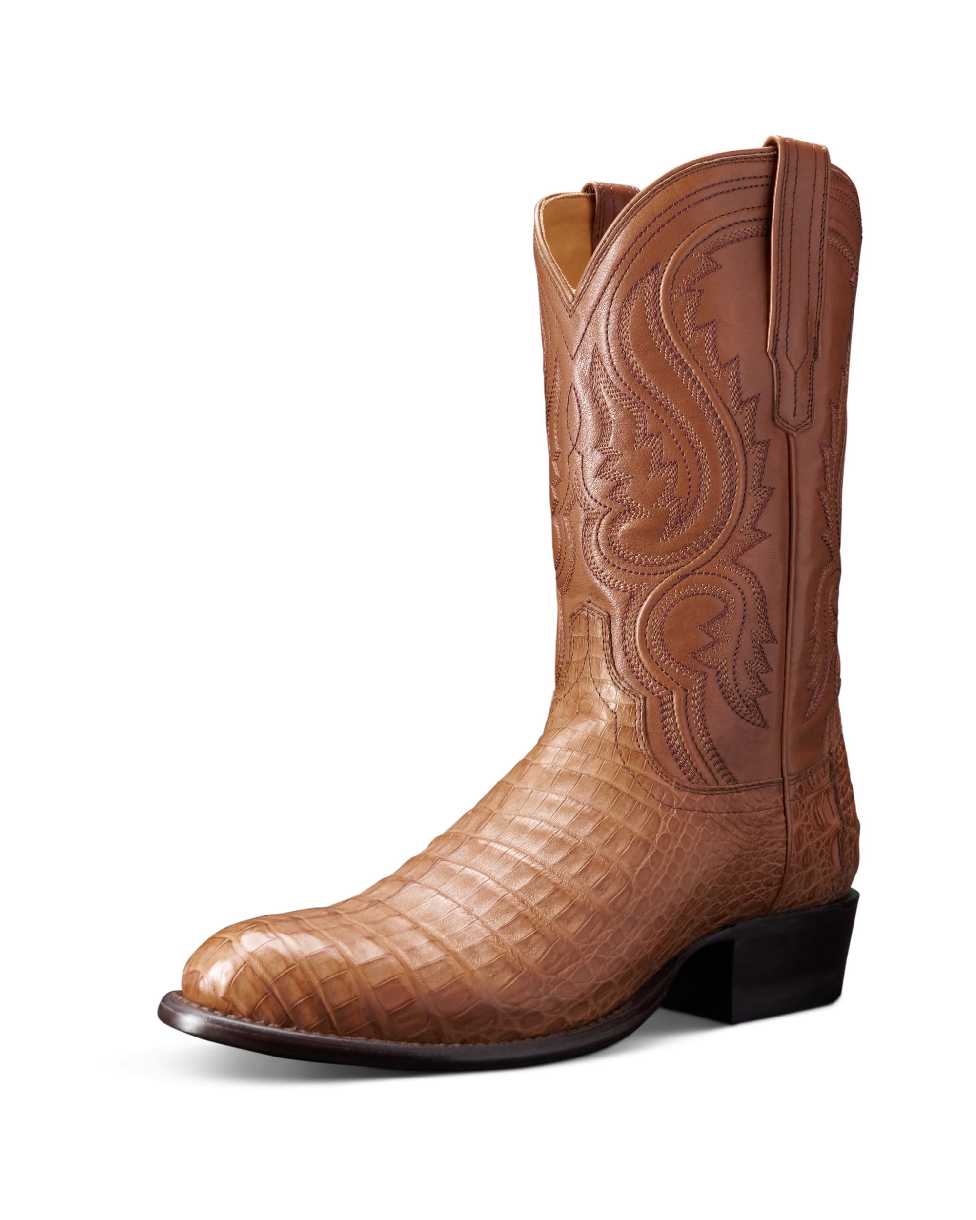 Part of the alligator family, caiman showcases statement-making scales that have a distinct depth of texture. Smaller than its larger brethren, there’s nuance and appeal aplenty in each unique hide. Exotic boots are an investment, and caiman is a wise one, with the durability to become a future heirloom with proper care.