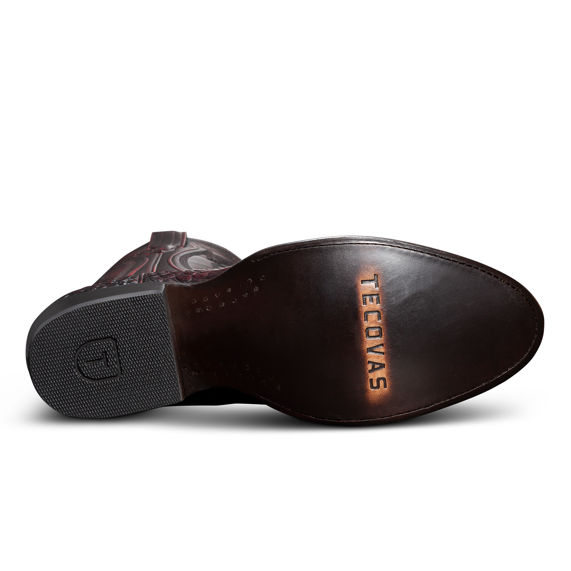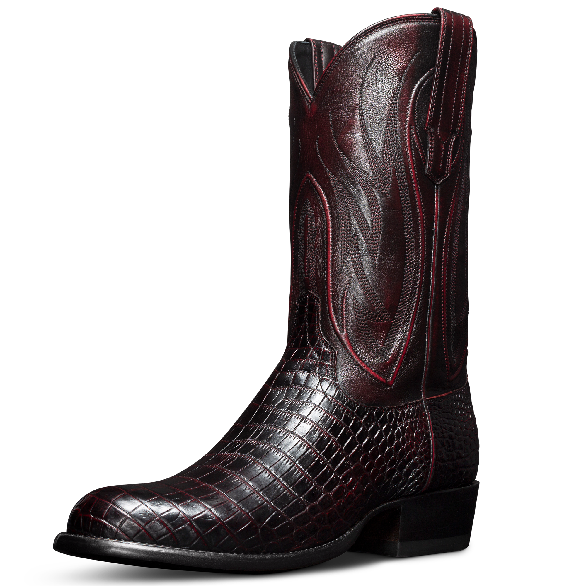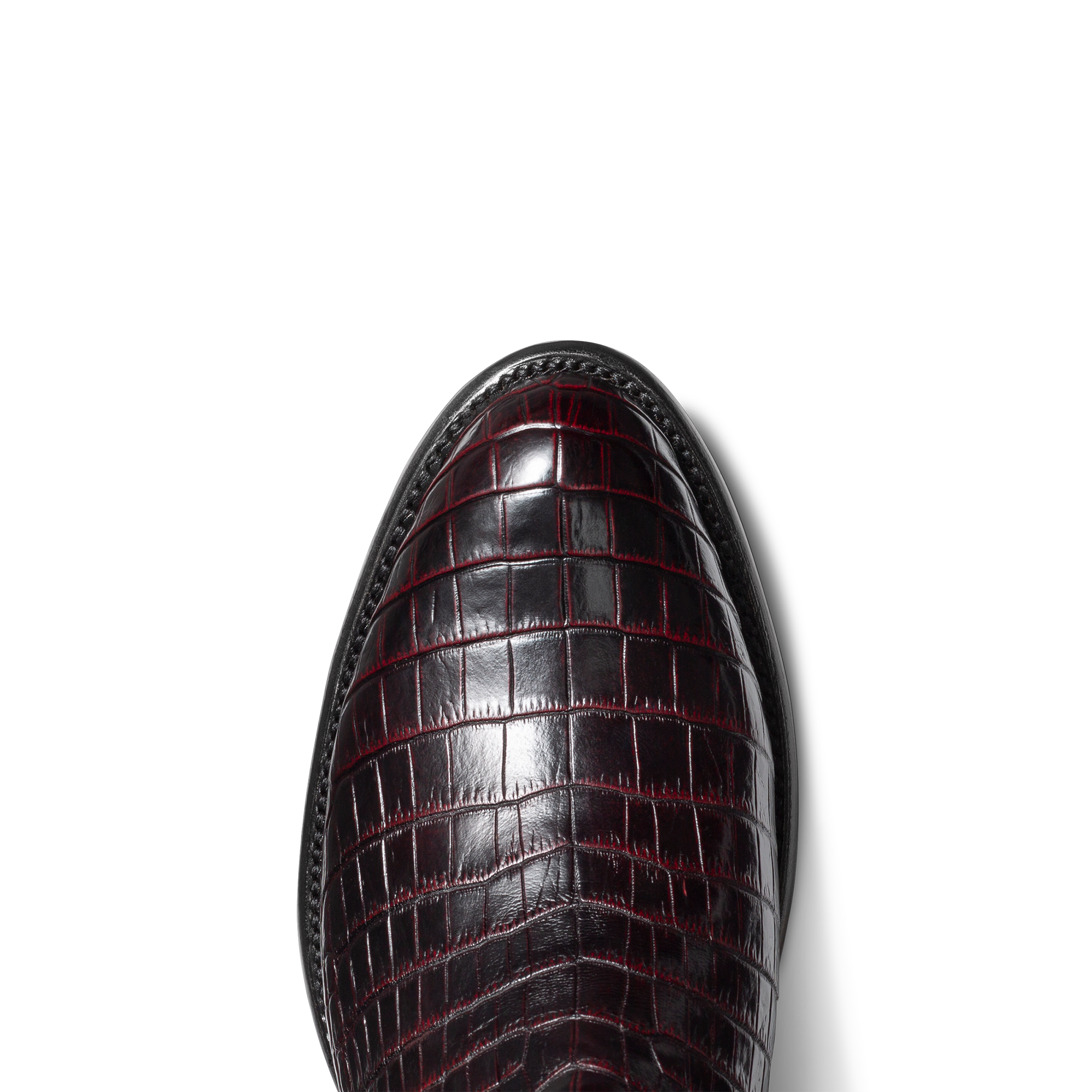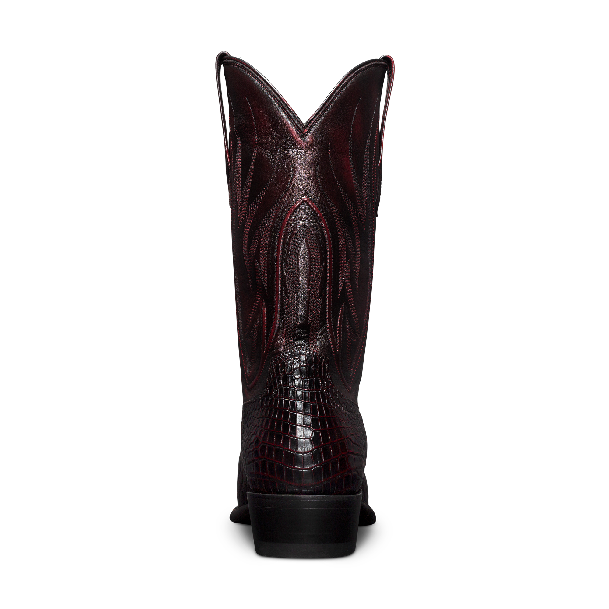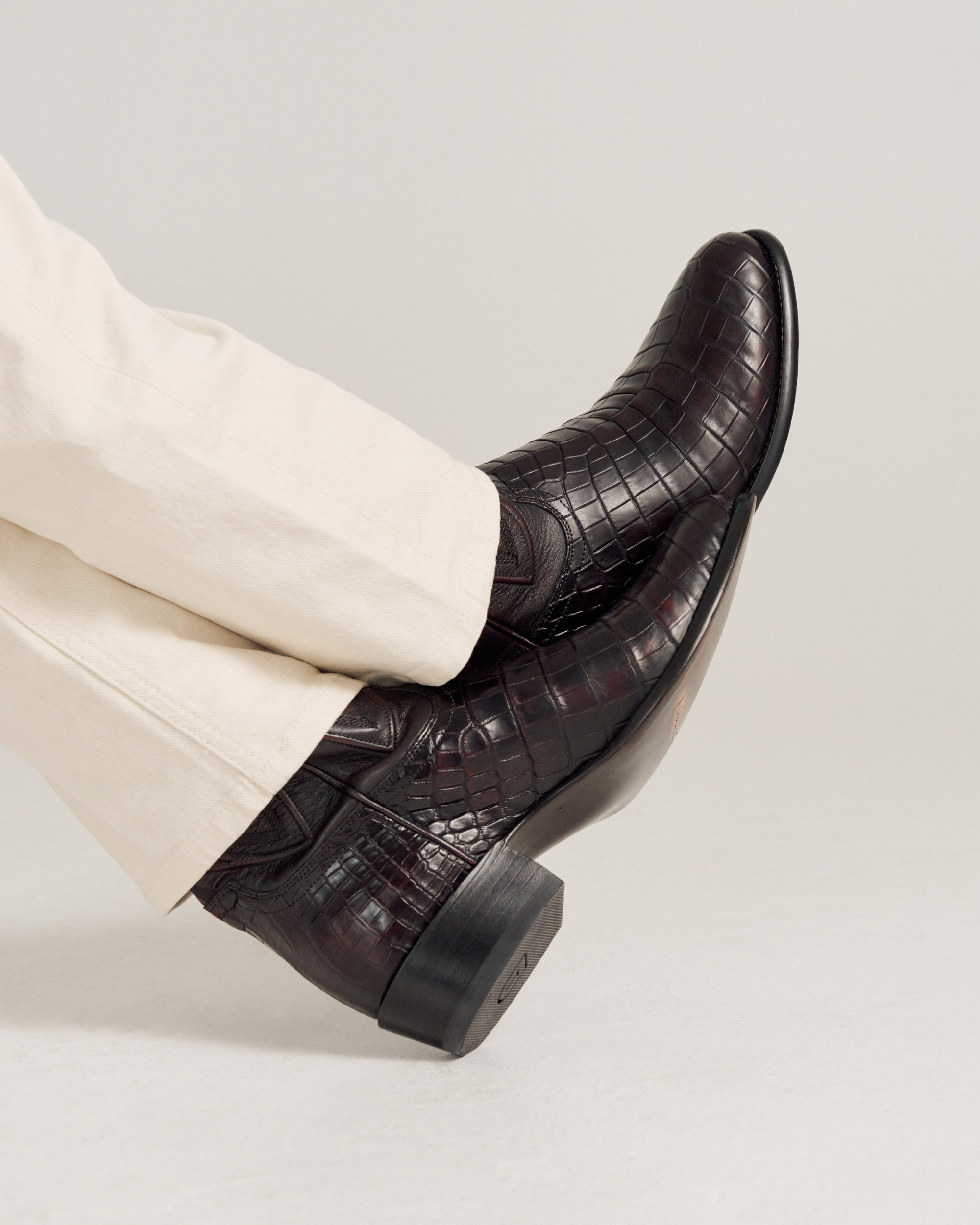 Both daring and dashing, striking natural detailing of belly-cut Nile crocodile reaches new depths of character in The Cooper’s Black Cherry finish. Pure cowboy with an elegant edge, as you put The Cooper through its paces, its dark finish will wear away to reveal deep cherry undertones. What’s more, its brushoff cowhide shaft and unique thread and cording pattern deliver complexity and character that’s a worthy complement to the vamp and shaft.